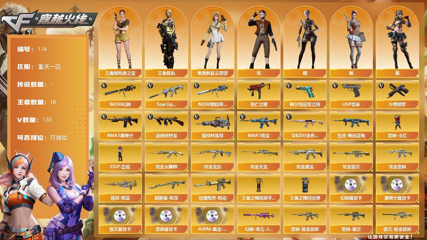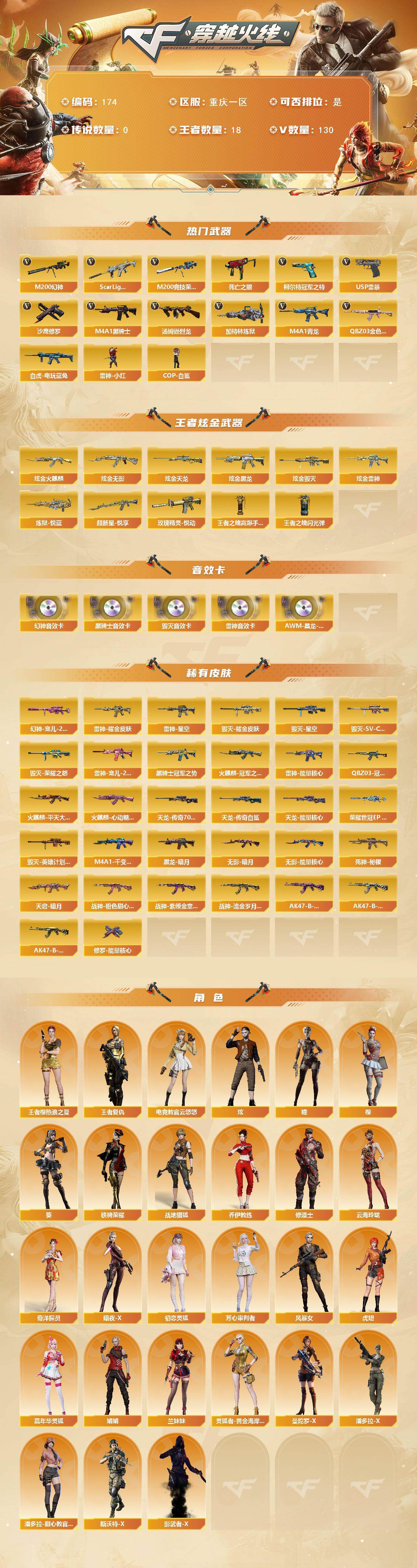 [13980366]重庆一区-130V-18王者-7炫金 【热门武器】:QBZ03-金色蔷薇*2,Scar Light-白虎,M4A1-青龙,M200-幻神,M200-竞技荣光,死亡之眼*5,白虎-电玩蓝兔,柯尔特-冠军之特,M4A1-黑骑士*3,汤姆逊-烈龙*3,加特林-炼狱*2,雷神-小红,COP-白鲨*2,USP-雷暴,沙鹰-修罗*5 【王者炫金武器】:超新星-悦享*2,玫瑰精灵-悦动,炼狱-悦蓝*2,炫金火麒麟,炫金无影,炫金黑龙,炫金雷神,炫金毁灭,炫金天龙*2,王者之魄高爆手雷*2,王者之魄闪光弹*2 【音效卡】:M200-幻神音效卡,M4A1-雷神音效卡,M4A1-黑骑士音效卡,Barrett-毁灭音效卡,AWM-昌龙-怀旧音效卡 【皮肤】:幻神-宠儿-2021MVP,幻神-荣耀世冠EP 皮肤,QBZ03-冠军之薇,雷神-能量核心*3,雷神-星空,雷神-耀金皮肤,雷神-宠儿-2019MVP,火麒麟-冠军之心,火麒麟-平天大圣,火麒麟-心动糖果,毁灭-荣耀之怒,毁灭耀金皮肤,毁灭-星空,毁灭-SV-CFPLS16冠军,毁灭-英雄计划 皮肤,M4A1-千变-孔明皮肤,黑龙-暗月,黑骑士-冠军之势,无影-暗月,无影-能量核心,死神-秘银,天启-暗月*2,战神-粉色甜心皮肤,战神-紫绶金章皮肤*2,战神-流金岁月皮肤*2,AK47-B-常胜将军-曹操,AK47-B-常胜将军-刘备*2,AK47-B-常胜将军-孙权*3,天龙-能量核心,AWM-天龙-传奇70KG,AWM-天龙-传奇白鲨,修罗-能量核心 【角色】:葵,樱,瞳,炫,电竞教官-云悠悠,妮妮,战地猎狐,王者樱-热浪之夏,王者复仇,奇洋探员,乔伊教练,修道士,云海玲珑,暗夜-X,初恋灵狐,芳心审判者,风暴女,虎妞,嘉年华灵狐,娟娟,兰妹妹,灵狐者-黄金海岸,曼陀罗-X,潘多拉-X,潘多拉-甜心教官,斯沃特-X,铁骑荣耀,影武者-X 【人偶武器】:雷神-小红,COP-白鲨*2,AWM-灵狐-15周年嘉年华,COP-旗袍,迷你深渊冰龙,迷你裂空之翼,迷你波特博士*4,夺魂,迷你火种*2,生化手雷-机甲核心,闪光弹-貂蝉,高爆手雷-大乔,迷你艾比,迷你超能女侍 【暴走生化】:死亡之眼*5,超级对讲机 【挑战大师】:AK47-冰龙粉碎者,冰龙粉碎者-白马银枪*2,激光毁灭者III,试炼破坏者III 【英雄级武器】:AK47-火麒麟