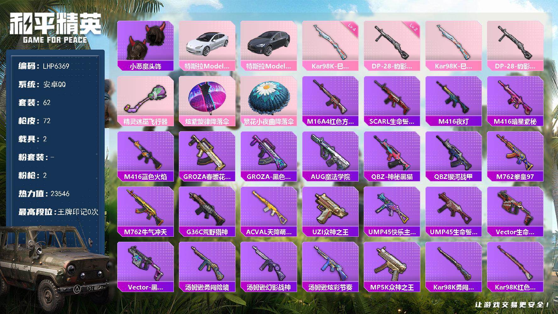 [13981468]可二次【店主推荐捡漏号!可直接换绑】 安卓 手Q-2特效枪-2载具-1粉色飞行器-2.3w热力值-1王牌印记-62套装-72枪皮【热门品类】:小恶魔头饰【粉色载具】:特斯拉Model 3(珍珠白),特斯拉Model X(冷光银)【粉色枪皮等级】:Kar98K-巳巳如意(四级),DP-28-豹影疾电(二级)【粉色枪皮】:Kar98K-巳巳如意,DP-28-豹影疾电【粉色飞行器】:精灵迷巫飞行器