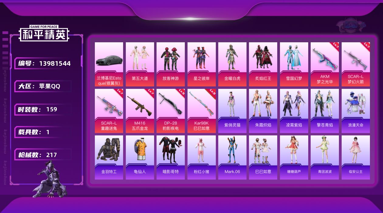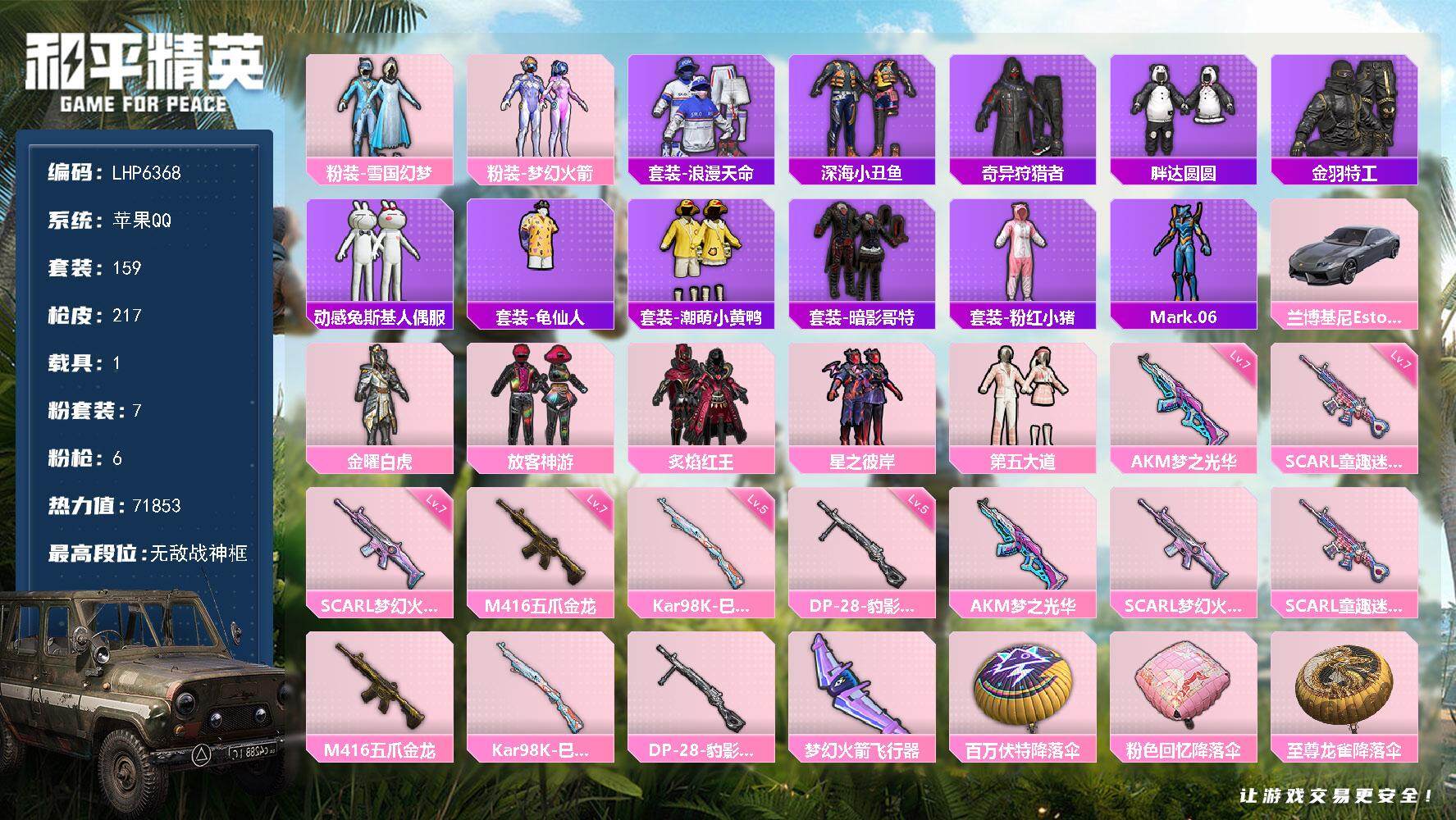 [13981544]【店主推荐捡漏号!可直接换绑】/素材身法号/无敌战神框1/绝世印记1地铁满天赋/ 苹果 手Q-无敌战神框-7粉装-6特效枪-1载具-1粉色飞行器-7.1w热力值-16王牌印记-159套装-217枪皮【热门品类】:粉装-雪国幻梦,粉装-梦幻火箭,套装-浪漫天命,套装-深海小丑鱼,套装-奇异狩猎者,套装-胖达圆圆,套装-金羽特工,套装-动感兔斯基人偶服,套装-龟仙人,套装-潮萌小黄鸭,套装-暗影哥特,套装-粉红小猪,角色-Mark.06【粉色载具】:兰博基尼Estoque(银翼灰)【粉色套装】:粉装-金曜白虎,粉装-雪国幻梦,粉装-梦幻火箭,粉装-放客神游,粉装-炙焰红王,粉装-星之彼岸,粉装-第五大道【粉色枪皮等级】:AKM-梦之光华(七级),SCAR-L-梦幻火箭(七级),SCAR-L-童趣迷兔(七级),M416-五爪金龙(七级),Kar98K-巳巳如意(五级),DP-28-豹影疾电(五级)【粉色飞行器】:梦幻火箭飞行器