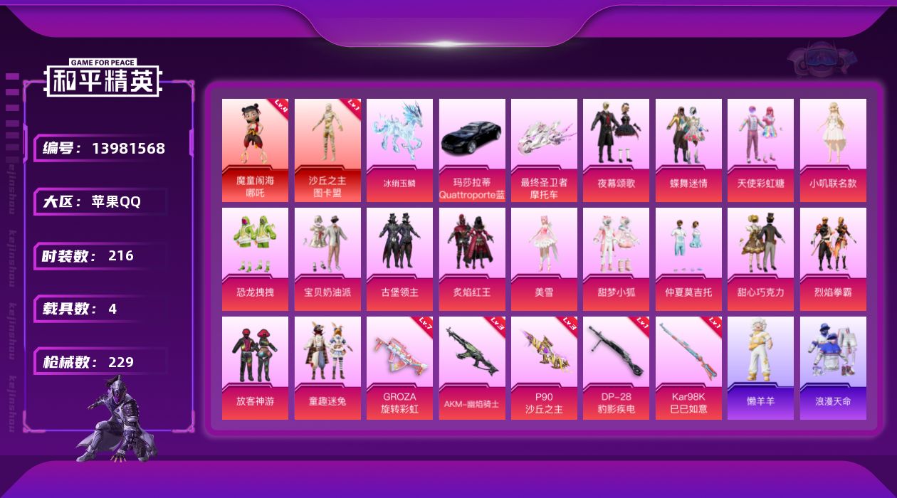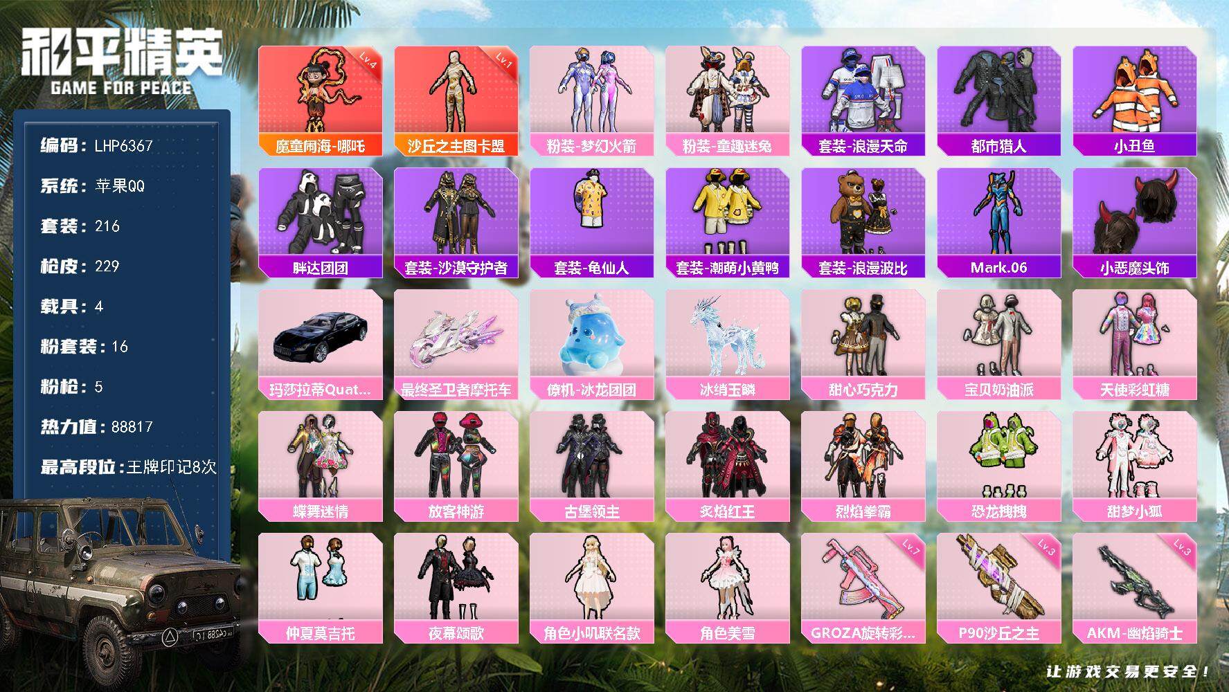 [13981568]可二次【店主推荐捡漏号!可直接换绑】素材身法号 /魔童闹海-哪吒(四级)苹果 手Q-2神装-16粉装-5特效枪-4载具-8粉色飞行器-8.8w热力值-8王牌印记-216套装-229枪皮【红色神装等级】:魔童闹海-哪吒(四级),沙丘之主-图卡盟(一级)【热门品类】:粉装-梦幻火箭,粉装-童趣迷兔,套装-浪漫天命,套装-都市猎人,套装-小丑鱼,套装-胖达团团,套装-沙漠守护者,套装-龟仙人,套装-潮萌小黄鸭,套装-浪漫波比,角色-Mark.06,小恶魔头饰【粉色载具】:玛莎拉蒂Quattroporte(夜幕蓝),最终圣卫者摩托车,僚机-冰龙团团,冰绡玉鳞【粉色套装】:粉装-甜心巧克力,粉装-宝贝奶油派,粉装-天使彩虹糖,粉装-蝶舞迷情,粉装-梦幻火箭,粉装-放客神游,粉装-古堡领主,粉装-童趣迷兔,粉装-炙焰红王,粉装-烈焰拳霸,粉装-恐龙拽拽,粉装-甜梦小狐,粉装-仲夏莫吉托,粉装-夜幕颂歌,角色-小叽联名款,角色-美雪【粉色枪皮等级】:AKM-幽焰骑士(三级),GROZA-旋转彩虹(七级),P90-沙丘之主(三级),Kar98K-巳巳如意(一级),DP-28-豹影疾电(一级)【粉色飞行器】:梦幻火箭飞行器,夜幕颂歌飞行器,沙丘之主天马,霓虹漫游飞行器,深渊漩涡飞行器,圣域金龙飞行器,飞天猪飞行器,灵珠游龙飞行器
