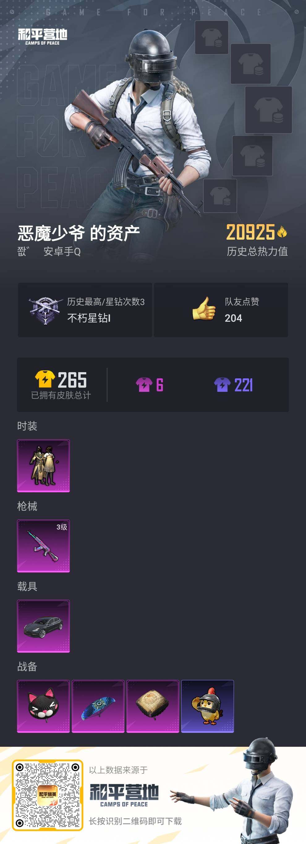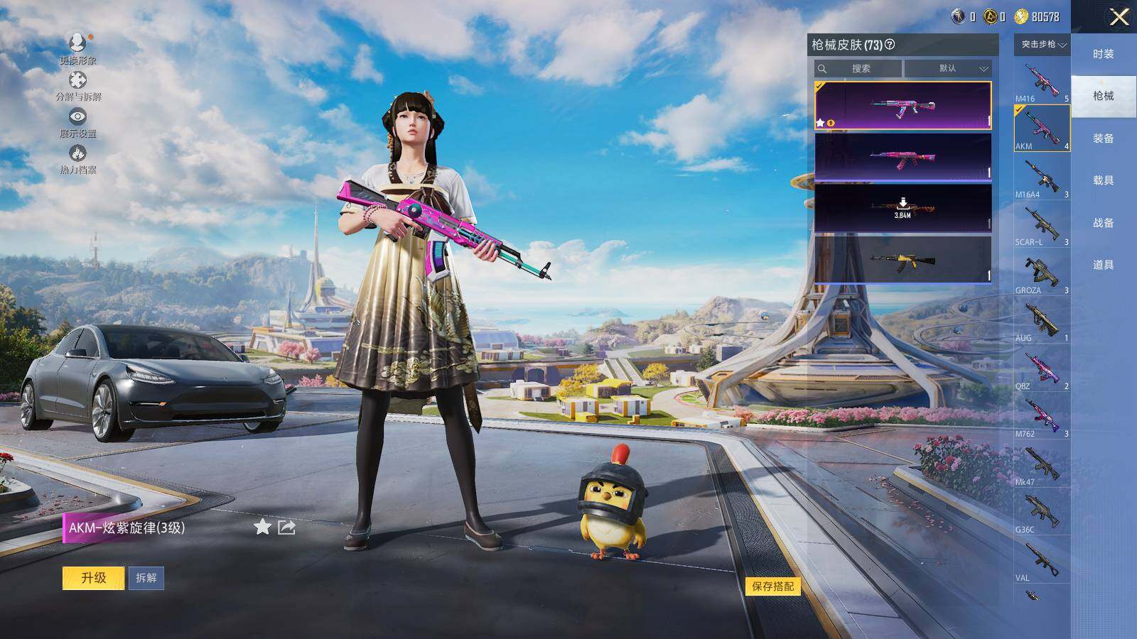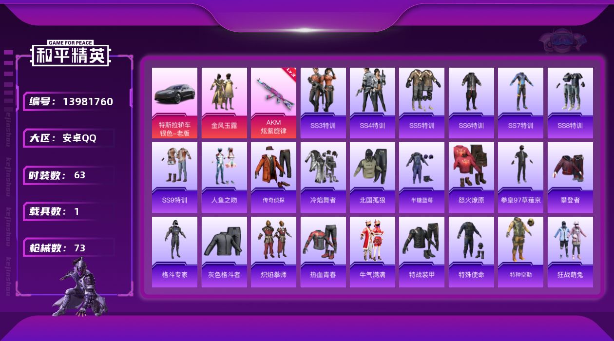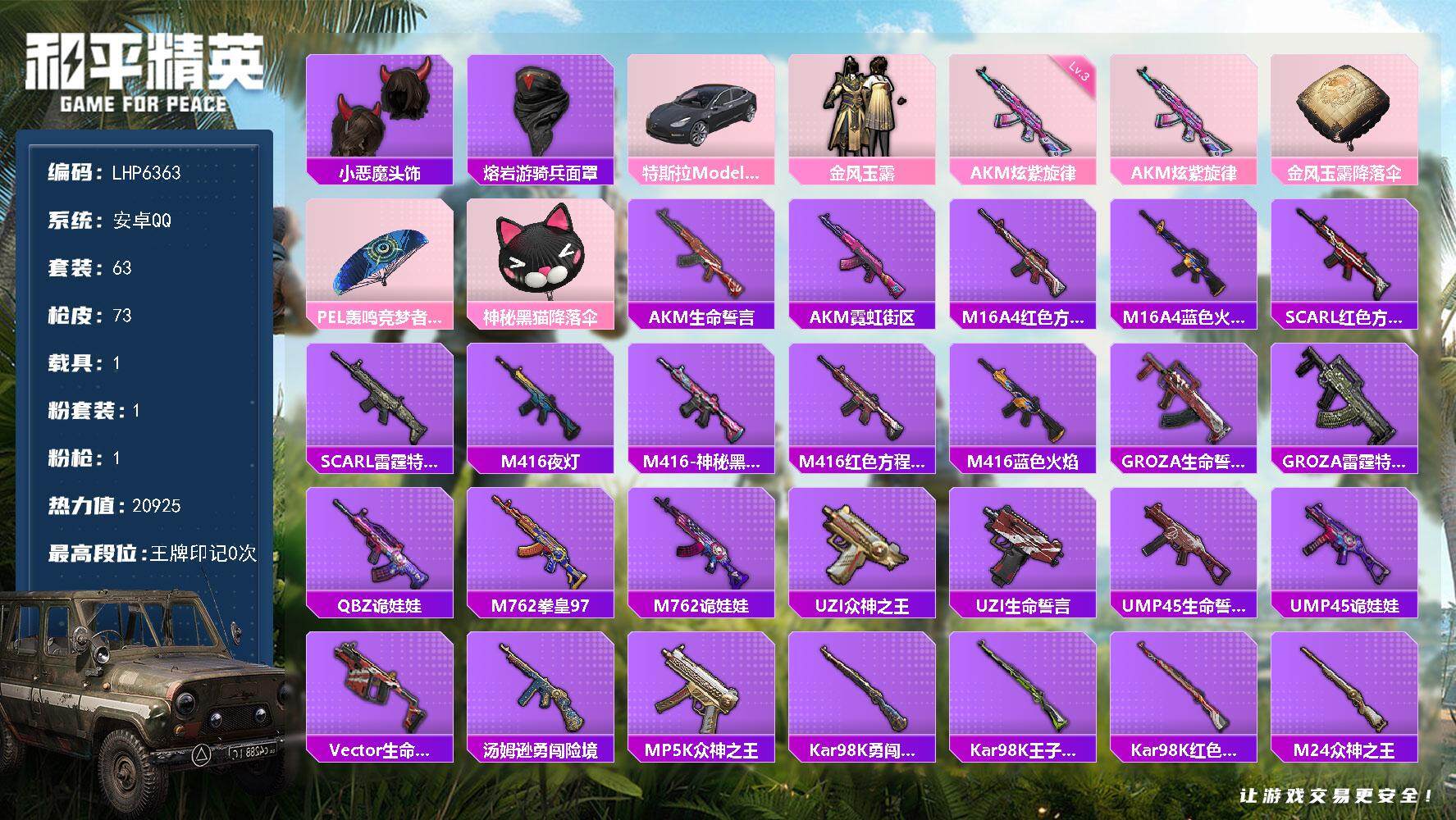 [13981760]可二次【店主推荐捡漏号!可直接换绑】 安卓 手Q-1粉装-1特效枪-1载具-2w热力值-2王牌印记-63套装-73枪皮【热门品类】:小恶魔头饰,熔岩游骑兵面罩【粉色载具】:特斯拉Model 3(冷光银)【粉色套装】:粉装-金风玉露【粉色枪皮等级】:AKM-炫紫旋律(三级)