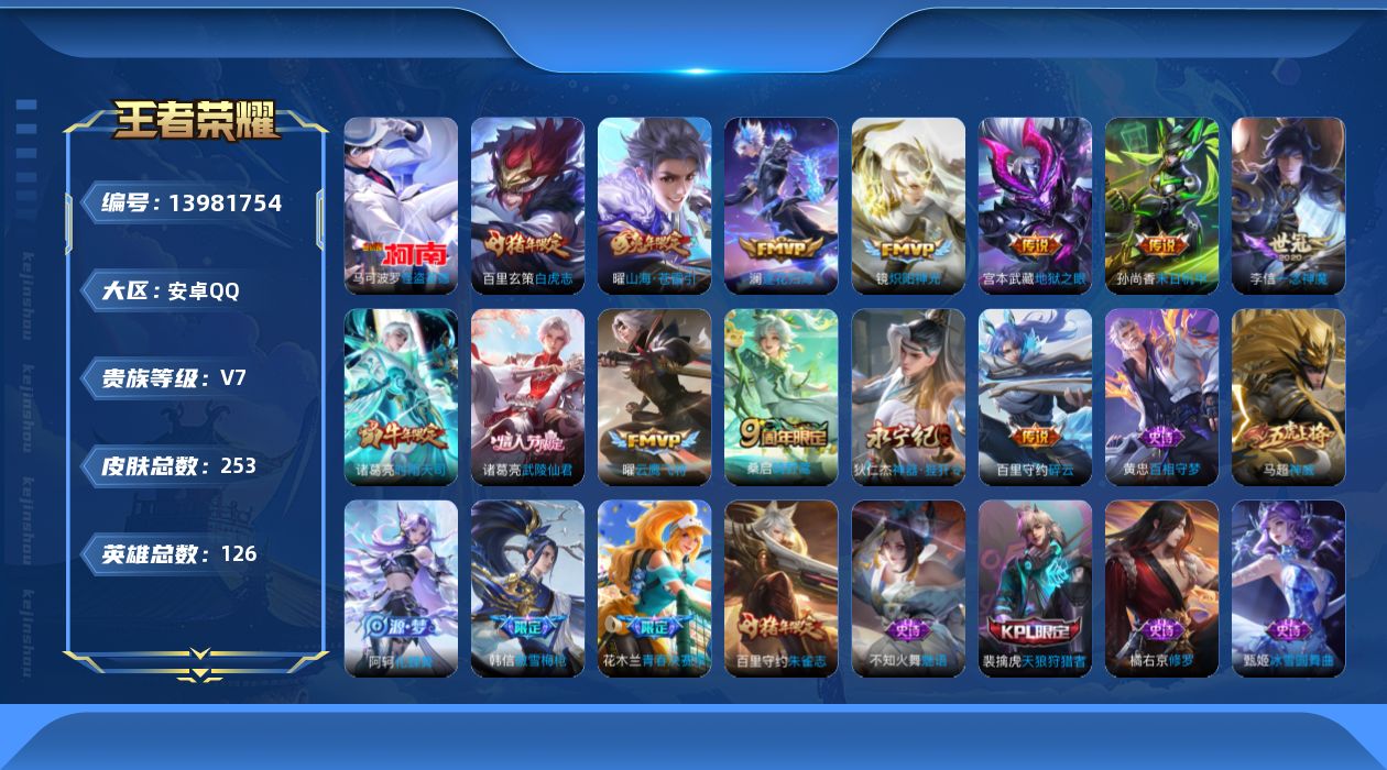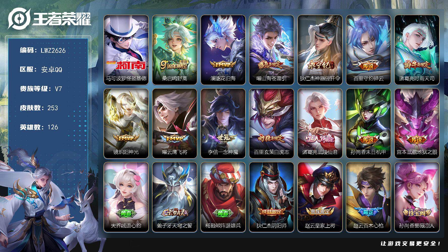 [13981754]【店主推荐捡漏号!可直接换绑】安卓Q-V7-最强王者段位-126英雄-253皮肤-1珍品传说-13传说-70史诗