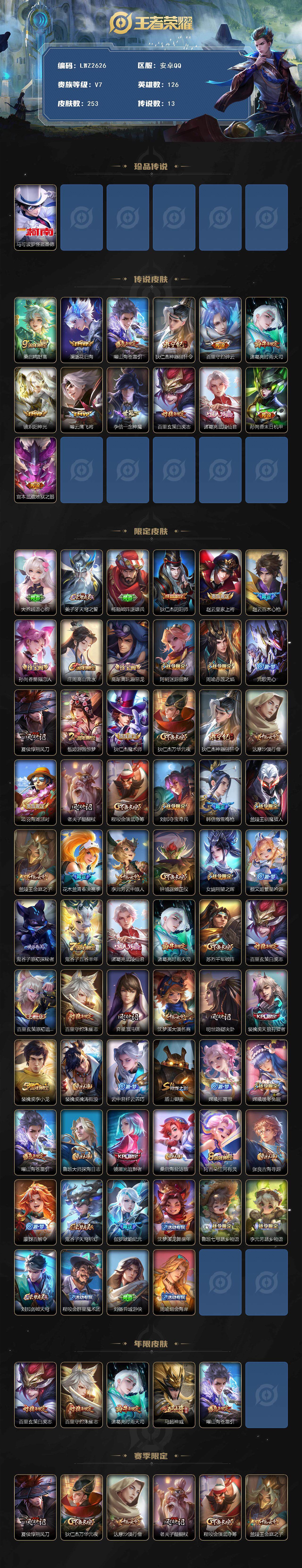 - PX_2094105-实名: 可修改 贵族等级: V7 英雄数: 125 皮肤数: 223 星传说: 未来机甲 传说皮: 炽阳神光,一念神魔,末日机甲-孙尚香,无双飞将,妄想实况 限定皮: 时雨天司,岱宗,蜜橘之夏,青龙志,至尊宝,武陵仙君,寅虎·赤拳,五谷丰年,诗剑行
