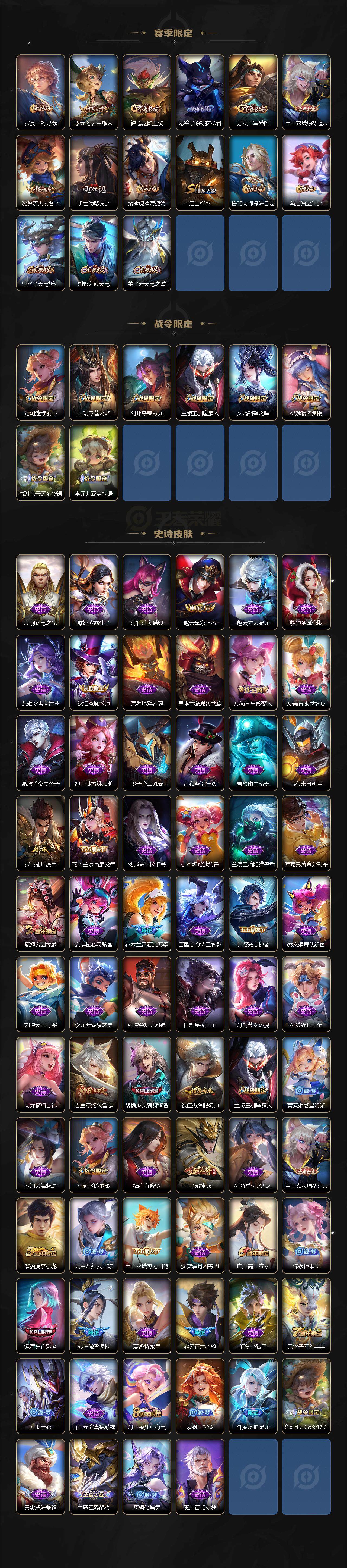 【赛季限定】:夏侯惇朔风刀,狄仁杰万华元夜,达摩沙漠行僧,老夫子醍醐杖,程咬金演武夺筹,兰陵王金庭之子,张良古海寻踪,李元芳云中旅人,钟馗驱傩正仪,鬼谷子原初探秘者,苏烈千军破阵,百里玄策原初追逐者,弈星混沌棋,沈梦溪大漠名商,明世隐疑决卦,裴擒虎擒涛扼浪,盾山御銮,鲁班大师探海日志,桑启海盐诗旅,鬼谷子天穹祈灯,刘邦剑破天穹,姜子牙天穹之誓