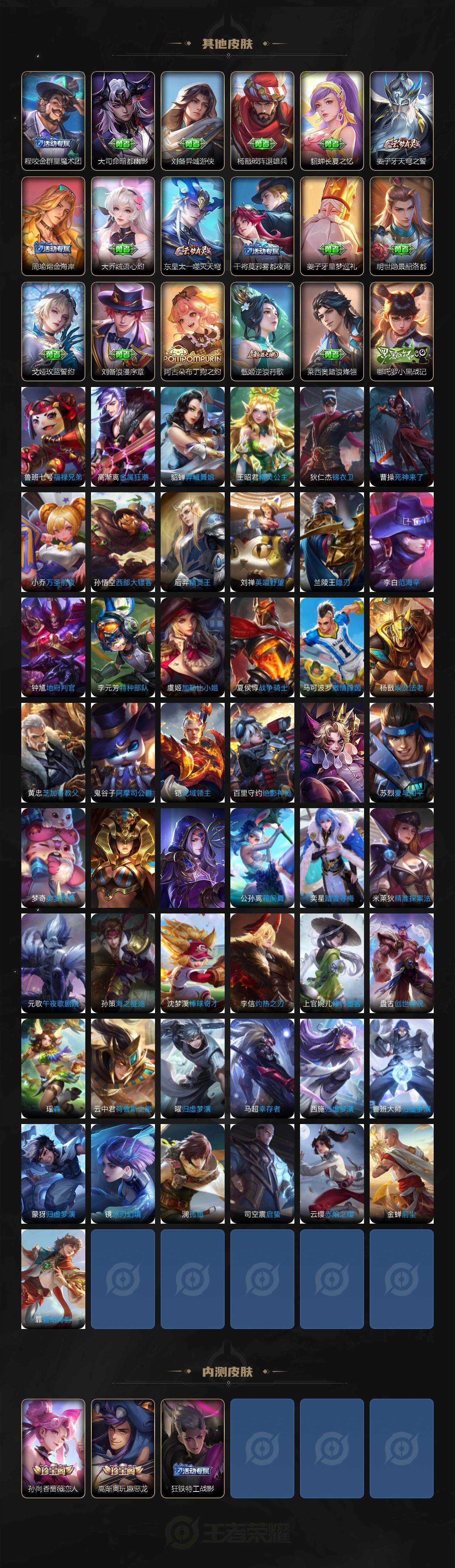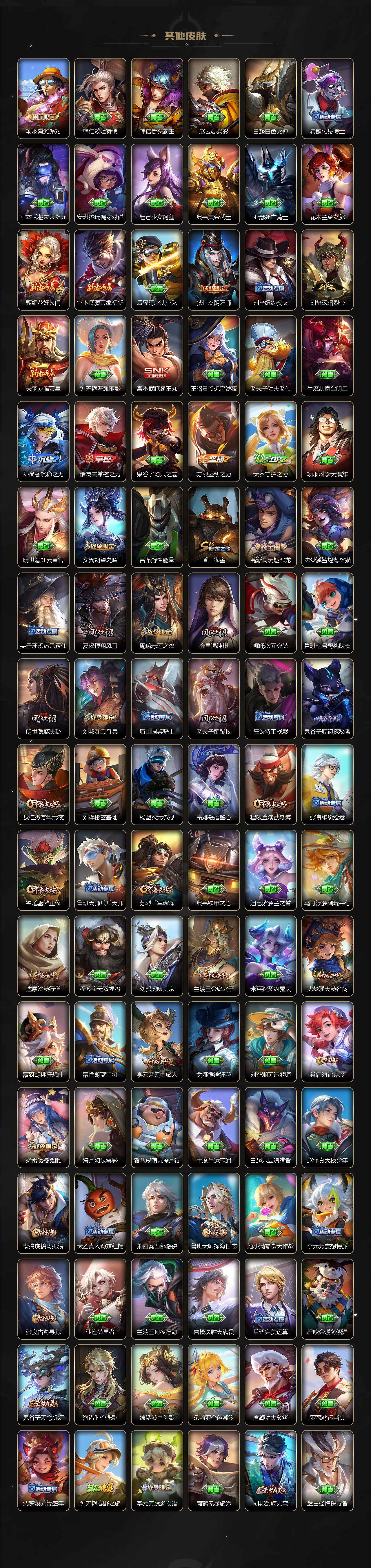 【限定皮肤】:大乔绒语心约,姜子牙天穹之誓,杨戬破阵退雄兵,狄仁杰阴阳师,赵云皇家上将,赵云百木心枪,孙尚香蔷薇恋人,庄周高山流水,高渐离玩趣恶龙,阿轲迷踪丽影,周瑜赤莲之焰,元歌无心,夏侯惇朔风刀,甄姬游园惊梦,狄仁杰魔术师,狄仁杰万华元夜,狄仁杰神器狴犴令,达摩沙漠行僧,项羽海滩派对,老夫子醍醐杖,程咬金演武夺筹,刘邦夺宝奇兵,韩信傲雪梅枪,兰陵王驯魔猎人,兰陵王金庭之子,花木兰青春决赛季,李元芳云中旅人,钟馗驱傩正仪,女娲朔望之晖,蔡文姬繁星吟游,鬼谷子原初探秘者,鬼谷子五谷丰年,诸葛亮武陵仙君,诸葛亮时雨天司,苏烈千军破阵,百里玄策白虎志,百里玄策原初追逐者,百里守约朱雀志,弈星混沌棋,沈梦溪大漠名商,明世隐疑决卦,裴擒虎天狼狩猎者,裴擒虎李小龙,裴擒虎擒涛扼浪,云中君纤云弄巧,盾山御銮,嫦娥拒霜思,嫦娥暖冬兔眠,曜山海苍雷引,鲁班大师探海日志,镜匿光追影者,桑启海盐诗旅,阿古朵江河有灵,张良古海寻踪,蒙犽百解令,鬼谷子天穹祈灯,伽罗琥珀纪元,沈梦溪龙舞盛年,鲁班七号蔬乡物语,李元芳蔬乡物语,刘邦剑破天穹,程咬金群星魔术团,刘备异域游侠,周瑜熔金海岸