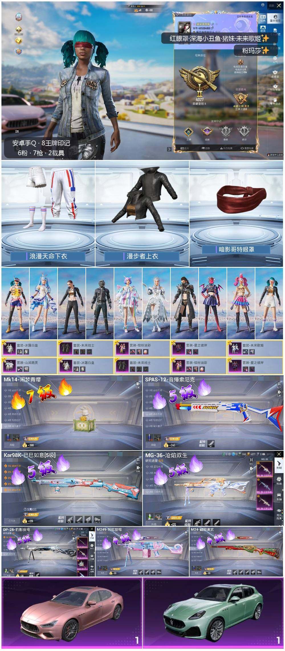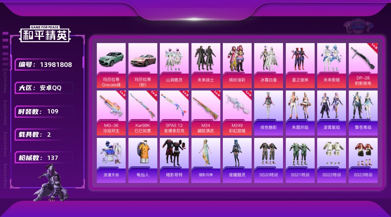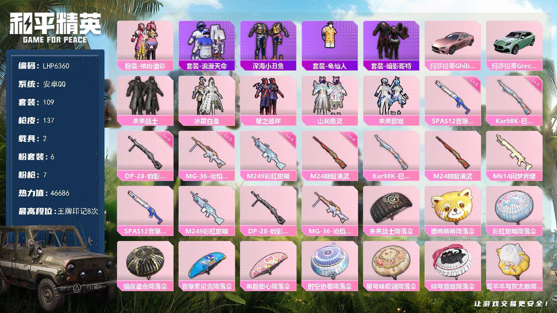 [13981808]【店主推荐捡漏号!可直接换绑】/素材身法号/扭蛋碎片531/地铁满天赋 安卓 手Q-6粉装-7特效枪-2载具-1粉色飞行器-4.6w热力值-8王牌印记-109套装-137枪皮【热门品类】:粉装-缤纷油彩,套装-浪漫天命,套装-深海小丑鱼,套装-龟仙人,套装-暗影哥特【粉色载具】:玛莎拉蒂Ghibli(粉),玛莎拉蒂Grecale(薄荷绿)【粉色套装】:粉装-未来战士,粉装-缤纷油彩,粉装-冰霜白皇,粉装-星之彼岸,粉装-山涧鹿灵,粉装-未来歌姬【粉色枪皮等级】:Kar98K-巳巳如意(五级),M24-翩跹演武(四级),SPAS-12-音爆索尼克(五级),M249-彩虹甜喵(四级),DP-28-豹影疾电(五级),MG-36-沧焰双生(五级)