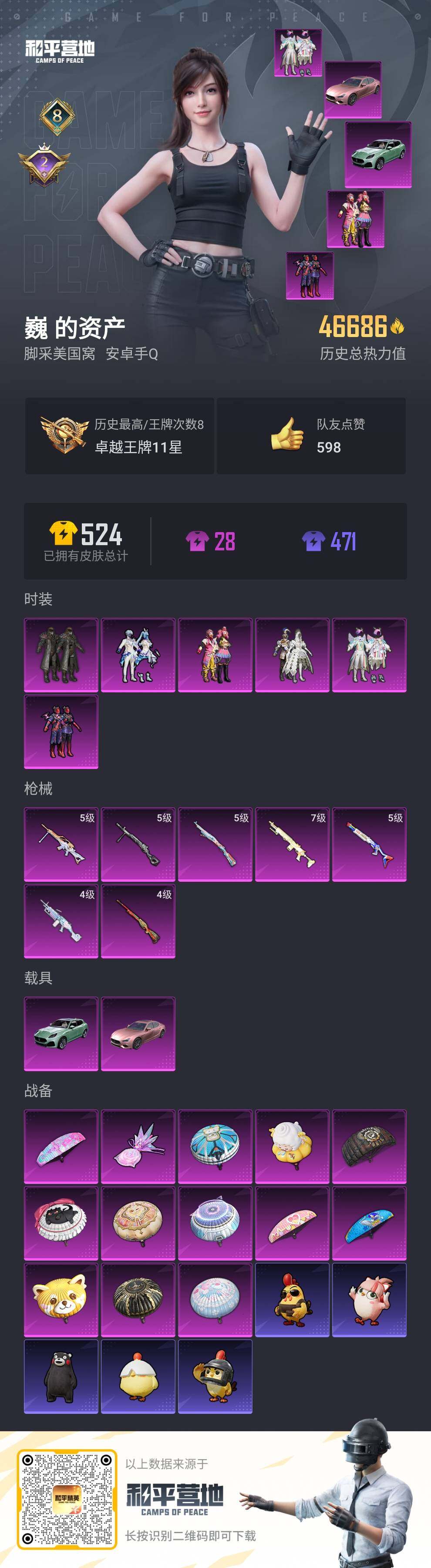 - PX_2106837- 安卓手Q-9王牌印记-12粉装-11特效枪-4载具-64833热力值-113套装-164枪皮-1卓越印记-0传奇印记 【12粉装】,雪国幻梦,梦幻火箭,宝贝奶油派,天使彩虹糖,羊梦糖心,翎光蝶翼,极致幻想,暗夜玫瑰,甜蜜誓约,金属狂野,静灵氛围,星梦奇缘 【11特效枪】AKM-甜心宝贝-7级 AKM-炫紫旋律-1级 AKM-梦之光华-1级 SCAR-L-梦幻火箭-6级 SC