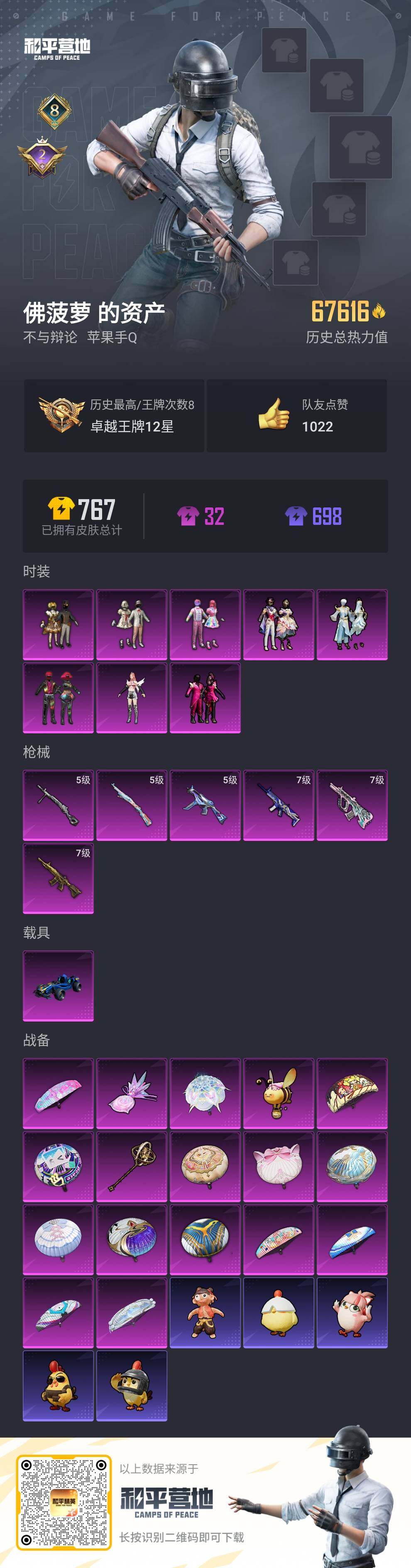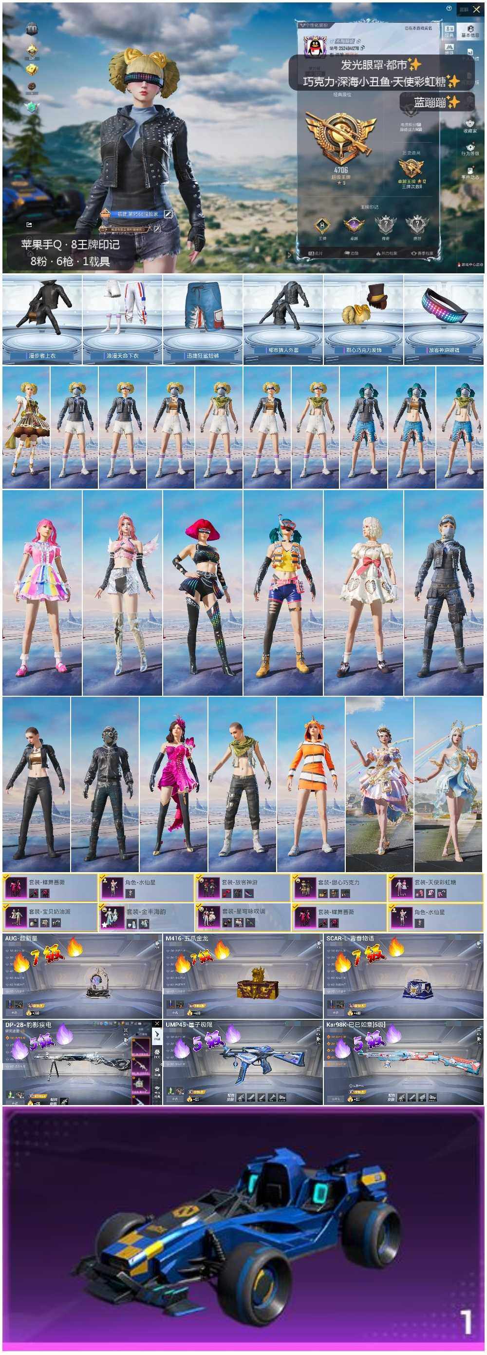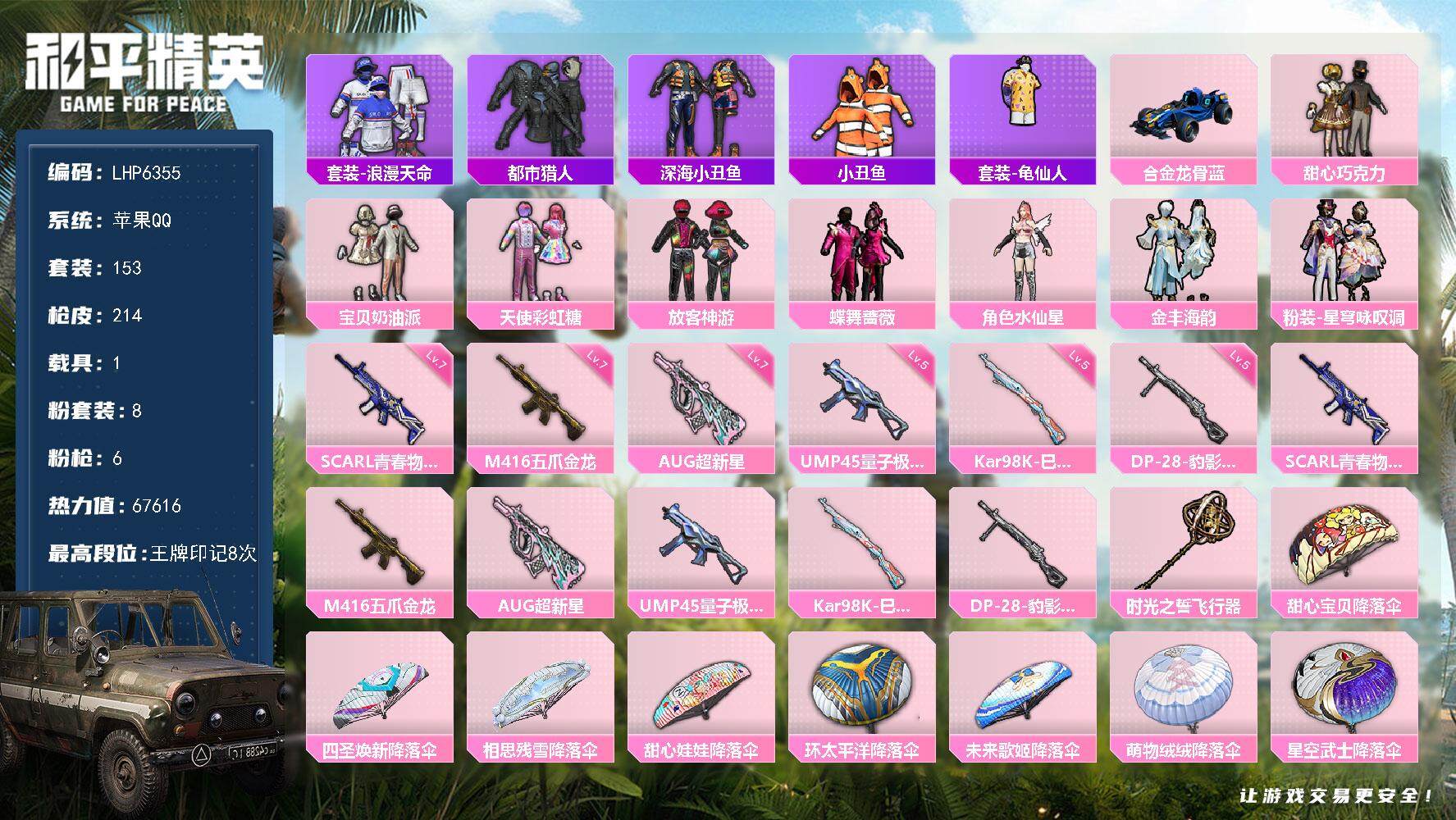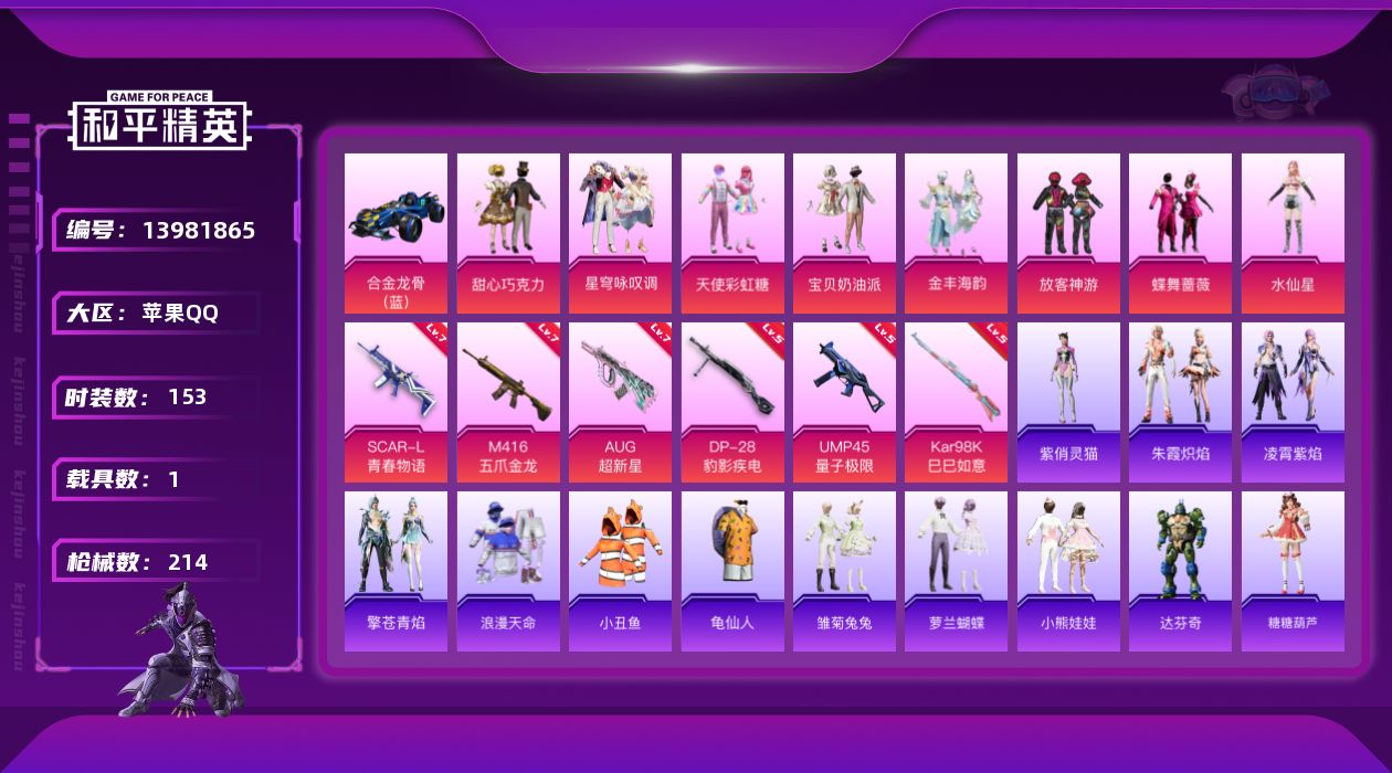 [13981865]【店主推荐捡漏号!可直接换绑】素材身法号/地铁满天赋 苹果 手Q-8粉装-6特效枪-1载具-3粉色飞行器-6.7w热力值-8王牌印记-153套装-214枪皮【热门品类】:套装-浪漫天命,套装-都市猎人,套装-深海小丑鱼,套装-小丑鱼,套装-龟仙人【粉色载具】:合金龙骨(蓝)【粉色套装】:粉装-甜心巧克力,粉装-宝贝奶油派,粉装-天使彩虹糖,粉装-放客神游,粉装-蝶舞蔷薇,角色-水仙星,粉装-金丰海韵,粉装-星穹咏叹调【粉色枪皮等级】:SCAR-L-青春物语(七级),M416-五爪金龙(七级),AUG-超新星(七级),UMP45-量子极限(五级),Kar98K-巳巳如意(五级),DP-28-豹影疾电(五级)【粉色飞行器】:时光之誓飞行器