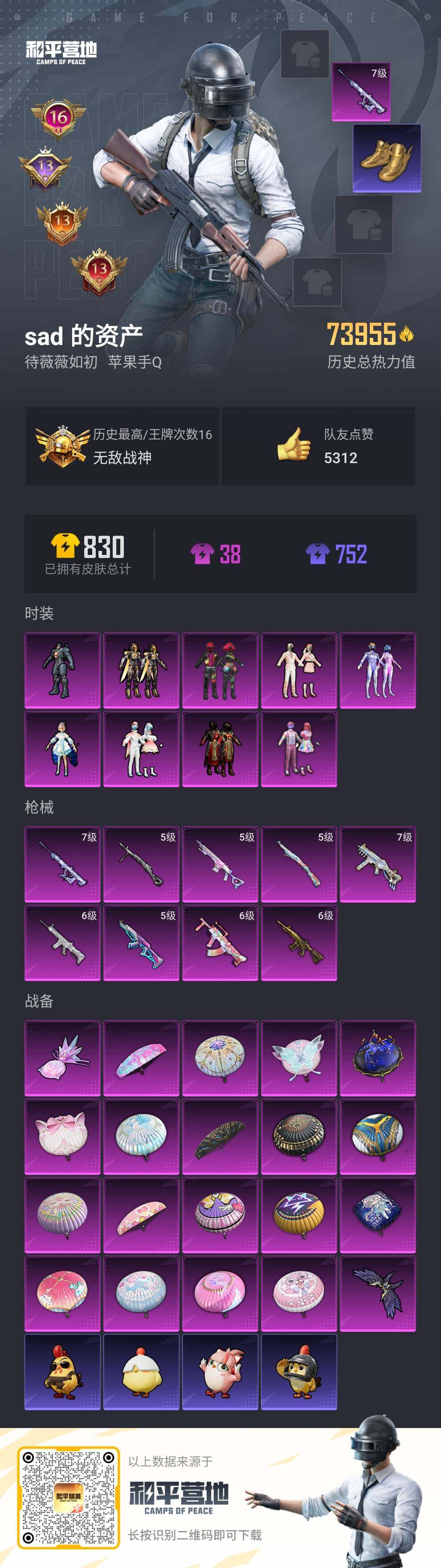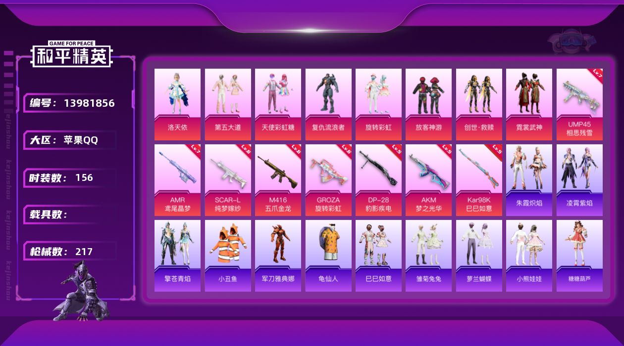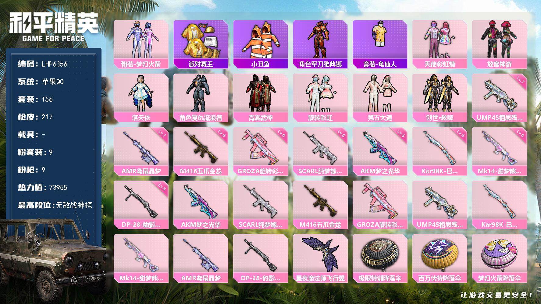 [13981856]【店主推荐捡漏号!可直接换绑】/素材身法号/无敌战神框1/绝世印记13/地铁满天赋 苹果 手Q-无敌战神框-9粉装-9特效枪-0载具-2粉色飞行器-7.3w热力值-16王牌印记-156套装-217枪皮【热门品类】:粉装-梦幻火箭,套装-派对舞王,套装-小丑鱼,角色-军刀雅典娜,套装-龟仙人【粉色套装】:粉装-天使彩虹糖,粉装-梦幻火箭,粉装-放客神游,角色-洛天依,角色-复仇流浪者,粉装-霓裳武神,粉装-旋转彩虹,粉装-第五大道,套装-创世·救赎【粉色枪皮等级】:AKM-梦之光华(五级),SCAR-L-纯梦嫁纱(六级),M416-五爪金龙(六级),GROZA-旋转彩虹(六级),UMP45-相思残雪(七级),Kar98K-巳巳如意(五级),Mk14-甜梦熊击(五级),AMR-鸢尾晶梦(七级),DP-28-豹影疾电(五级)【粉色飞行器】:星夜魔法师飞行翼