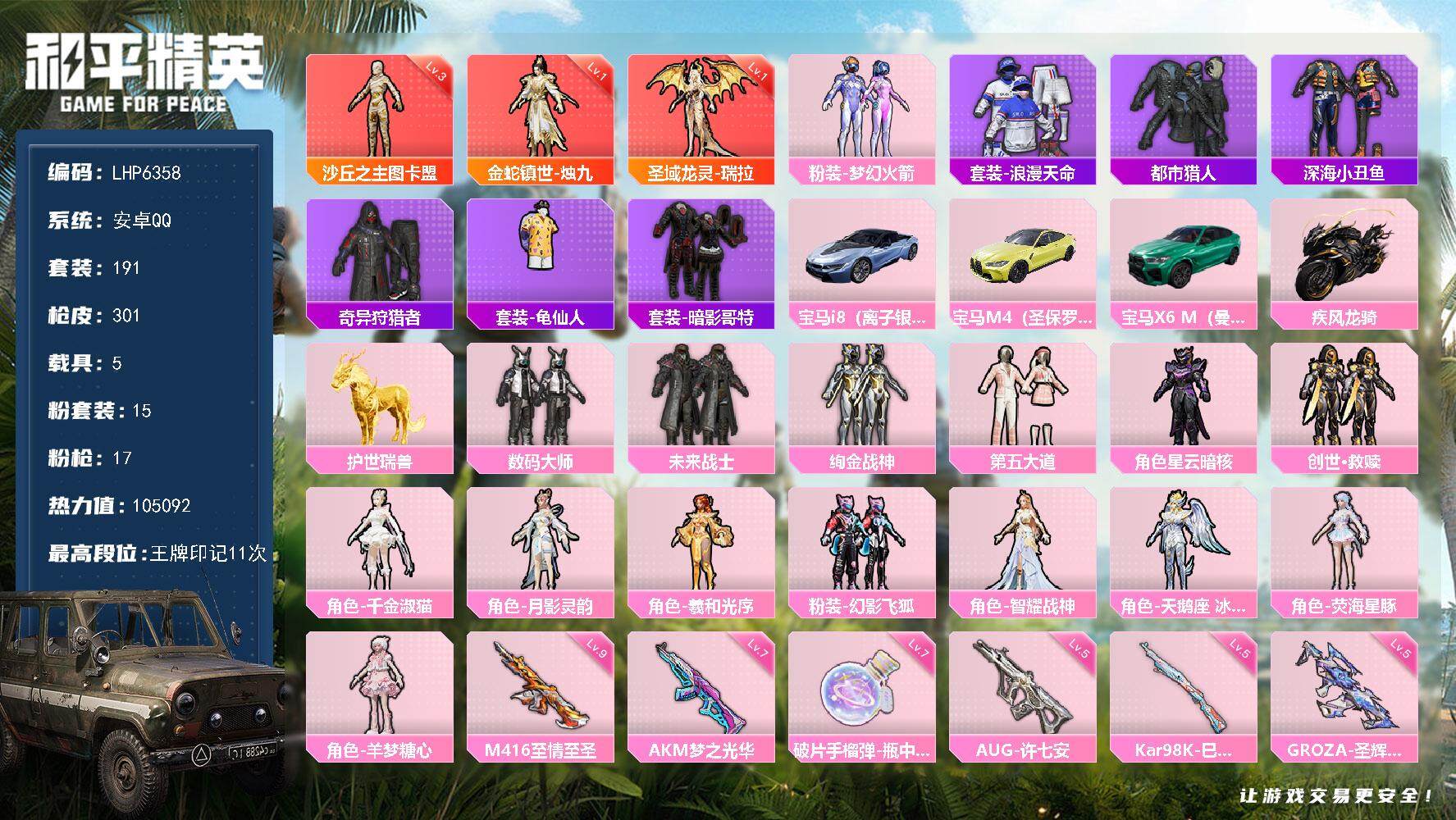 [13981848]可二次【店主推荐捡漏号!可直接换绑】/素材身法号/M416-至情至圣(九级)/地铁满天赋 安卓 手Q-3神装-15粉装-17特效枪-5载具-13粉色飞行器-10.5w热力值-11王牌印记-191套装-301枪皮【红色神装等级】:圣域龙灵-瑞拉(一级),金蛇镇世-烛九(一级),沙丘之主-图卡盟(三级)【热门品类】:粉装-梦幻火箭,套装-浪漫天命,套装-都市猎人,套装-深海小丑鱼,套装-奇异狩猎者,套装-龟仙人,套装-暗影哥特【粉色载具】:宝马i8(离子银),宝马M4(圣保罗黄),宝马X6 M(曼岛绿),疾风龙骑,护世瑞兽【粉色套装】:粉装-数码大师,粉装-未来战士,粉装-梦幻火箭,粉装-绚金战神,粉装-第五大道,角色-星云暗核,套装-创世·救赎,角色-千金淑猫,角色-月影灵韵,角色-羲和光序,粉装-幻影飞狐,角色-智耀战神,角色-天鹅座 冰河,角色-荧海星豚,角色-羊梦糖心【粉色枪皮等级】:AKM-梦之光华(七级),SCAR-L-金蛇镇世(三级),M416-至情至圣(九级),M416-墨龙九天(三级),GROZA-圣辉之星(五级),AUG-许七安(五级),P90-沙丘之主(三级),Kar98K-创世·救赎(一级),Kar98K-巳巳如意(五级),Kar98K-圣域龙灵(二级),M24-镜域双华(二级),Mk14-盛世惊鸿(二级),SVD-月影灵韵(二级),DBS-幻影飞狐(四级),DP-28-豹影疾电(五级),平底锅-喜羊羊与灰太狼(三级),破片手榴弹-瓶中星球(七级)【粉色飞行器】:酣梦熊熊飞行器,梦幻火箭飞行器,黄族统领飞行器,沙丘之主天马,镜域双华-灵镜之阶,龙翔九天飞行器,幽焰列车飞行器,凤舞九天飞行器,万象金身飞行器,月星之子飞行器,圣域金龙飞行器