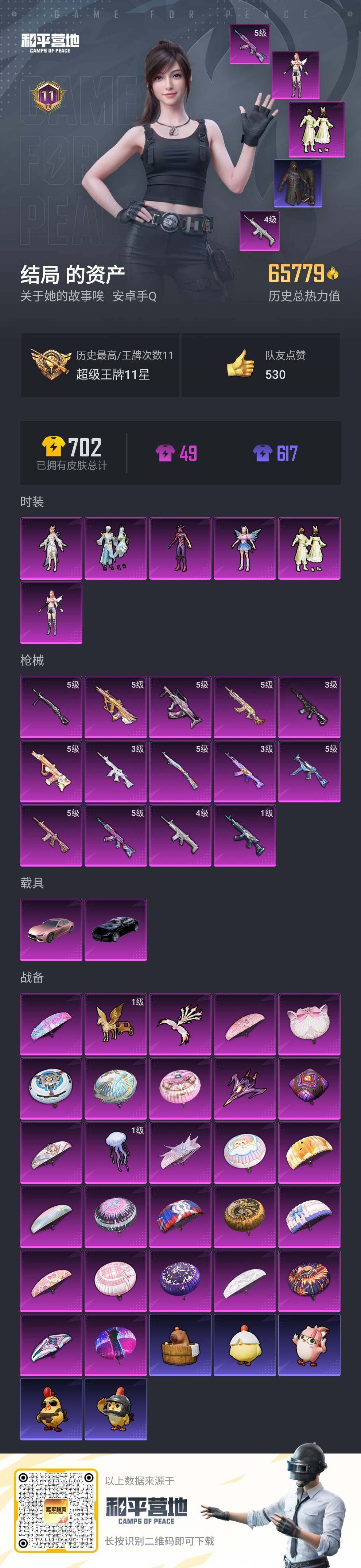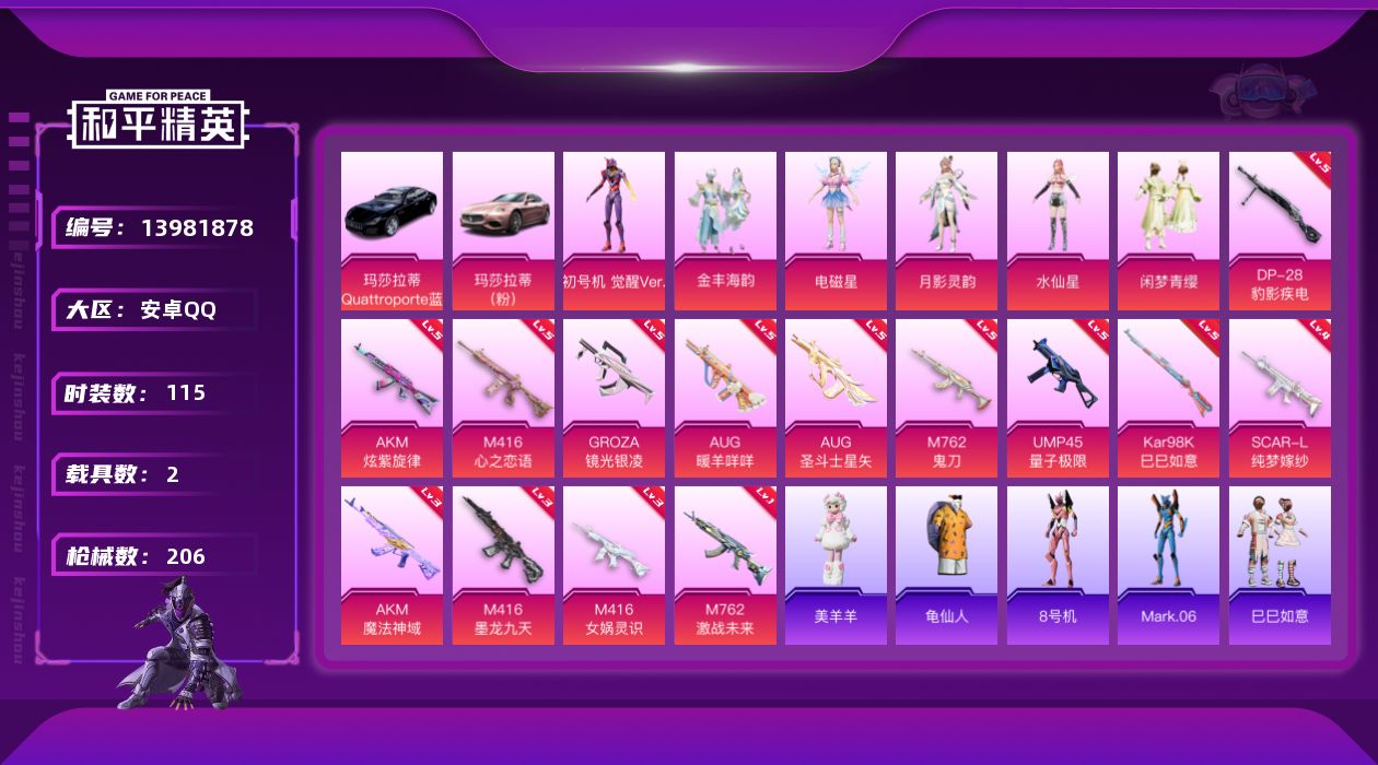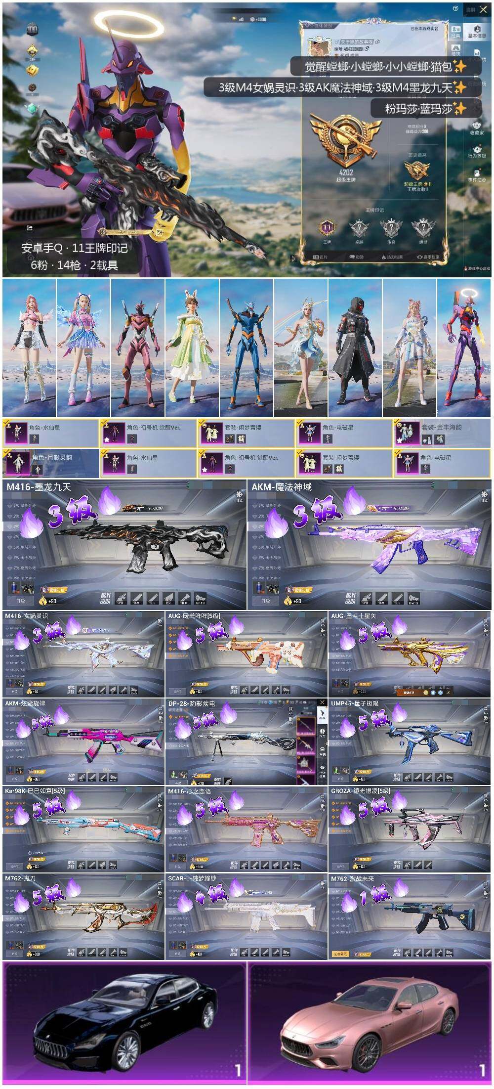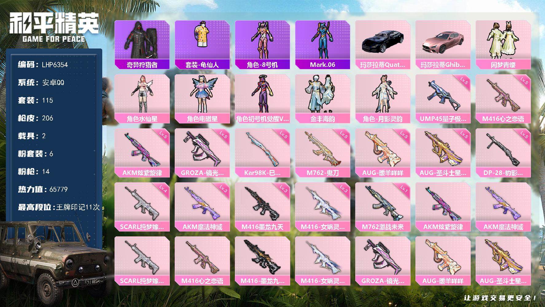 [13981878]【店主推荐捡漏号!可直接换绑】 安卓 手Q-6粉装-14特效枪-2载具-4粉色飞行器-6.5w热力值-11王牌印记-115套装-206枪皮【热门品类】:套装-奇异狩猎者,套装-龟仙人,角色-8号机,角色-Mark.06【粉色载具】:玛莎拉蒂Quattroporte(夜幕蓝),玛莎拉蒂Ghibli(粉)【粉色套装】:粉装-闲梦青缨,角色-水仙星,角色-电磁星,角色-初号机 觉醒Ver.,粉装-金丰海韵,角色-月影灵韵【粉色枪皮等级】:AKM-炫紫旋律(五级),AKM-魔法神域(三级),SCAR-L-纯梦嫁纱(四级),M416-心之恋语(五级),M416-墨龙九天(三级),M416-女娲灵识(三级),GROZA-镜光银凌(五级),AUG-暖羊咩咩(五级),AUG-圣斗士星矢(五级),M762-激战未来(一级),M762-鬼刀(五级),UMP45-量子极限(五级),Kar98K-巳巳如意(五级),DP-28-豹影疾电(五级)【粉色飞行器】:沙丘之主天马,幻海精灵飞行器,初号机 觉醒Ver.飞行器,凤舞九天飞行器