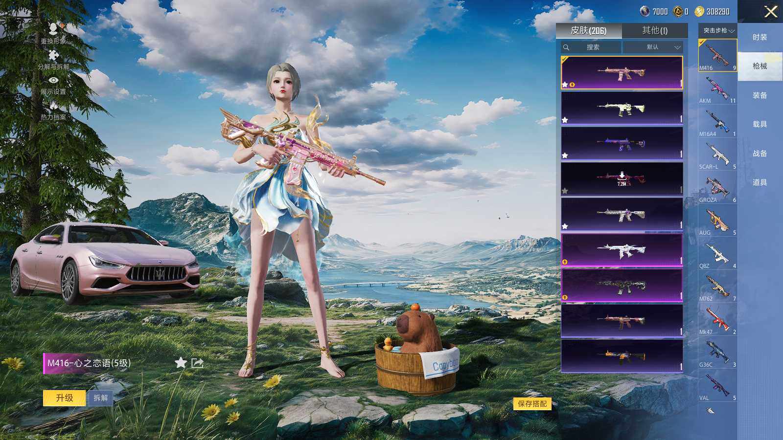 AKM-炫紫旋律,AKM-魔法神域,SCAR-L-纯梦嫁纱,M416-心之恋语,M416-墨龙九天,M416-女娲灵识,GROZA-镜光银凌,AUG-暖羊咩咩,M762-激战未来,M762-鬼刀,UMP45-量子极限,Kar98K-巳巳如意