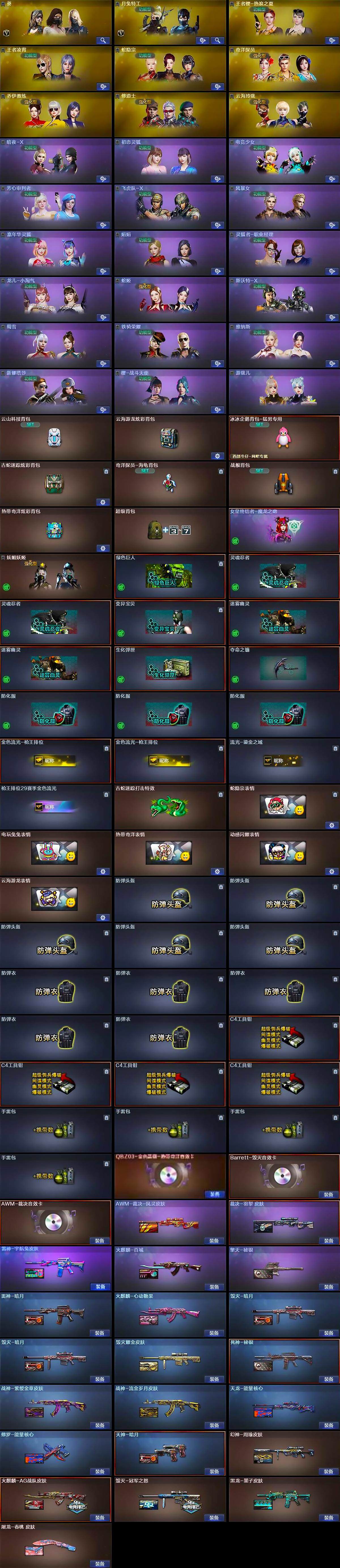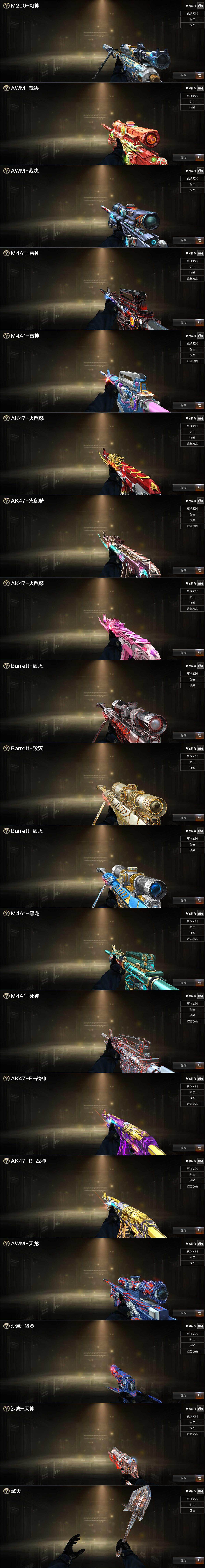 【英雄级武器】:AK47-火麒麟,M4A1-黑龙,M4A1-雷神,AK12-天启,HK417-朱雀,无影-神兵利器,黑武士-锦绣游龙,超新星-热带奇洋,金色蔷薇-古蛇迷踪,M4A1-玫瑰精灵,QBZ03-金色蔷薇,烈火-动感闪耀,王者之势-觉醒版,AK-47-猩红传说*6,AK47-B-战神,黑骑士-海王,白虎-电玩蓝兔,AWM-天龙,Barrett-毁灭,AWM-裁决,M200-幻神*2,王者之怒-觉醒版,王者星神-觉醒版,加特林-炼狱,汤姆逊-烈龙*5,烈龙-云海游龙,AA-12-雷霆,沙鹰-修罗*3,沙鹰-天神*2,柯尔特-竞技荣光,天神-动感闪耀,修罗-古蛇迷踪,屠龙*2,龙啸,麒麟刺-堕天神,