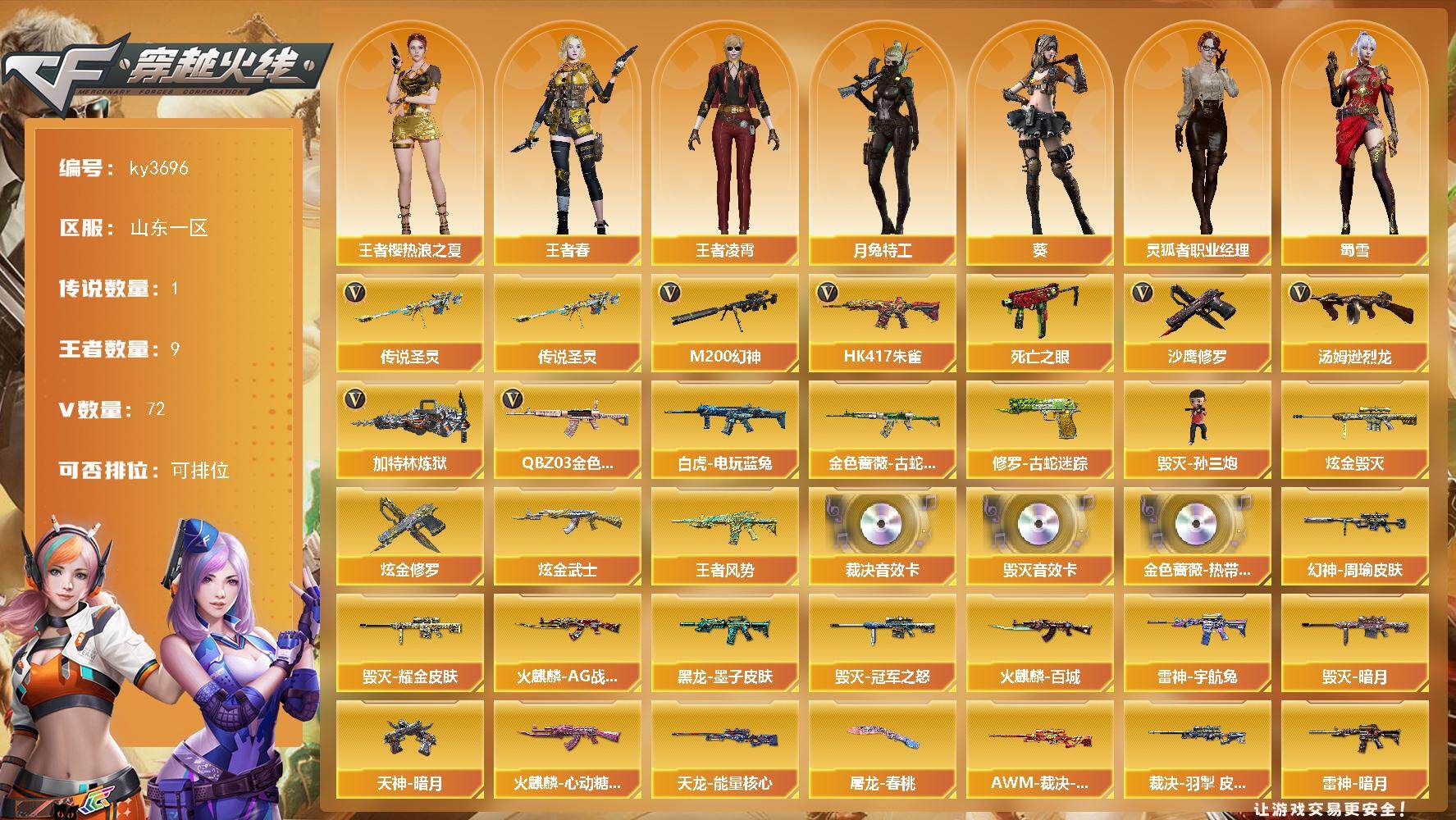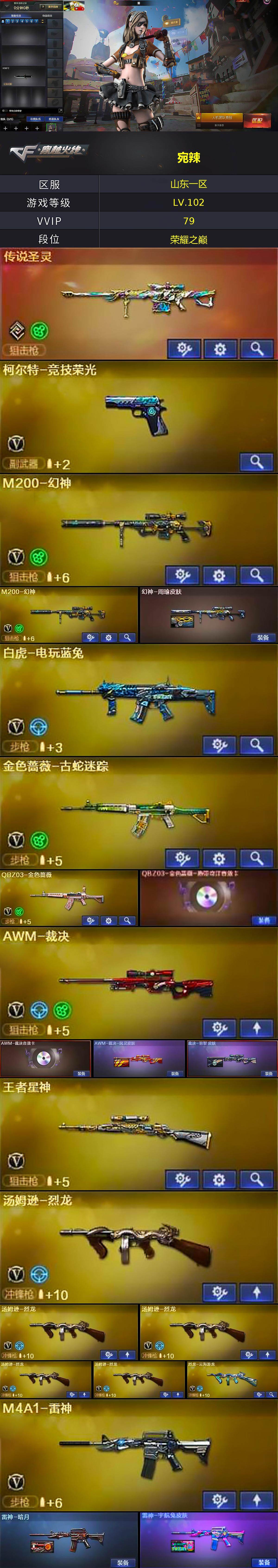 [13982067]山东一区-72V-9王者-3炫金 【传说武器】:传说圣灵 【热门武器】:传说圣灵,QBZ03-金色蔷薇,HK417-朱雀,M200-幻神*2,金色蔷薇-古蛇迷踪,修罗-古蛇迷踪,死亡之眼,白虎-电玩蓝兔,汤姆逊-烈龙*5,加特林-炼狱,毁灭-孙三炮,沙鹰-修罗*3 【王者炫金武器】:王者风势,炫金武士,炫金毁灭,炫金修罗 【音效卡】:QBZ03-金色蔷薇-热带奇洋音效卡,Barrett-毁灭音效卡,AWM-裁决音效卡 【皮肤】:幻神-周瑜皮肤,AWM-裁决-凤灵皮肤,裁决-羽掣 皮肤,雷神-暗月,雷神-宇航兔皮肤,火麒麟-AG战队皮肤,火麒麟-百城,火麒麟-心动糖果,毁灭-暗月*2,毁灭耀金皮肤,毁灭-冠军之怒,黑龙-墨子皮肤,死神-秘银,战神-紫绶金章皮肤,战神-流金岁月皮肤,AK47-B-常胜将军-曹操*2,AK47-B-常胜将军-刘备,天龙-能量核心,修罗-能量核心,天神-暗月,屠龙-春桃 皮肤,擎天-秘银 【角色】:葵,月兔特工,王者樱-热浪之夏,王者春,王者凌霄,蛇隐宗,奇洋探员,乔伊教练,修道士,云海玲珑,暗夜-X,初恋灵狐,电竞少女,芳心审判者,飞虎队-X,风暴女,嘉年华灵狐,娟娟,灵狐者-职业经理,龙儿-小淘气,蛇姬,斯沃特-X,蜀雪,铁骑荣耀,兔囡囡,维纳斯,新娜塔莎,樱-战斗天使,游珑儿,智影 【人偶武器】:毁灭-孙三炮,天龙-曼陀罗,AWM-灵狐-15周年嘉年华,迷你裂空之翼,迷你波特博士,夺魂,迷你生化手雷,闪光弹-小乔,迷你超能女侍 【暴走生化】:死亡之眼,超级对讲机 【挑战大师】:冰龙粉碎者-白马银枪,激光毁灭者III,试炼破坏者III 【英雄级武器】:AK47-火麒麟,M4A1-黑龙,M4A1-雷神,AK12-天启,HK417-朱雀,无影-神兵利器,黑武士-锦绣游龙,超新星-热带奇洋,金色蔷薇-古蛇迷踪,M4A1-玫瑰精灵,QBZ03-金色蔷薇,烈火-动感闪耀,王者之势-觉醒版,AK-47-猩红传说*6,AK47-B-战神,黑骑士-海王,白虎-电玩蓝兔,AWM-天龙,Barrett-毁灭,AWM-裁决,M200-幻神*2,王者之怒-觉醒版,王者星神-觉醒版,加特林-炼狱,汤姆逊-烈龙*5,烈龙-云海游龙,AA-12-雷霆,沙鹰-修罗*3,沙鹰-天神*2,柯尔特-竞技荣光,天神-动感闪耀,修罗-古蛇迷踪,屠龙*2,龙啸,麒麟刺-堕天神,