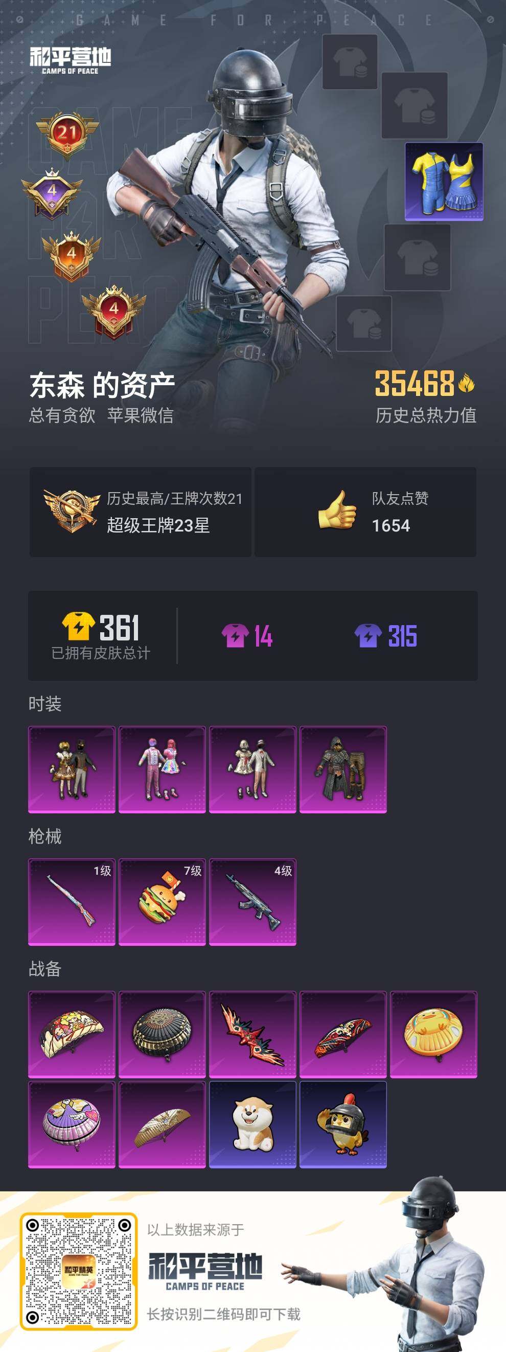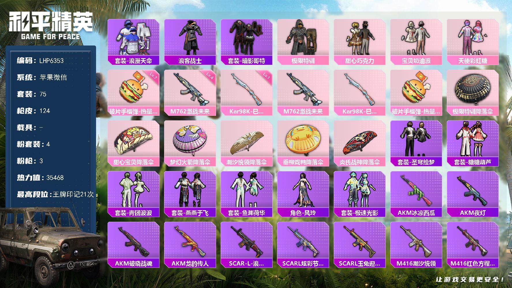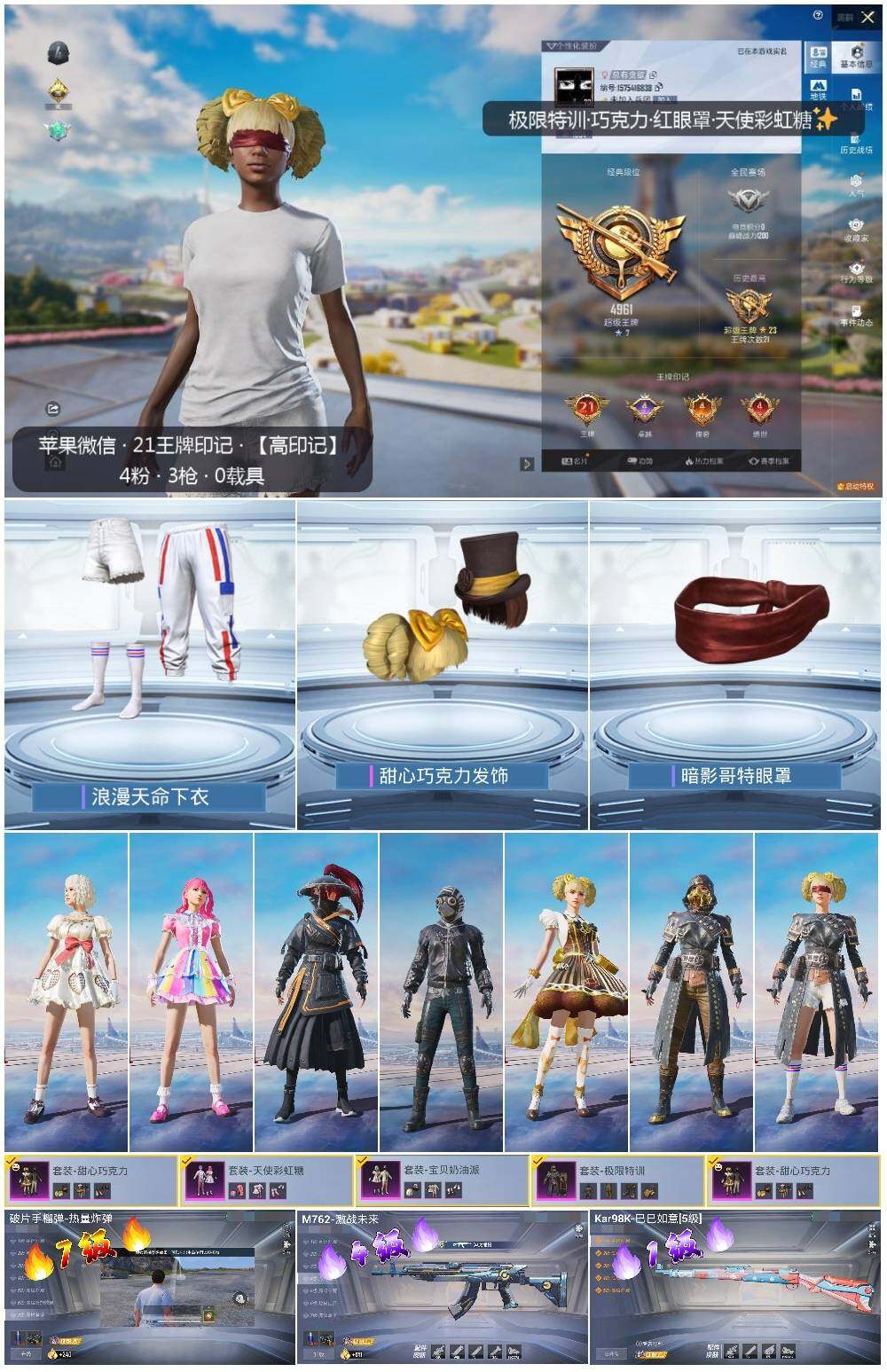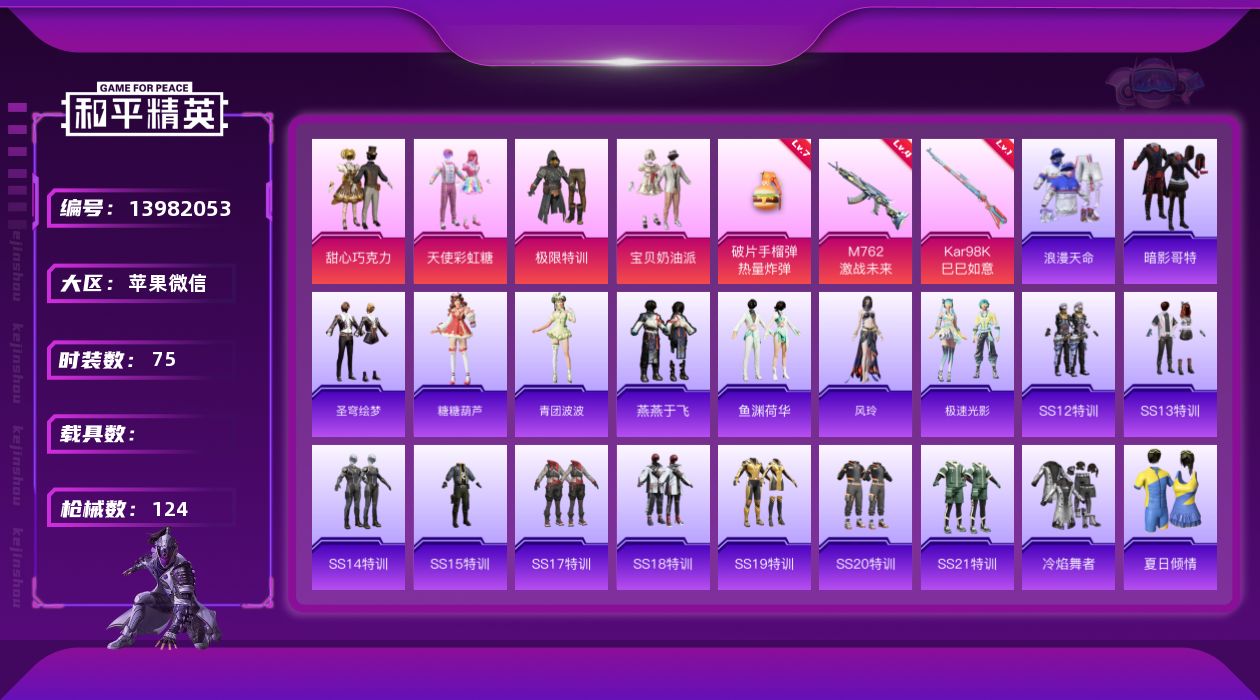 [13982053]苹果 微信-4粉装-3特效枪-1粉色飞行器-3.5w热力值-21王牌印记-75套装-124枪皮【热门品类】:套装-浪漫天命,套装-浪客战士,套装-暗影哥特【粉色套装】:粉装-极限特训,粉装-甜心巧克力,粉装-宝贝奶油派,粉装-天使彩虹糖【粉色枪皮等级】:M762-激战未来(四级),Kar98K-巳巳如意(一级),破片手榴弹-热量炸弹(七级)