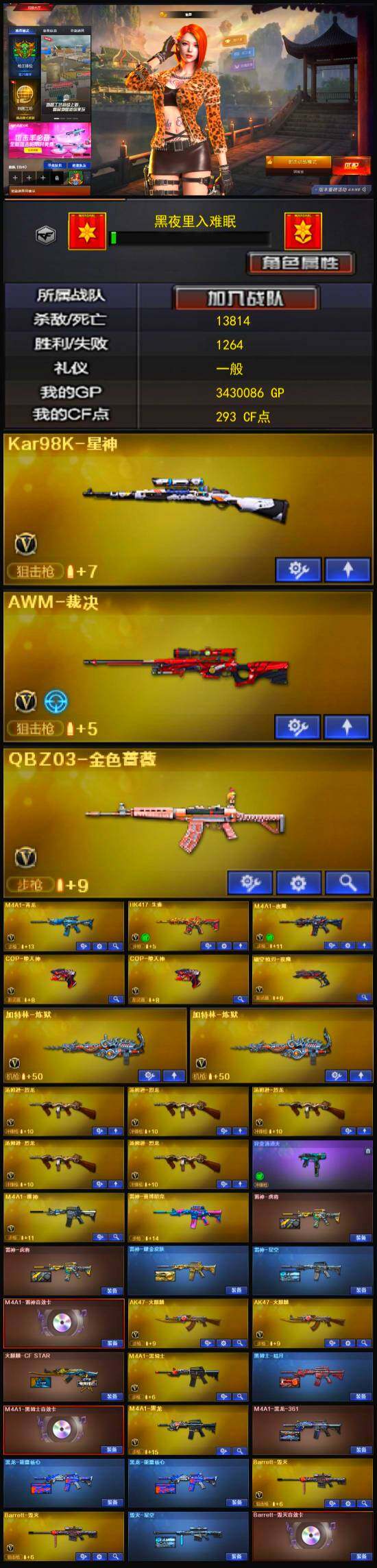 【热门武器】:QBZ03-金色蔷薇,HK417-朱雀,M4A1-青龙,Kar98K-星神,M4A1-黑骑士,汤姆逊-烈龙*5,加特林-炼狱*2,COP-堕天神*2,沙鹰-修罗*2