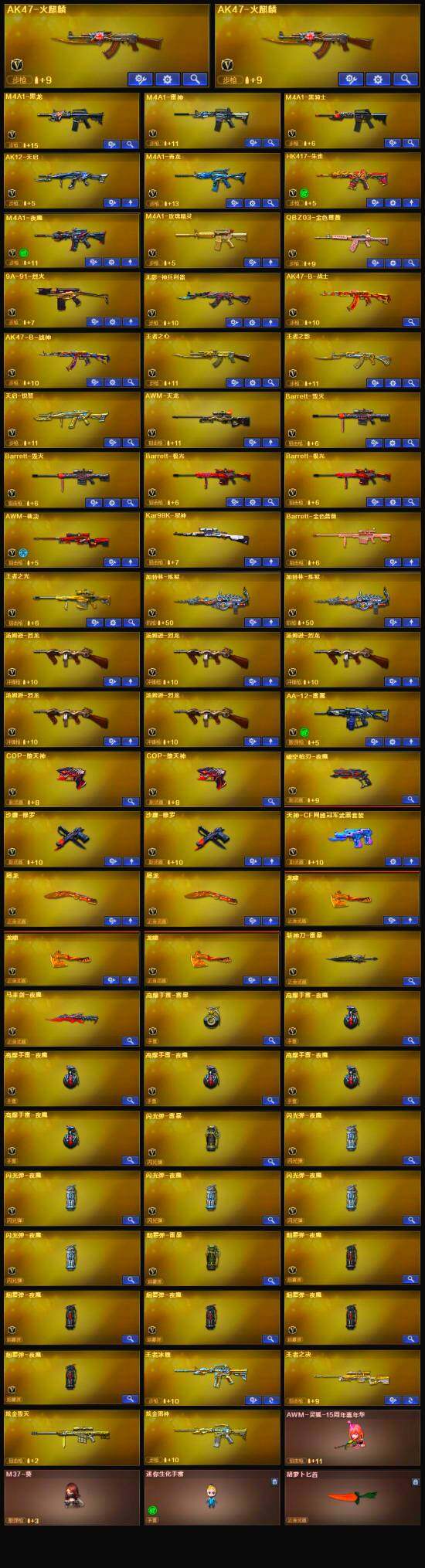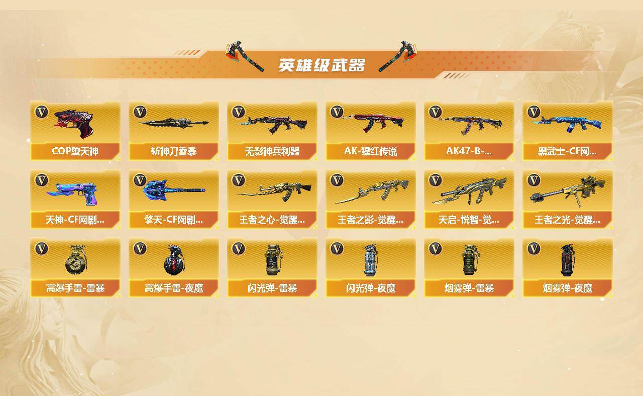 【英雄级武器】:AK47-火麒麟*2,M4A1-黑龙,M4A1-雷神,M4A1-黑骑士,AK12-天启,M4A1-青龙,HK417-朱雀,M4A1-夜魔,无影-神兵利器,M4A1-玫瑰精灵,QBZ03-金色蔷薇,王者之心-觉醒版,王者之影-觉醒版,天启-悦智-觉醒版,AK-47-猩红传说*8,AK47-B-战神,黑武士-CF网剧冠军,AWM-天龙,Barrett-毁灭*2,Barrett-极光*2,AWM-裁决,Kar98K-星神,Barrett-金色蔷薇,王者之光-觉醒版,加特林-炼狱*2,汤姆逊-烈龙*5,AA-12-雷霆,沙鹰-修罗*2,COP-堕天神*2,破空枪刃-夜魔,天神-CF网剧冠军,屠龙*2,龙啸*3,马来剑-夜魔,斩神刀-雷暴,擎天-CF网剧冠军,高爆手雷-雷暴,高爆手雷-夜魔*5,闪光弹-雷暴,闪光弹-夜魔*5,烟雾弹-雷暴,烟雾弹-夜魔*5