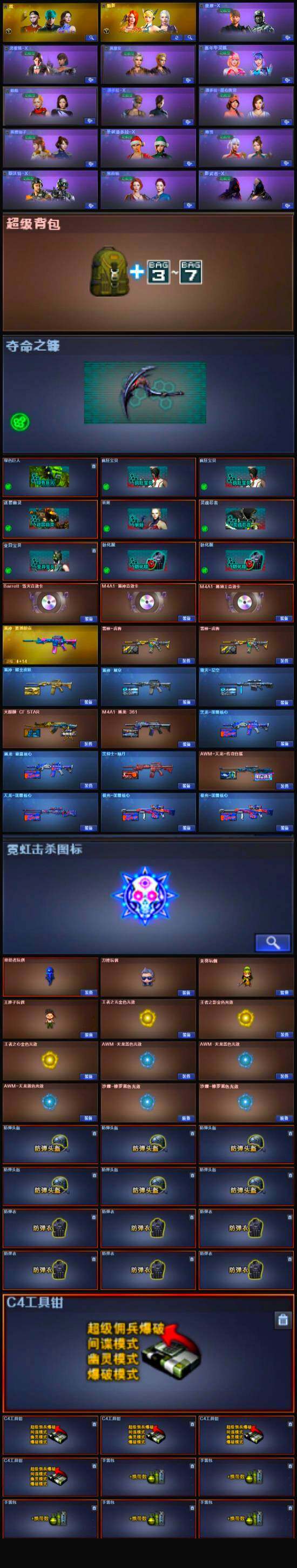 【道具】:炫彩背包,超级背包,黄金巨石泰坦-魔花研究所背包,黄金魔花研究所背包,女皇终结者-魔龙之吻,绿色巨人,灵魂忍者,变异宝贝,妖姬,迷雾幽灵,夺命之镰,防化服*2,C4-沙漠,防弹头盔*6,防弹衣*6,C4工具钳*5,手雷包*5