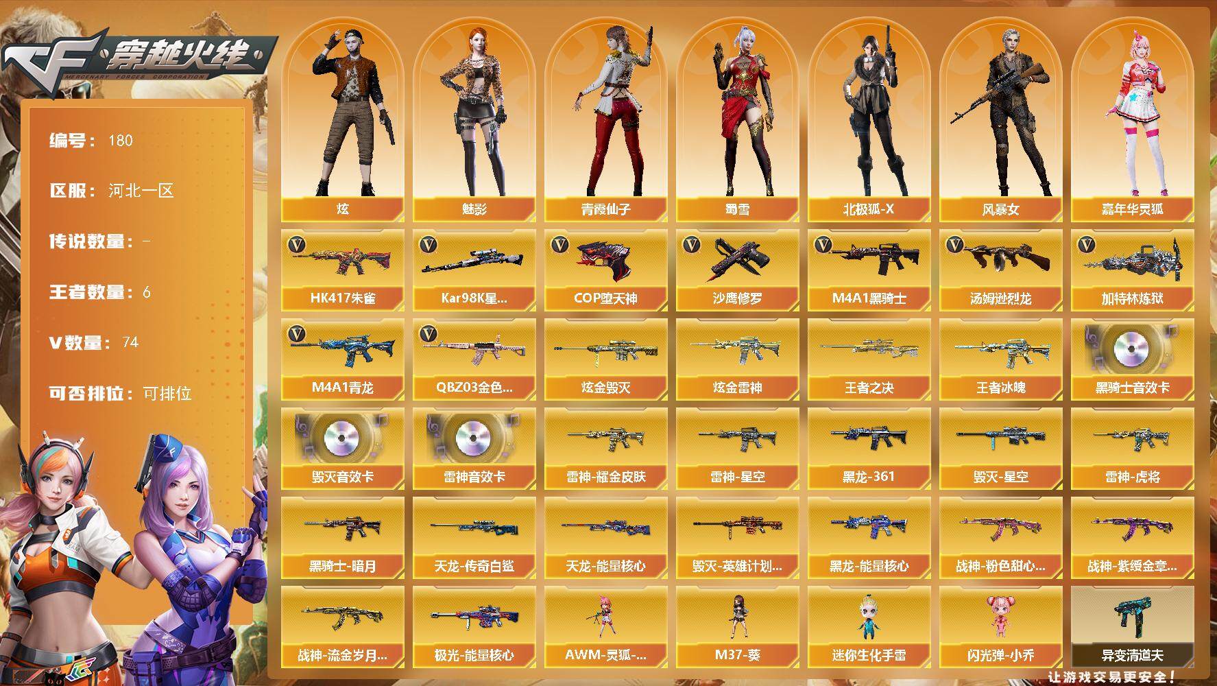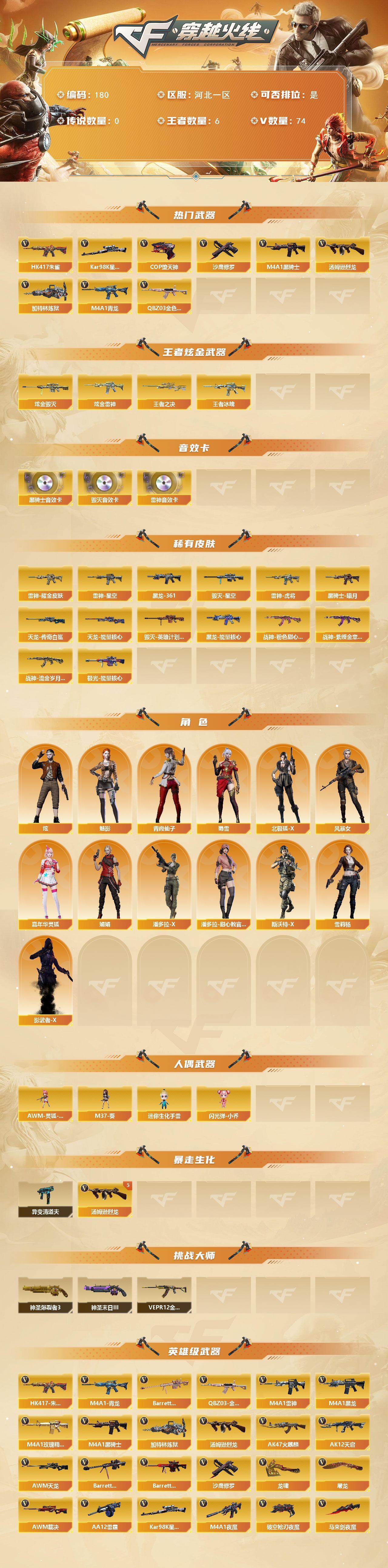 [13982278]河北一区-74V-6王者-2炫金 【热门武器】:QBZ03-金色蔷薇,HK417-朱雀,M4A1-青龙,Kar98K-星神,M4A1-黑骑士,汤姆逊-烈龙*5,加特林-炼狱*2,COP-堕天神*2,沙鹰-修罗*2 【王者炫金武器】:王者冰魄,王者之决,炫金雷神,炫金毁灭 【音效卡】:M4A1-雷神音效卡,M4A1-黑骑士音效卡,Barrett-毁灭音效卡 【皮肤】:雷神-星空,雷神-虎将*2,雷神-耀金皮肤,毁灭-星空,毁灭-英雄计划 皮肤,黑龙-能量核心*2,M4A1-黑龙-361,黑骑士-暗月,战神-粉色甜心皮肤,战神-紫绶金章皮肤*3,战神-流金岁月皮肤,天龙-能量核心,AWM-天龙-传奇白鲨,极光-能量核心*2 【角色】:魅影,炫,北极狐-X,风暴女,嘉年华灵狐,娟娟,潘多拉-X,潘多拉-甜心教官,青霞仙子,斯沃特-X,蜀雪,雪莉杨,影武者-X 【人偶武器】:AWM-灵狐-15周年嘉年华,M37-葵,迷你生化手雷,闪光弹-小乔 【暴走生化】:异变清道夫 【挑战大师】:神圣爆裂者III,VEPR-12-金魔,神圣爆裂者-末日III 【英雄级武器】:AK47-火麒麟*2,M4A1-黑龙,M4A1-雷神,M4A1-黑骑士,AK12-天启,M4A1-青龙,HK417-朱雀,M4A1-夜魔,无影-神兵利器,M4A1-玫瑰精灵,QBZ03-金色蔷薇,王者之心-觉醒版,王者之影-觉醒版,天启-悦智-觉醒版,AK-47-猩红传说*8,AK47-B-战神,黑武士-CF网剧冠军,AWM-天龙,Barrett-毁灭*2,Barrett-极光*2,AWM-裁决,Kar98K-星神,Barrett-金色蔷薇,王者之光-觉醒版,加特林-炼狱*2,汤姆逊-烈龙*5,AA-12-雷霆,沙鹰-修罗*2,COP-堕天神*2,破空枪刃-夜魔,天神-CF网剧冠军,屠龙*2,龙啸*3,马来剑-夜魔,斩神刀-雷暴,擎天-CF网剧冠军,高爆手雷-雷暴,高爆手雷-夜魔*5,闪光弹-雷暴,闪光弹-夜魔*5,烟雾弹-雷暴,烟雾弹-夜魔*5 【道具】:炫彩背包,超级背包,黄金巨石泰坦-魔花研究所背包,黄金魔花研究所背包,女皇终结者-魔龙之吻,绿色巨人,灵魂忍者,变异宝贝,妖姬,迷雾幽灵,夺命之镰,防化服*2,C4-沙漠,防弹头盔*6,防弹衣*6,C4工具钳*5,手雷包*5 【特殊枪械】:1黑骑士,5烈龙,2炼