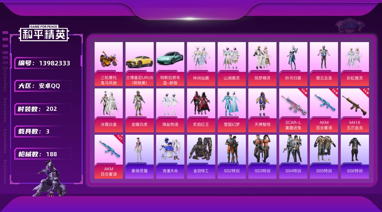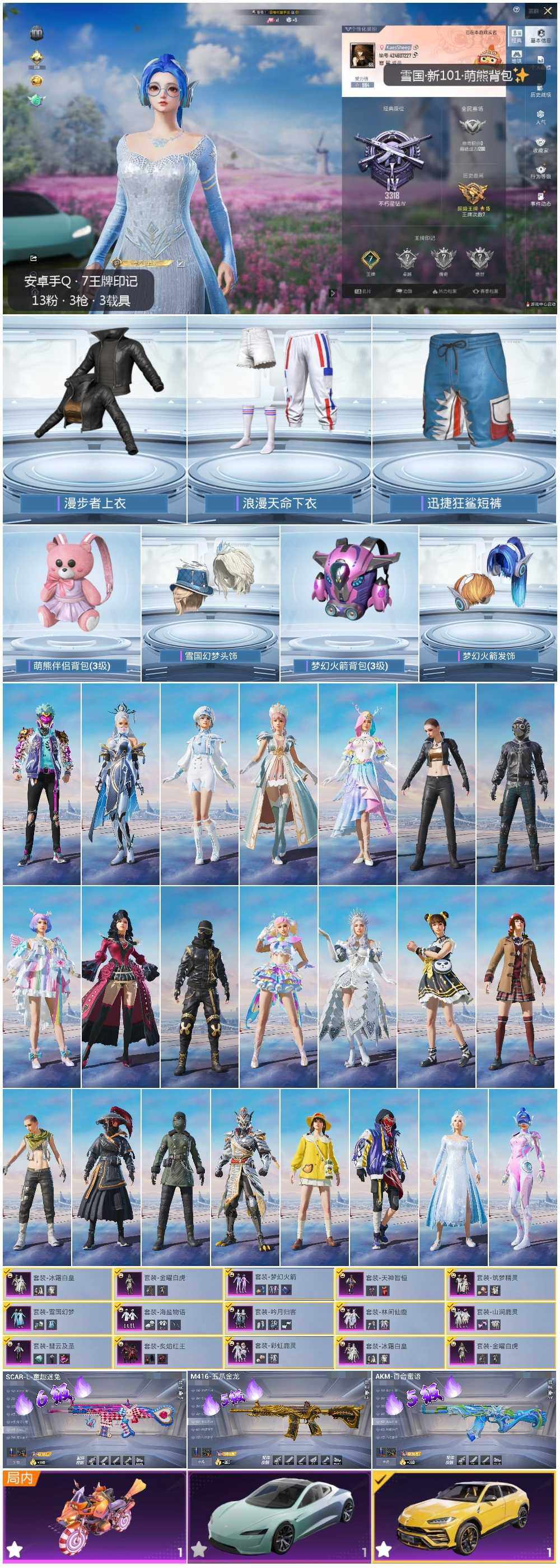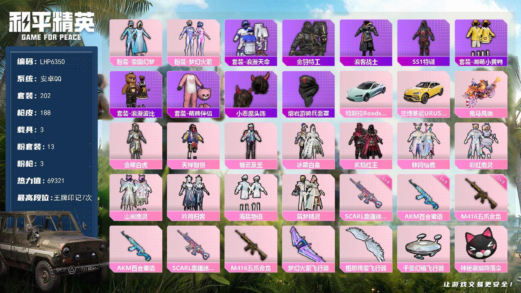 [13982333]可二次【店主推荐捡漏号!可直接换绑】/素材身法号 安卓 手Q-13粉装-3特效枪-3载具-4粉色飞行器-6.9w热力值-7王牌印记-202套装-188枪皮【热门品类】:粉装-雪国幻梦,粉装-梦幻火箭,套装-浪漫天命,套装-金羽特工,套装-浪客战士,套装-SS1特训,套装-潮萌小黄鸭,套装-浪漫波比,套装-萌熊伴侣,小恶魔头饰,熔岩游骑兵面罩【粉色载具】:特斯拉Roadster(水滴蓝),兰博基尼URUS(明艳黄),鬼马风驰【粉色套装】:粉装-金曜白虎,粉装-雪国幻梦,粉装-梦幻火箭,粉装-天禅智恒,粉装-彗云及圣,粉装-冰霜白皇,粉装-炙焰红王,粉装-林间仙鹿,粉装-彩虹鹿灵,粉装-山涧鹿灵,粉装-吟月归客,粉装-海盐物语,粉装-筑梦精灵【粉色枪皮等级】:AKM-百合蜜语(五级),SCAR-L-童趣迷兔(六级),M416-五爪金龙(五级)【粉色飞行器】:梦幻火箭飞行器,相思残雪飞行器,千面幻镜飞行器