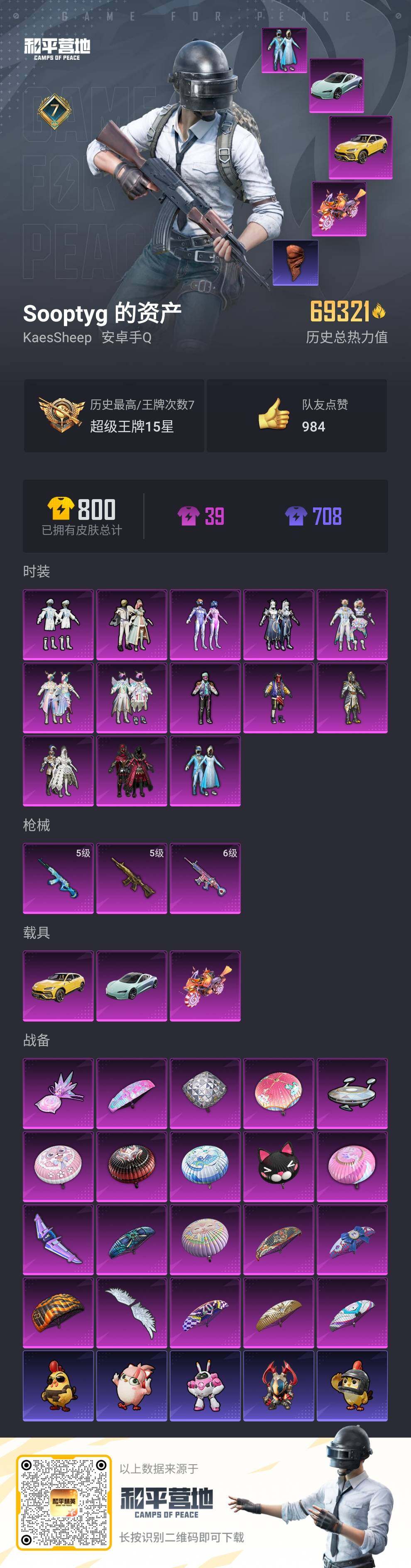 - PX_2101263-??/枪械8/装备305/载具1/战备204/王牌印记12/热力值75522/五级AKM-绿萝繁花/五级SCAR-L-锦绣绵绵/七级M416-风花雪月/五级M416-电玩时刻/五级GROZA-镜光银凌/五级AUG-暖羊咩咩/五级Kar98K-巳巳如意/三级MK12-雪月幻音/二级金蛇镇世-烛九/金蛇镇世-烛九/护世瑞兽/莲影清波/粉装-幻彩电音/套装-龟仙人/套装-巳巳如意/