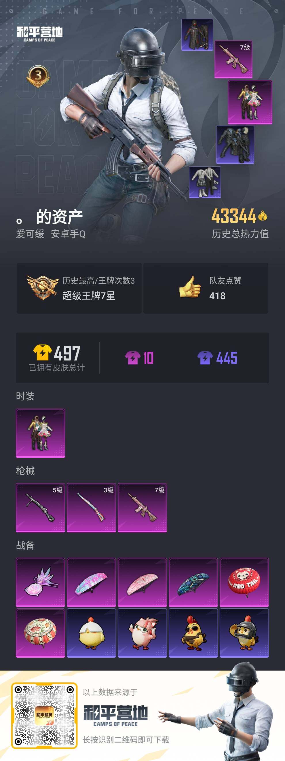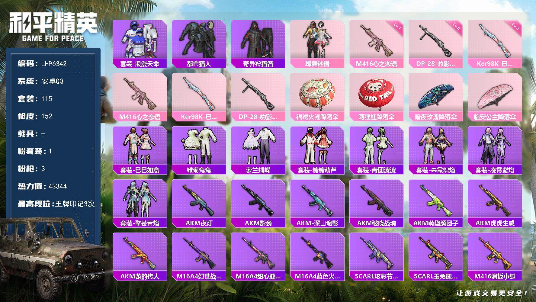 [13982368]【店主推荐捡漏号!可直接换绑】 安卓 手Q-1粉装-3特效枪-1粉色飞行器-4.3w热力值-3王牌印记-115套装-152枪皮【热门品类】:套装-浪漫天命,套装-都市猎人,套装-奇异狩猎者【粉色套装】:粉装-蝶舞迷情【粉色枪皮等级】:M416-心之恋语(七级),Kar98K-巳巳如意(三级),DP-28-豹影疾电(五级)