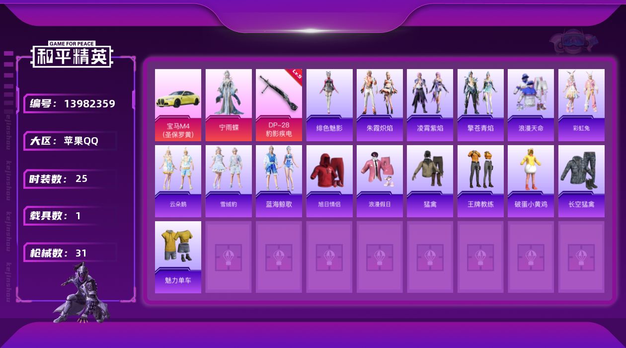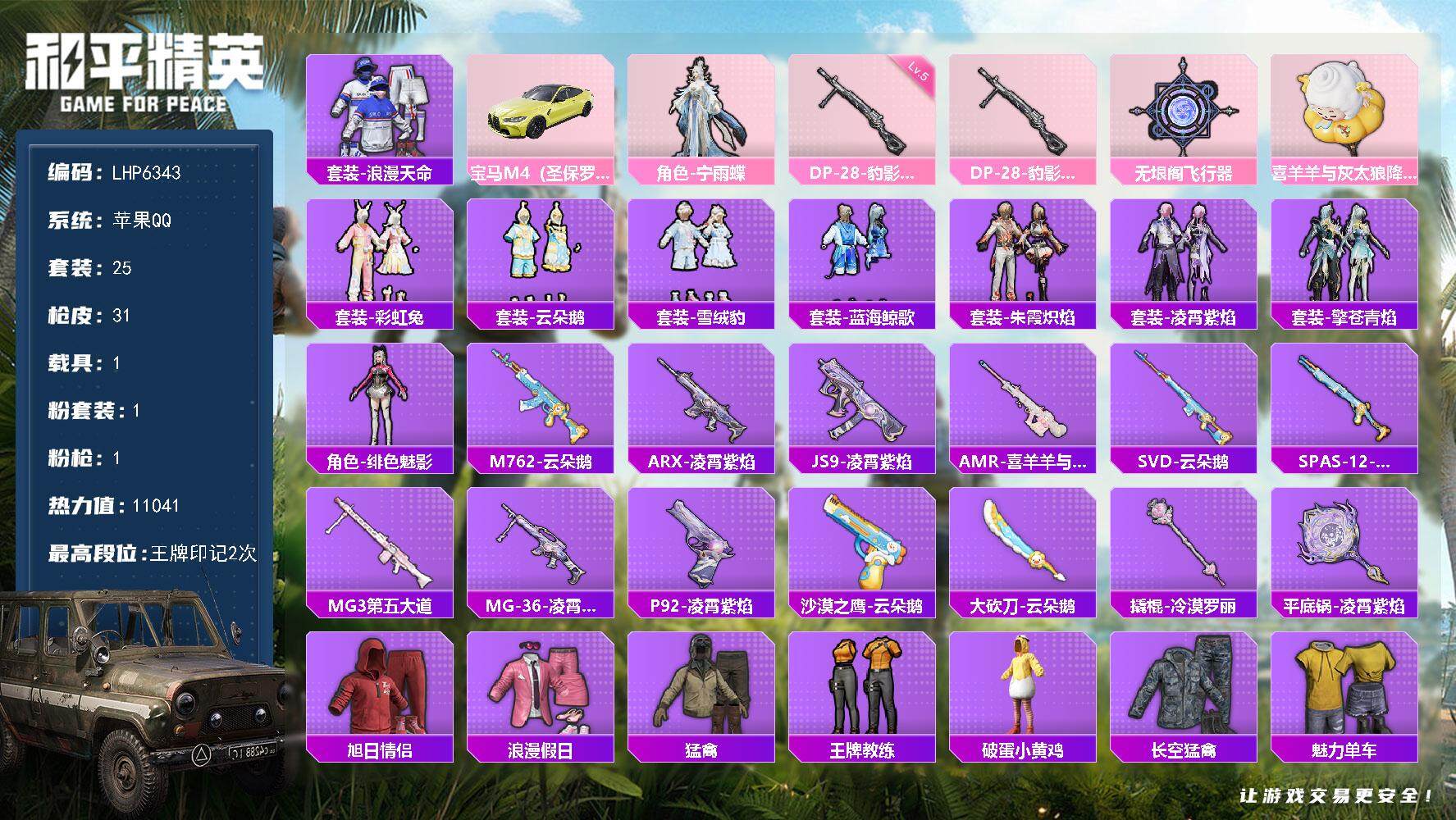 [13982359]【店主推荐捡漏号!可直接换绑】/绝世印记1 苹果 手Q-1粉装-1特效枪-1载具-1粉色飞行器-1.1w热力值-2王牌印记-25套装-31枪皮【热门品类】:套装-浪漫天命【粉色载具】:宝马M4(圣保罗黄)【粉色套装】:角色-宁雨蝶【粉色枪皮等级】:DP-28-豹影疾电(五级)【粉色飞行器】:无垠阁飞行器