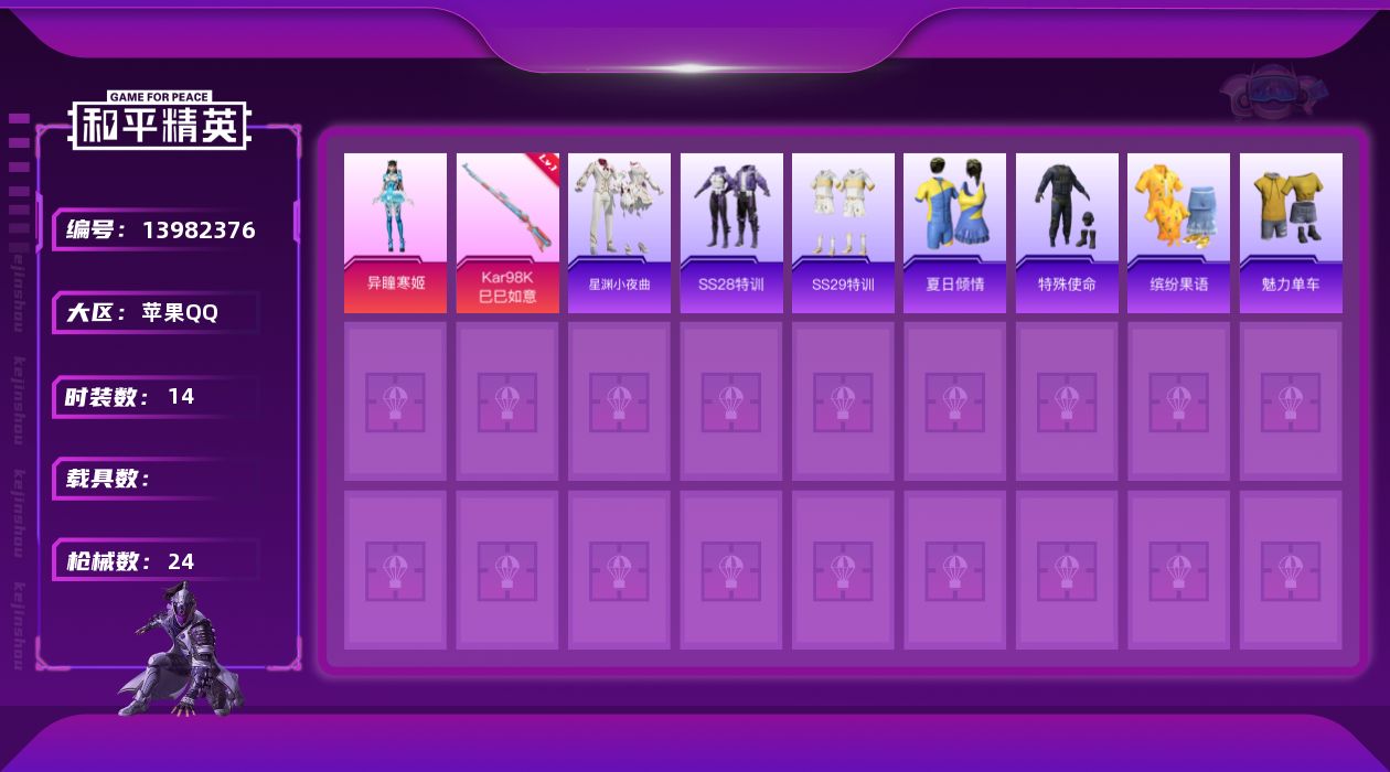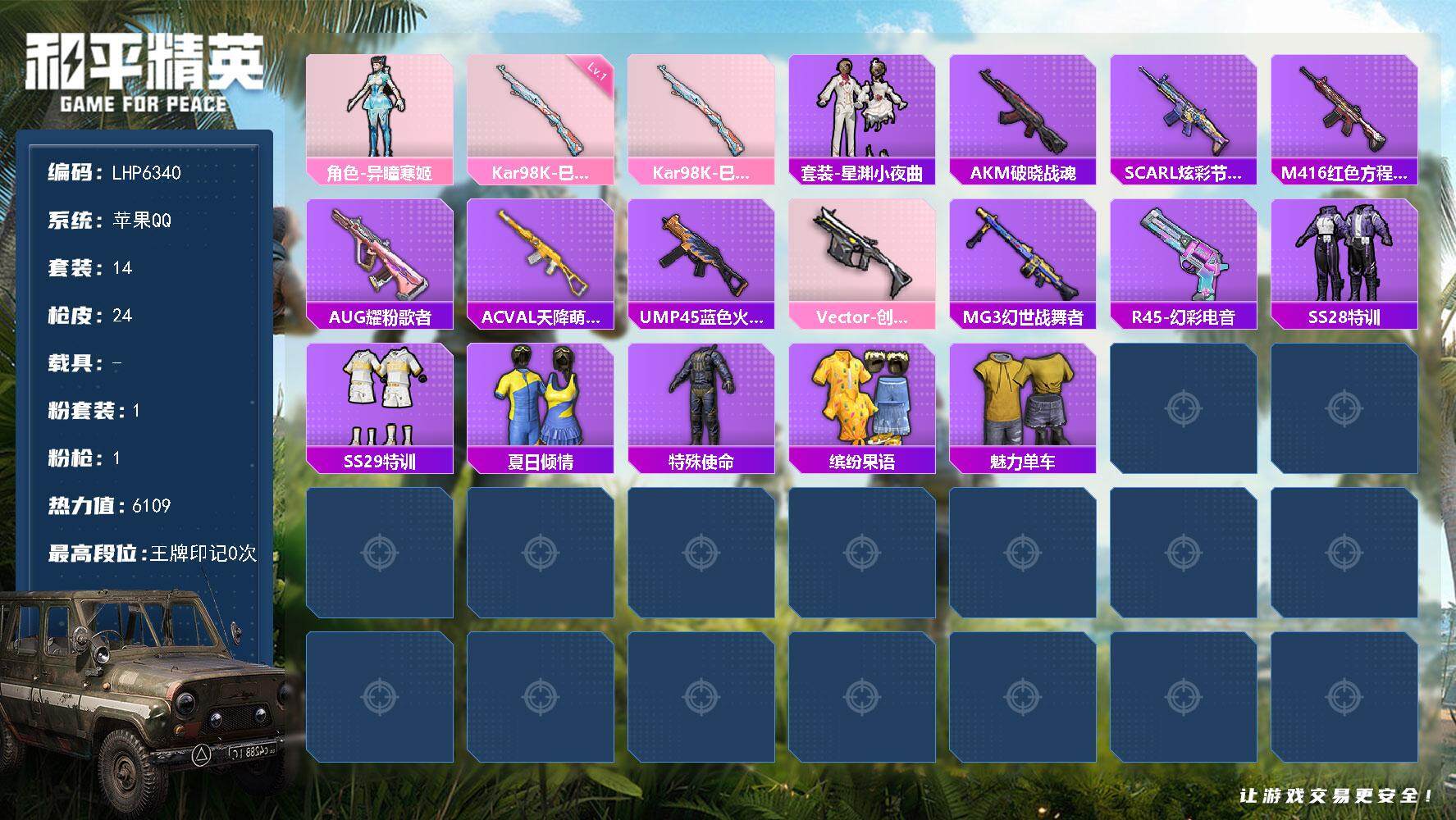 [13982376]可二次【店主推荐捡漏号!可直接换绑】苹果 手Q-1粉装-1特效枪-6109热力值-1王牌印记-14套装-24枪皮【粉色套装】:角色-异瞳寒姬【粉色枪皮等级】:Kar98K-巳巳如意(一级)