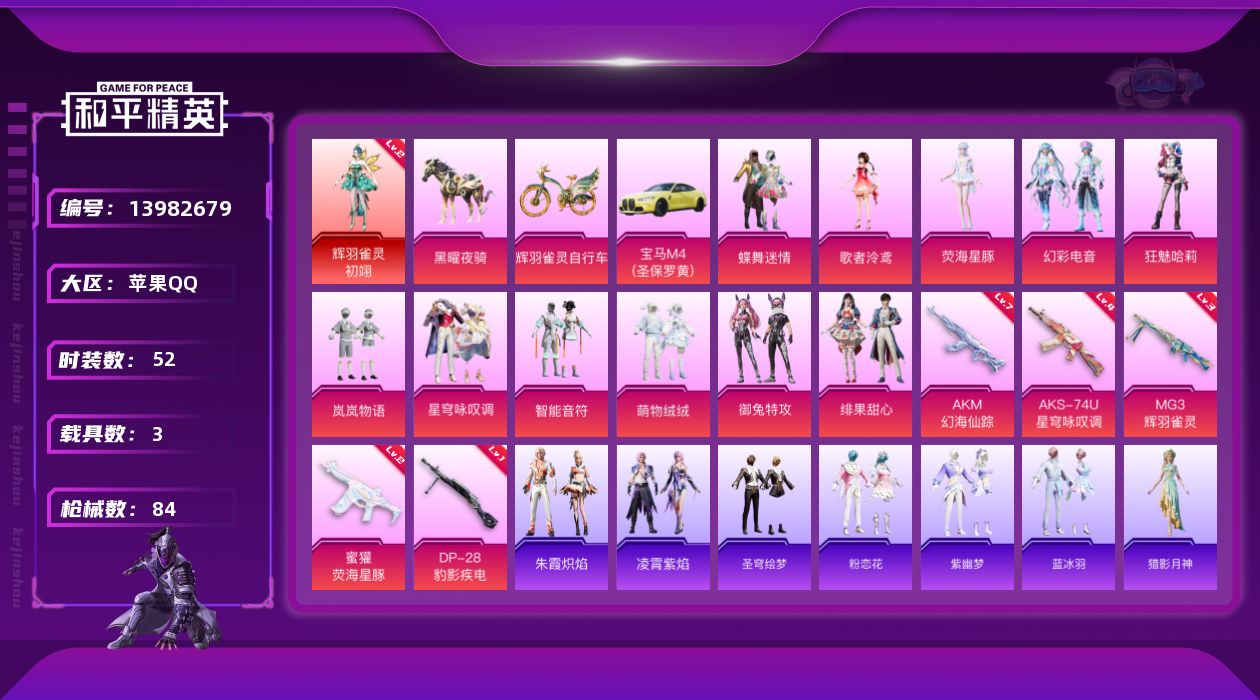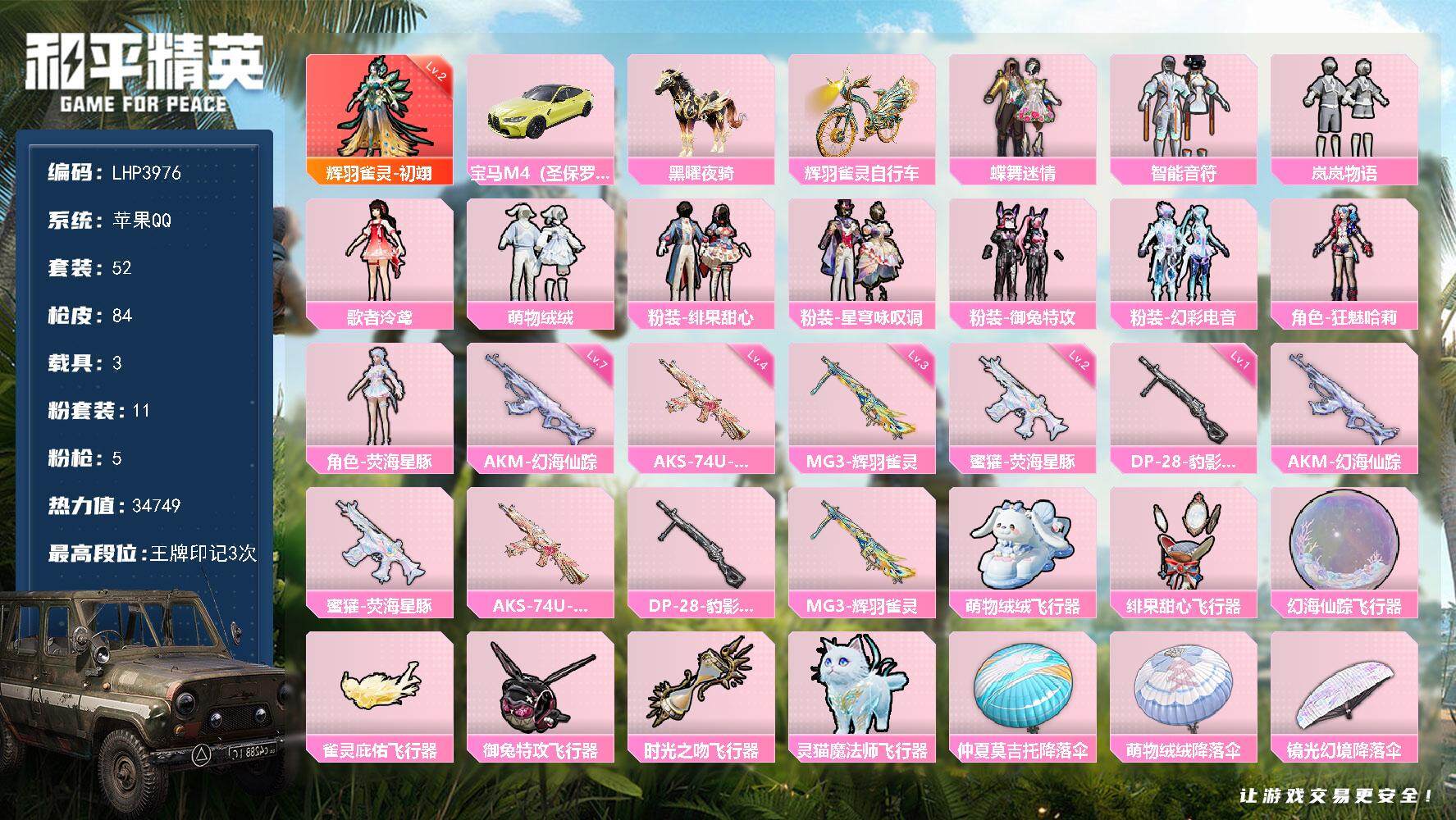 [13982679]【暑期末清货/特价急出/永久包赔】:苹果 手Q-11粉装-5特效枪-3载具-3.4w热力值-3印记-52套装-84枪皮【角色神装等级】:辉羽雀灵-初翊(二级)【稀有载具】:宝马M4(圣保罗黄),黑曜夜骑,辉羽雀灵自行车【特效枪等级】:AKM-幻海仙踪(七级),蜜獾-荧海星豚(二级),AKS-74U-星穹咏叹调(四级),DP-28-豹影疾电(一级),MG3-辉羽雀灵(三级)【优质套装】:粉装-蝶舞迷情,粉装-智能音符,粉装-岚岚物语,角色-歌者泠鸢,粉装-萌物绒绒,粉装-绯果甜心,粉装-星穹咏叹调,粉装-御兔特攻,粉装-幻彩电音,角色-狂魅哈莉,角色-荧海星豚【优质飞行器】:萌物绒绒飞行器,绯果甜心飞行器,幻海仙踪飞行器,雀灵庇佑飞行器,御兔特攻飞行器,时光之吻飞行器,灵猫魔法师飞行器