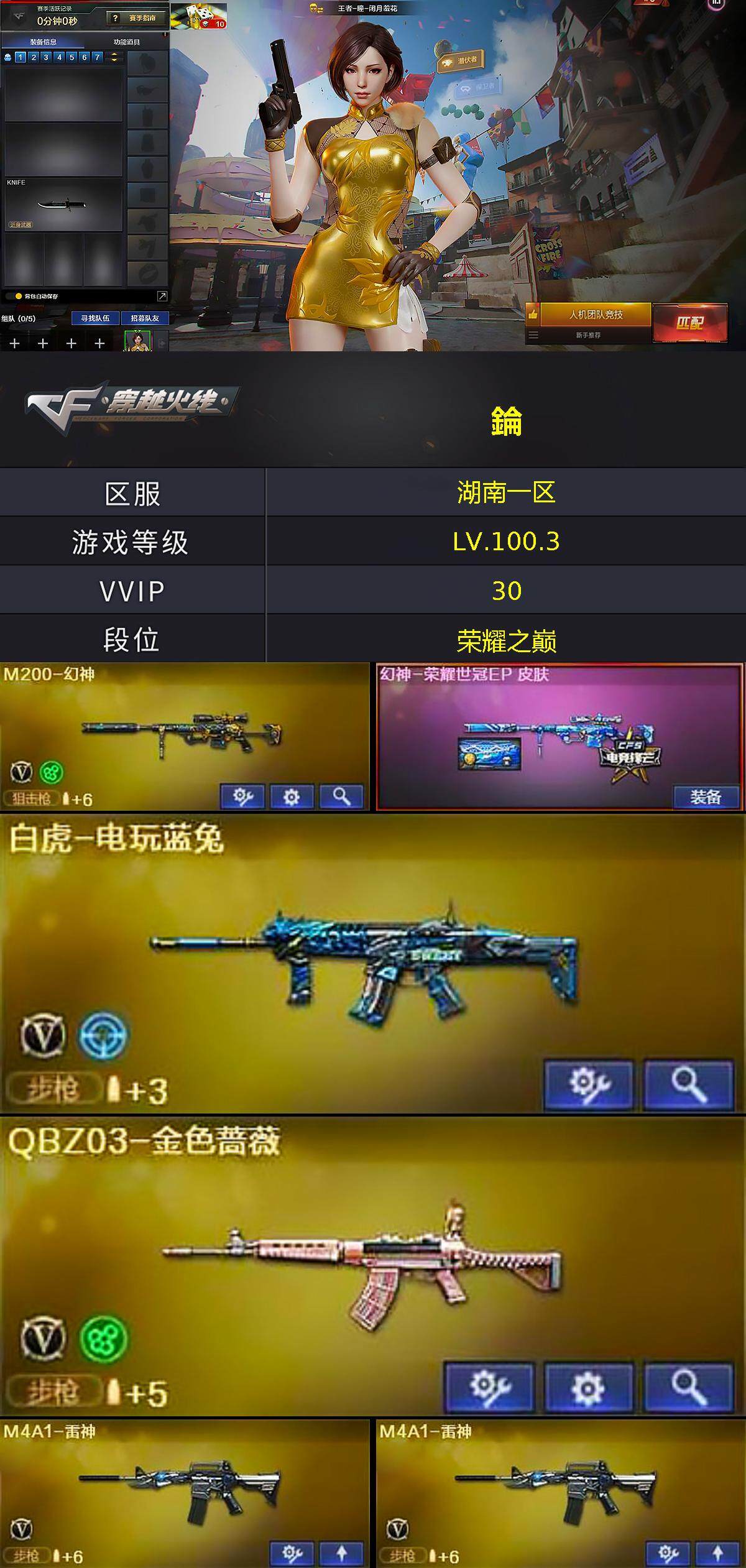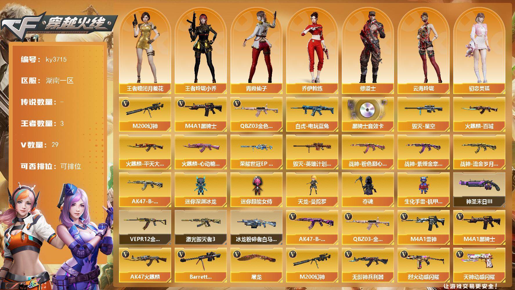 [13982735]湖南一区-29V-3王者-0炫金 【热门武器】:QBZ03-金色蔷薇,M200-幻神,白虎-电玩蓝兔,M4A1-黑骑士 【音效卡】:M4A1-黑骑士音效卡 【皮肤】:幻神-荣耀世冠EP 皮肤,火麒麟-平天大圣*2,火麒麟-百城,火麒麟-心动糖果,毁灭-星空,毁灭-英雄计划 皮肤,战神-粉色甜心皮肤,战神-紫绶金章皮肤,战神-流金岁月皮肤,AK47-B-常胜将军-刘备 【角色】:王者-瞳-闭月羞花,王者玲珑-小乔,乔伊教练,修道士,云海玲珑,初恋灵狐,电竞少女,芳心审判者,风暴女,嘉年华灵狐,娟娟,0号玩家,灵狐者-七夕宝贝,龙儿-小淘气,麻雀,潘多拉-X,潘多拉-甜心教官,青霞仙子,斯沃特-X,樱-战斗天使 【人偶武器】:天龙-曼陀罗,迷你深渊冰龙,夺魂,生化手雷-机甲核心*2,迷你超能女侍 【挑战大师】:冰龙粉碎者-白马银枪*3,VEPR-12-金魔,激光毁灭者III,神圣爆裂者-末日III 【英雄级武器】:AK47-火麒麟*2,M4A1-雷神*2,M4A1-黑骑士,无影-神兵利器,QBZ03-金色蔷薇,烈火-动感闪耀,王者之武-觉醒版,AK-47-猩红传说*2,AK47-B-常胜将军,白虎-电玩蓝兔,Barrett-毁灭,M200-幻神,天神-动感闪耀,屠龙*2,屠龙-动感闪耀,高爆手雷-神工天巧,手雷-动感闪耀,闪光弹-神工天巧*2,烟雾弹-神工天巧*2,烟雾弹-荣耀世冠EP,M4A1-赤狱骑士 【道具】:次元之矛-背包,虎牙炫彩背包,超级背包,救世主-黑桃战神,夺命之镰,防化服,金色流光-枪王排位*2,星辰流光-枪王排位,巅峰赛先锋-金色流光,枪王排位28赛季金色流光,枪王排位29赛季金色流光,电玩兔兔表情,斯沃特表情,动感闪耀表情,防弹头盔,防弹衣,C4工具钳,手雷包 【特殊枪械】:1黑骑士