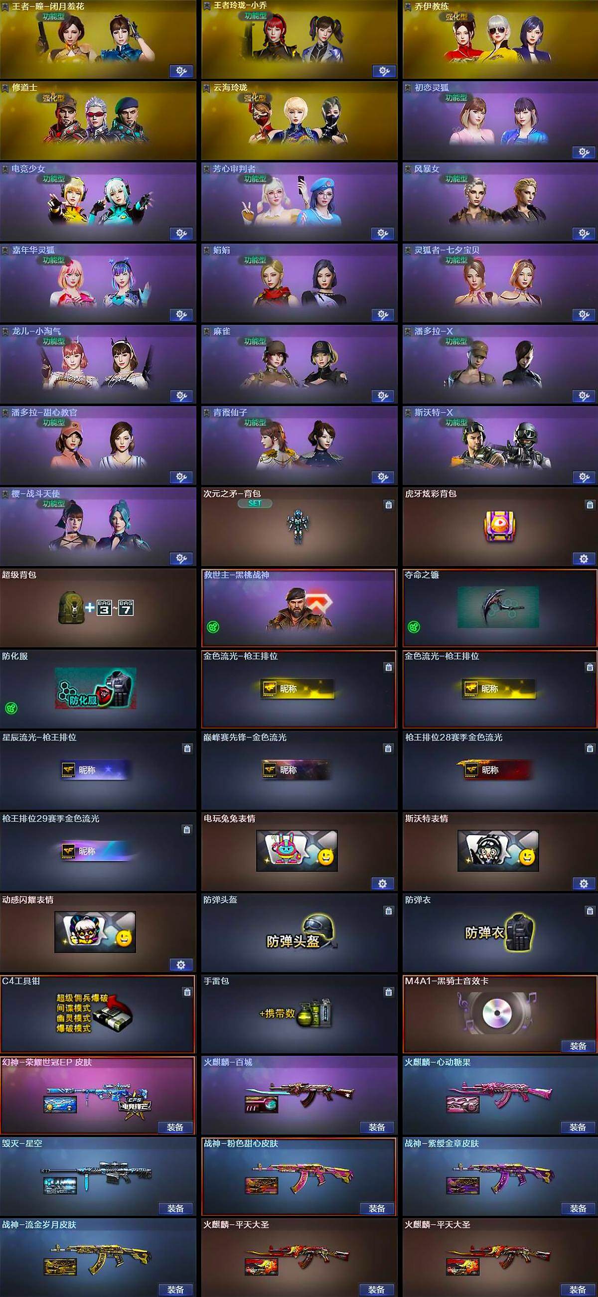 【道具】:次元之矛-背包,虎牙炫彩背包,超级背包,救世主-黑桃战神,夺命之镰,防化服,金色流光-枪王排位*2,星辰流光-枪王排位,巅峰赛先锋-金色流光,枪王排位28赛季金色流光,枪王排位29赛季金色流光,电玩兔兔表情,斯沃特表情,动感闪耀表情,防弹头盔,防弹衣,C4工具钳,手雷包