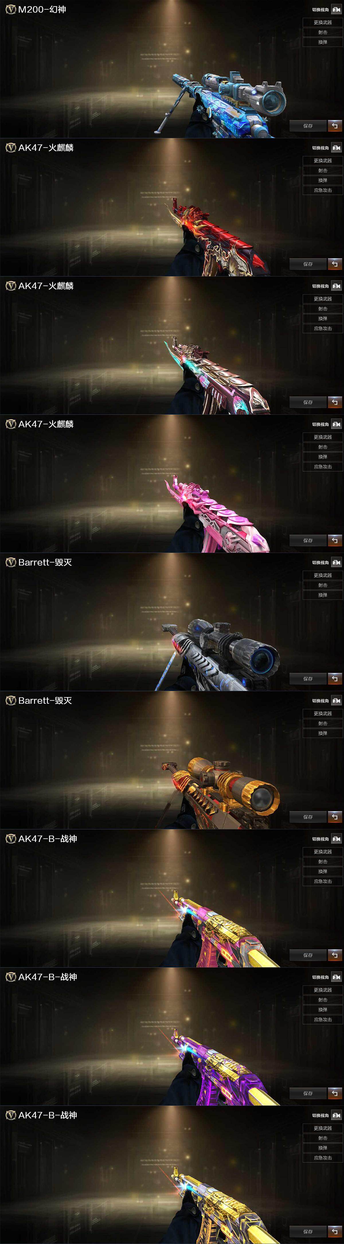 【英雄级武器】:AK47-火麒麟*2,M4A1-雷神*2,M4A1-黑骑士,无影-神兵利器,QBZ03-金色蔷薇,烈火-动感闪耀,王者之武-觉醒版,AK-47-猩红传说*2,AK47-B-常胜将军,白虎-电玩蓝兔,Barrett-毁灭,M200-幻神,天神-动感闪耀,屠龙*2,屠龙-动感闪耀,高爆手雷-神工天巧,手雷-动感闪耀,闪光弹-神工天巧*2,烟雾弹-神工天巧*2,烟雾弹-荣耀世冠EP,M4A1-赤狱骑士