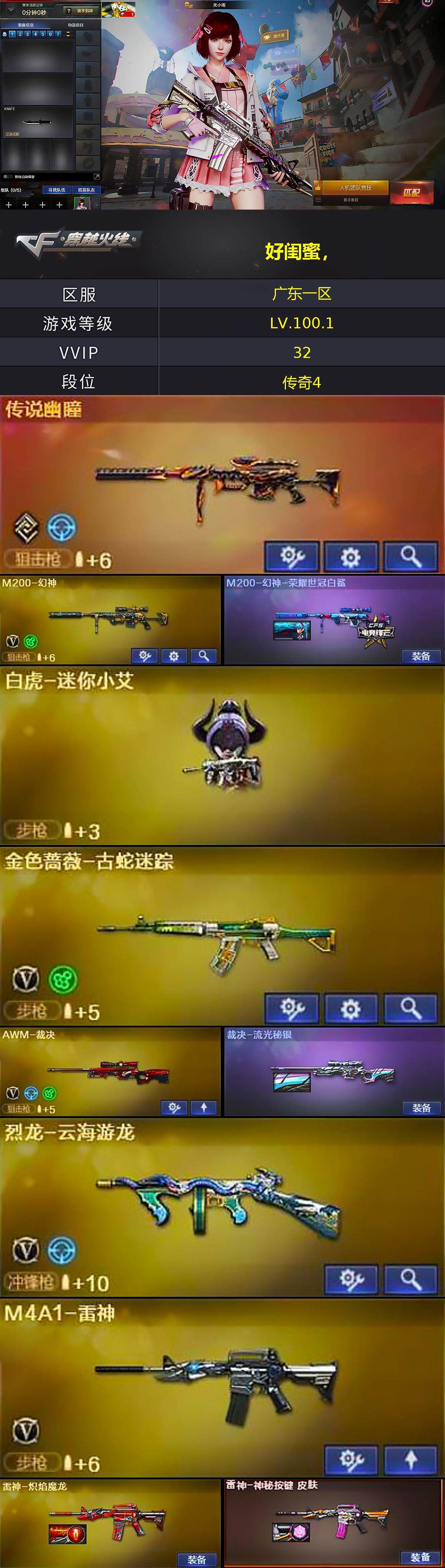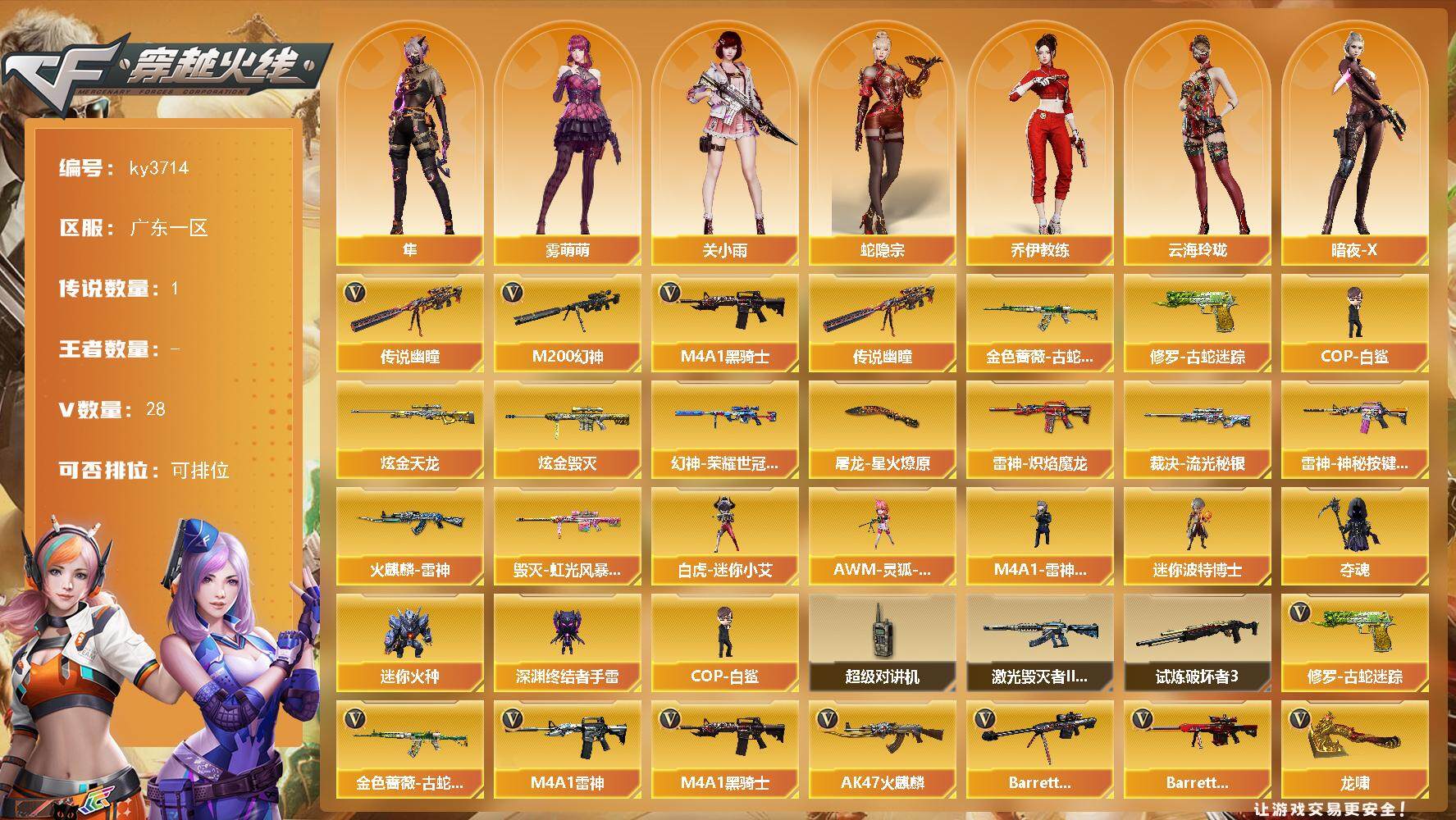 [13982859]广东一区-28V-0王者-2炫金 【传说武器】:传说幽瞳 【热门武器】:传说幽瞳,M200-幻神,金色蔷薇-古蛇迷踪,修罗-古蛇迷踪,M4A1-黑骑士,COP-白鲨 【王者炫金武器】:炫金毁灭,炫金天龙 【皮肤】:M200-幻神-荣耀世冠白鲨,裁决-流光秘银,雷神-炽焰魔龙,雷神-神秘按键 皮肤,火麒麟-雷神,毁灭-虹光风暴 皮肤,屠龙-星火燎原 【角色】:关小雨,雾萌萌,隼,蛇隐宗,乔伊教练,云海玲珑,暗夜-X,嘉年华灵狐,兰-新年限定,灵狐者-X,麻雀,曼陀罗-X,曼陀罗-礼服,萌儿,潘多拉-X,蛇姬,新娜塔莎 【人偶武器】:COP-白鲨,白虎-迷你小艾,M4A1-雷神-精英刀锋,AWM-灵狐-15周年嘉年华,迷你波特博士,夺魂,迷你火种,深渊终结者手雷*2 【暴走生化】:超级对讲机 【挑战大师】:激光毁灭者III-白马银枪,试炼破坏者III 【英雄级武器】:AK47-火麒麟,M4A1-雷神,M4A1-黑骑士,无影-神兵利器,黑武士-锦绣游龙,金色蔷薇-古蛇迷踪,烈火-动感闪耀,Barrett-毁灭,Barrett-极光,AWM-裁决,M200-幻神,烈龙-云海游龙,天神-动感闪耀,修罗-古蛇迷踪,屠龙,龙啸,屠龙-动感闪耀,擎天-云海游龙,高爆手雷-竞技荣光*3,手雷-动感闪耀,手雷-云海游龙,高爆手雷-古蛇迷踪,闪光弹-竞技荣光,烟雾弹-幻灵,烟雾弹-古蛇迷踪 【道具】:BS战队炫彩背包,云山科技背包,云海游龙炫彩背包,全能枪王背包,古蛇迷踪炫彩背包,女皇终结者-背包,炫彩背包-诺拉,超级背包,黄金曼提柯尔的背包,女皇终结者-魔龙之吻,救世主-黑桃战神,绿色巨人,灵魂忍者,迷雾幽灵,夺命之镰,防化服*3,金色流光-枪王排位*2,星辰流光-枪王排位,枪王排位28赛季金色流光,枪王排位29赛季金色流光,古蛇迷踪打击特效,蛇隐宗表情,动感闪耀表情,云海游龙表情,防弹头盔*3,防弹衣*3,C4工具钳*3,手雷包*3 【特殊枪械】:1黑骑士