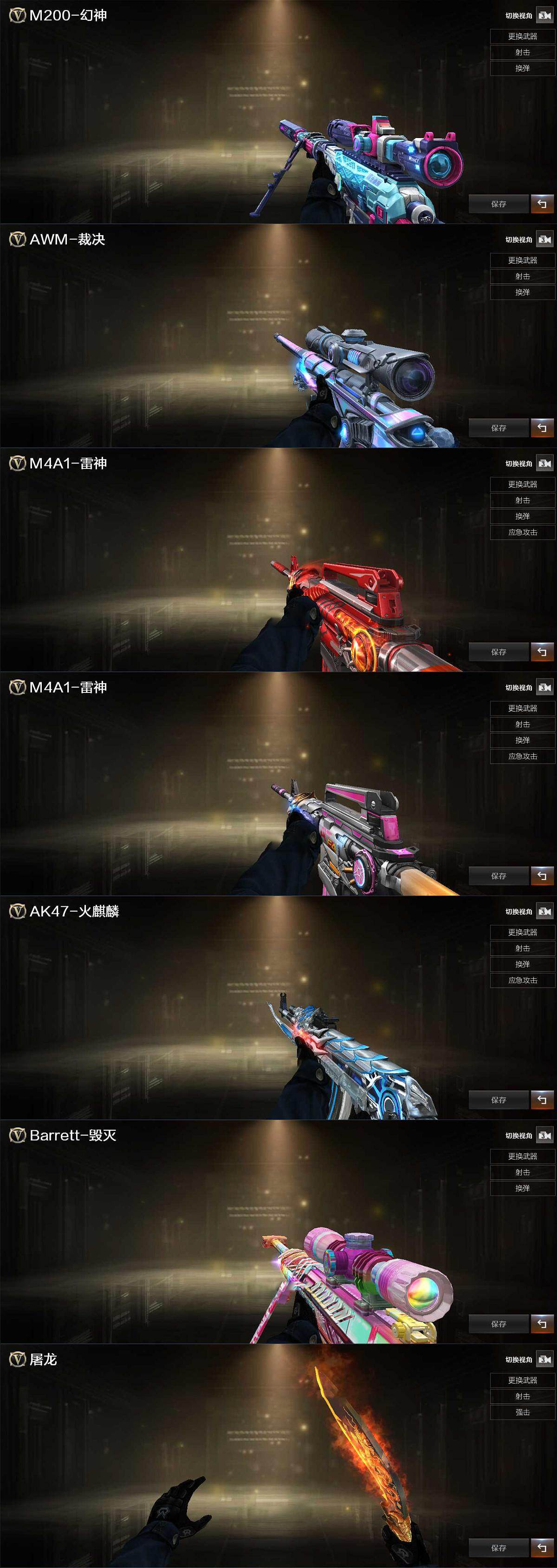 【皮肤】:M200-幻神-荣耀世冠白鲨,裁决-流光秘银,雷神-炽焰魔龙,雷神-神秘按键 皮肤,火麒麟-雷神,毁灭-虹光风暴 皮肤,屠龙-星火燎原