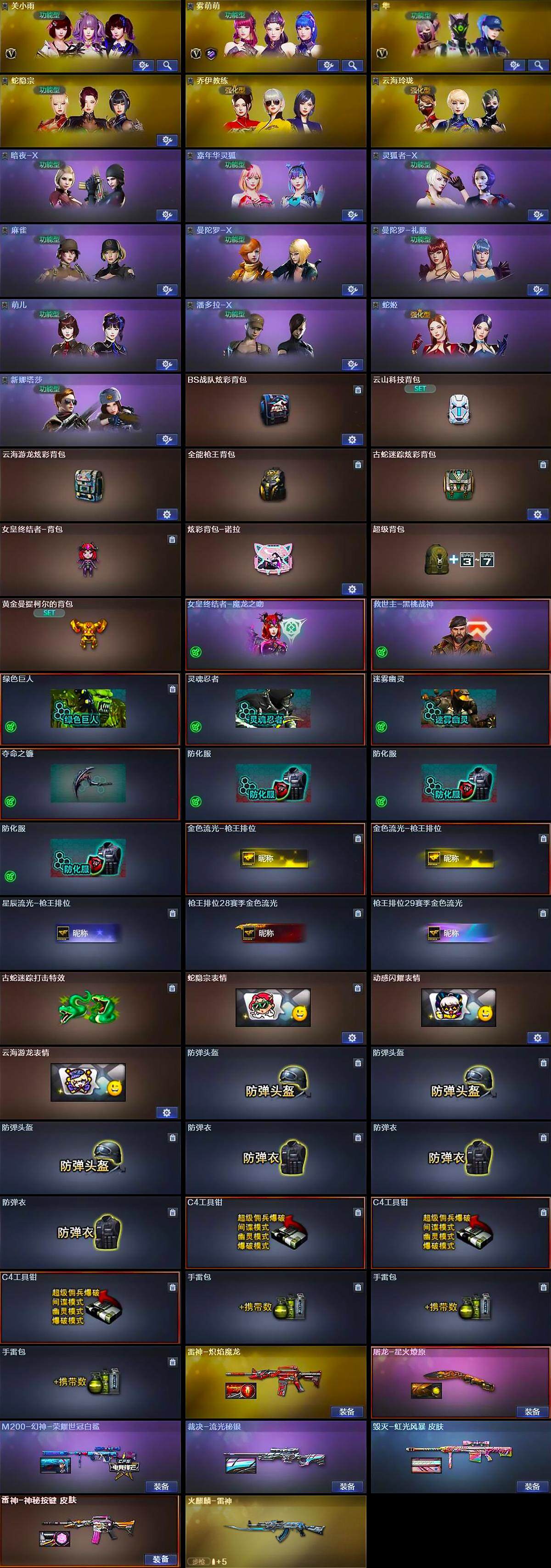 【道具】:BS战队炫彩背包,云山科技背包,云海游龙炫彩背包,全能枪王背包,古蛇迷踪炫彩背包,女皇终结者-背包,炫彩背包-诺拉,超级背包,黄金曼提柯尔的背包,女皇终结者-魔龙之吻,救世主-黑桃战神,绿色巨人,灵魂忍者,迷雾幽灵,夺命之镰,防化服*3,金色流光-枪王排位*2,星辰流光-枪王排位,枪王排位28赛季金色流光,枪王排位29赛季金色流光,古蛇迷踪打击特效,蛇隐宗表情,动感闪耀表情,云海游龙表情,防弹头盔*3,防弹衣*3,C4工具钳*3,手雷包*3