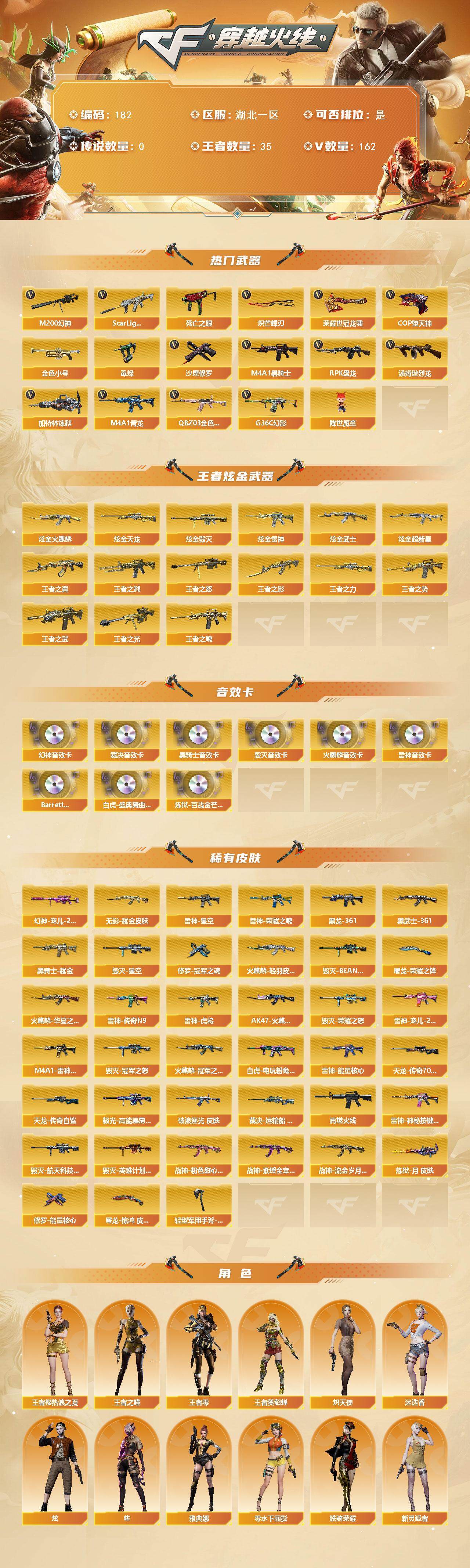 [13983090]湖北一区-162V-35王者-7炫金 【热门武器】:G36C-幻影,QBZ03-金色蔷薇,Scar Light-白虎,M4A1-青龙,M200-幻神*3,死亡之眼,金色小号,毒蜂,M4A1-黑骑士,汤姆逊-烈龙*6,RPK-盘龙*5,加特林-炼狱*6,降世魔童*2,COP-堕天神*3,沙鹰-修罗*2,炽芒蝶刃,荣耀世冠-龙啸 【王者炫金武器】:王者之戮,王者之翼,王者之势*2,王者之武,王者之影,王者之魄*3,王者之光,王者之怒*3,王者之力,炫金火麒麟,炫金雷神,炫金武士,炫金超新星,炫金毁灭,炫金天龙*2 【音效卡】:M200-幻神音效卡,AK47-火麒麟音效卡,M4A1-雷神音效卡,M4A1-黑骑士音效卡,Barrett-毁灭音效卡,AWM-裁决音效卡,Barrett-碧霄极光音效卡,白虎-盛典舞曲音效卡,炼狱-百战金芒-庆典舞曲音效卡 【皮肤】:幻神-宠儿-2021MVP,白虎-电玩粉兔皮肤,金色蔷薇-破浪逐光 皮肤,裁决-运输船 皮肤,雷神-能量核心,雷神-荣耀之魄,雷神-星空,M4A1-雷神-CFS 2019,雷神-虎将,雷神-传奇N9,雷神-宠儿-2019MVP,M4A1-再燃火线,雷神-神秘按键 皮肤,火麒麟-冠军之心,火麒麟-华夏之心,AK47-火麒麟-传奇EVEN,火麒麟-轻羽皮肤,毁灭-荣耀之怒*2,毁灭-星空,毁灭-冠军之怒,毁灭-BEAN-2020MVP,毁灭-航天科技皮肤,毁灭-英雄计划 皮肤,M4A1-黑龙-361,黑骑士耀金皮肤,无影耀金皮肤,AK47-黑武士-361,战神-粉色甜心皮肤,战神-紫绶金章皮肤,战神-流金岁月皮肤,AWM-天龙-传奇70KG,AWM-天龙-传奇白鲨*4,极光-高能霹雳 皮肤,炼狱-月 皮肤,修罗-能量核心,修罗-冠军之魂*2,屠龙-荣耀之锋*5,屠龙-惊鸿 皮肤,轻型军用手斧-再燃火线 【角色】:炫,迷迭香,隼,玄豹,战地猎狐,王者樱-热浪之夏,王者-葵-貂蝉,王者-零,王者之瞳,奇洋探员,乔伊教练,修道士,炽天使,空,初恋灵狐,电竞少女,飞虎队-X,嘉年华灵狐,兰-海滩派对,兰妹妹,零-水下丽影,潘多拉-甜心教官,铁骑荣耀,新灵狐者,影武者-X,雅典娜 【人偶武器】:M4A1-雷神-精英刀锋,异变清道夫-蛇影双骄,巴雷特-零-水下丽影,M37-葵,COP-旗袍,迷你生化手雷*2,生化手雷-机甲核心*3