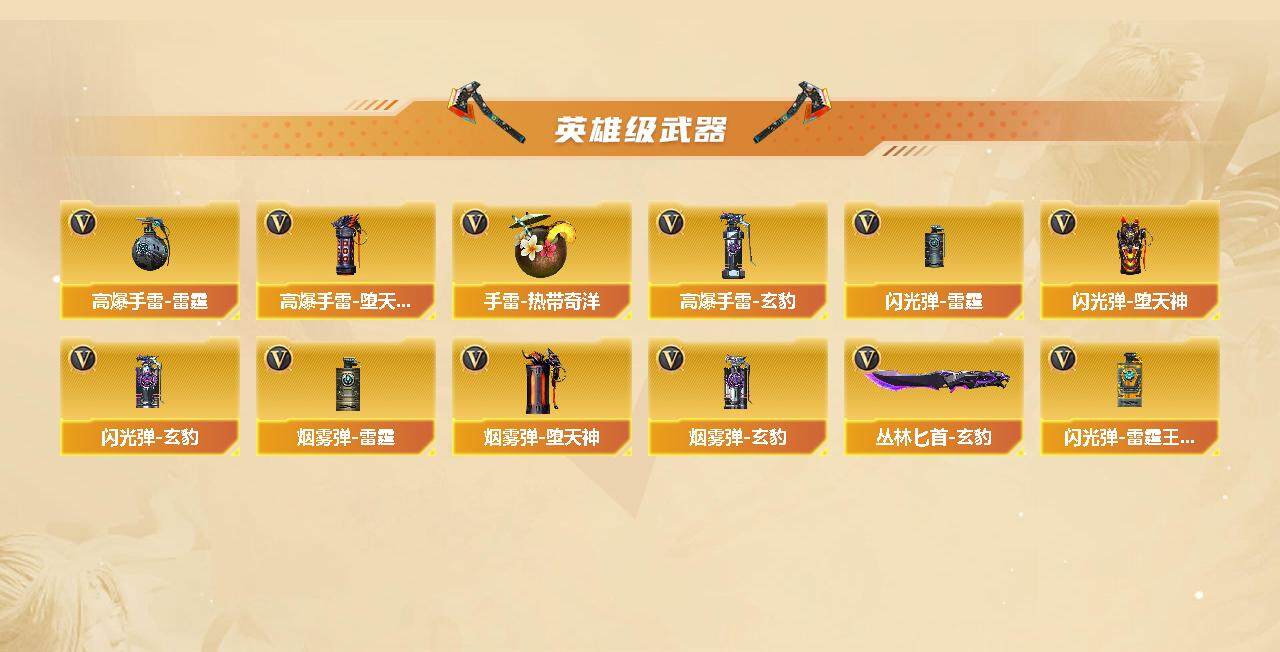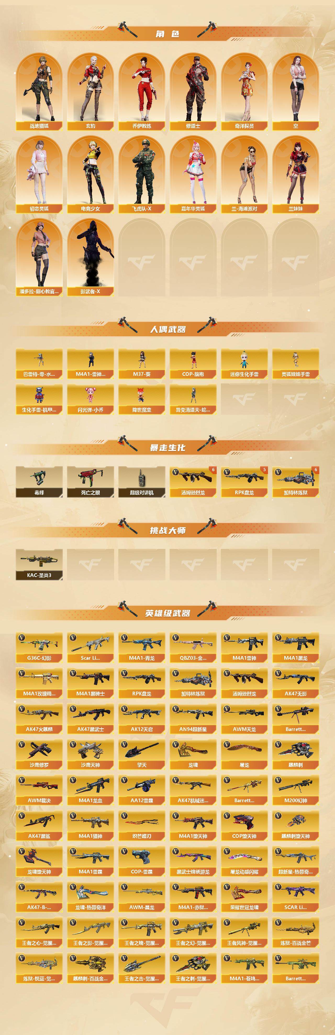 【热门武器】:G36C-幻影,QBZ03-金色蔷薇,Scar Light-白虎,M4A1-青龙,M200-幻神*3,死亡之眼,金色小号,毒蜂,M4A1-黑骑士,汤姆逊-烈龙*6,RPK-盘龙*5,加特林-炼狱*6,降世魔童*2,COP-堕天神*3,沙鹰-修罗*2,炽芒蝶刃,荣耀世冠-龙啸