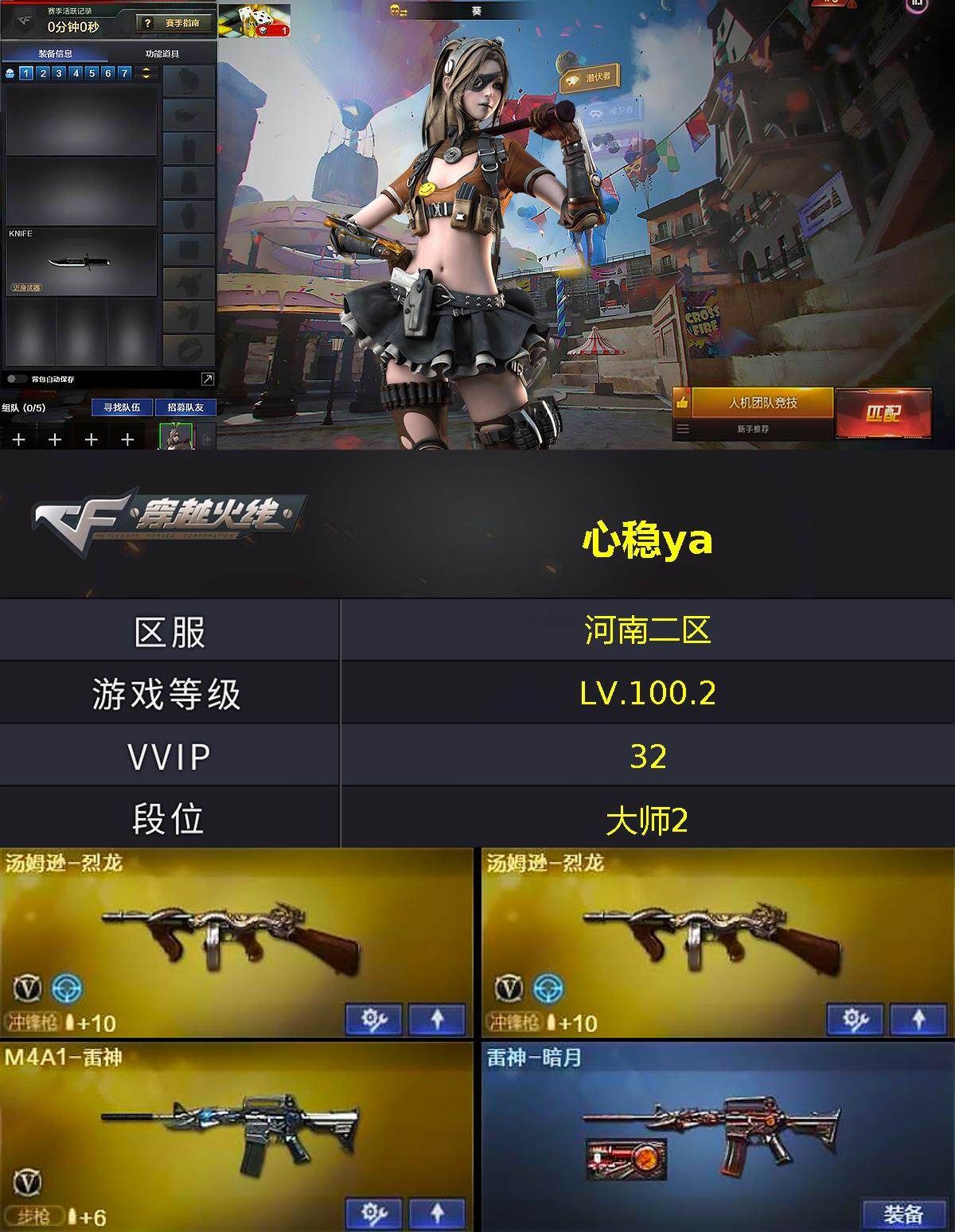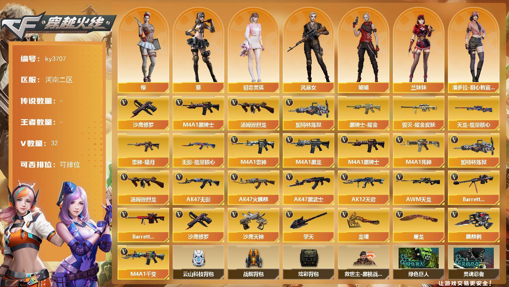 [13983500]河南二区-32V-0王者-0炫金 【热门武器】:M4A1-黑骑士,汤姆逊-烈龙*2,加特林-炼狱,沙鹰-修罗*5 【皮肤】:雷神-暗月,毁灭耀金皮肤,黑骑士耀金皮肤,无影-能量核心,天龙-能量核心 【角色】:葵,樱,初恋灵狐,风暴女,娟娟,兰妹妹,潘多拉-甜心教官,雪莉杨-摸金校尉 【英雄级武器】:M4A1-千变,AK47-火麒麟,M4A1-黑龙,M4A1-雷神,M4A1-黑骑士,AK47-无影,M4A1-死神,AK47-黑武士,AK12-天启,AWM-天龙,Barrett-毁灭,Barrett-极光,加特林-炼狱,汤姆逊-烈龙*2,沙鹰-修罗*5,沙鹰-天神*2,屠龙*3,龙啸*2,擎天,麒麟刺 【道具】:云山科技背包,战舰背包,炫彩背包,救世主-黑桃战神,绿色巨人,灵魂忍者,迷雾幽灵,夺命之镰,防化服*3,流光-鎏金之域,流光-再燃火线,防弹头盔*3,防弹衣*3,C4工具钳*3,手雷包*3 【特殊枪械】:1黑骑士,2烈龙,1炼狱