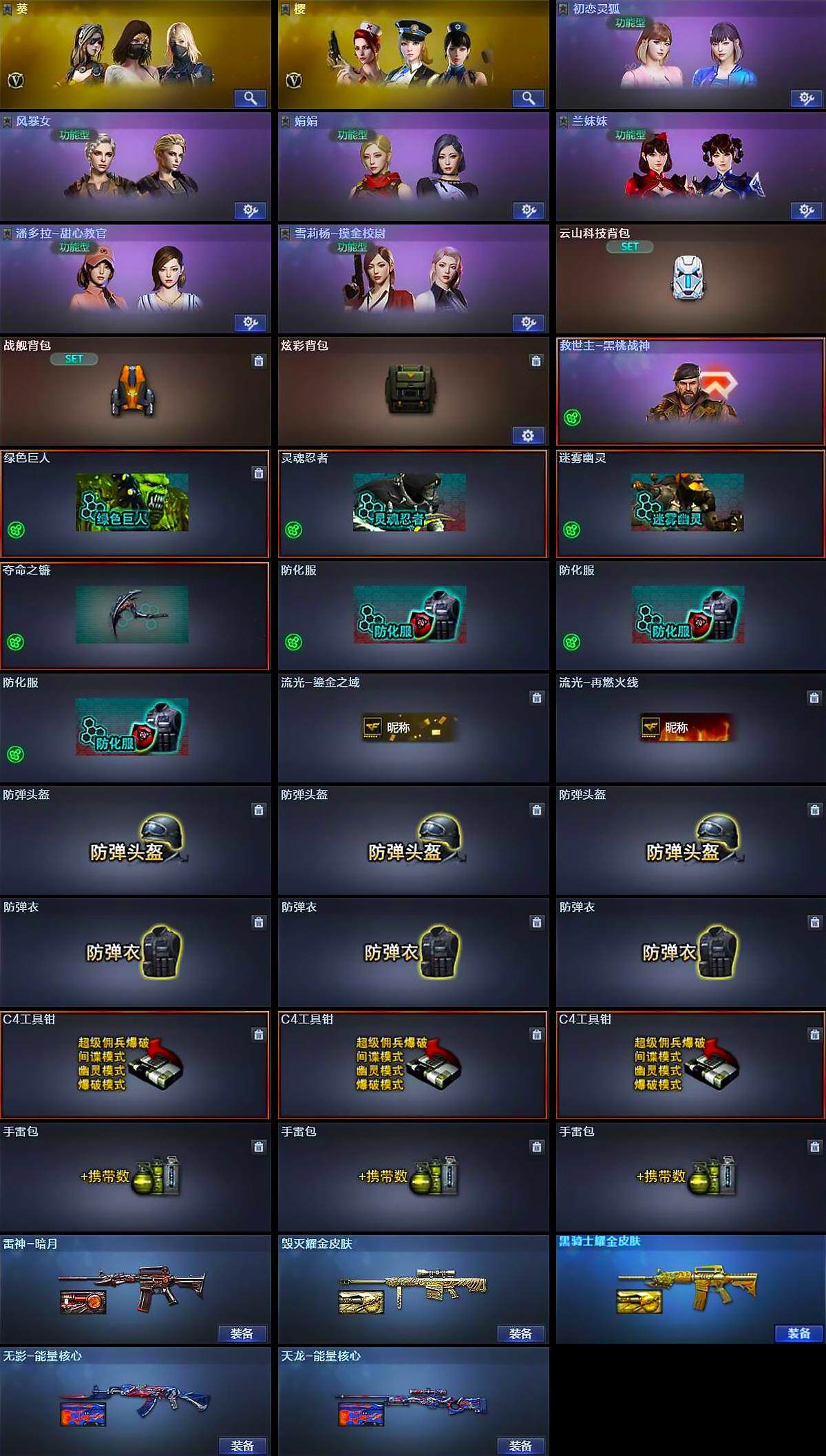 【道具】:云山科技背包,战舰背包,炫彩背包,救世主-黑桃战神,绿色巨人,灵魂忍者,迷雾幽灵,夺命之镰,防化服*3,流光-鎏金之域,流光-再燃火线,防弹头盔*3,防弹衣*3,C4工具钳*3,手雷包*3