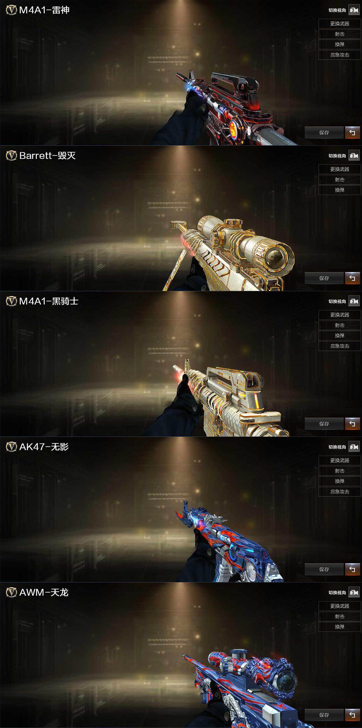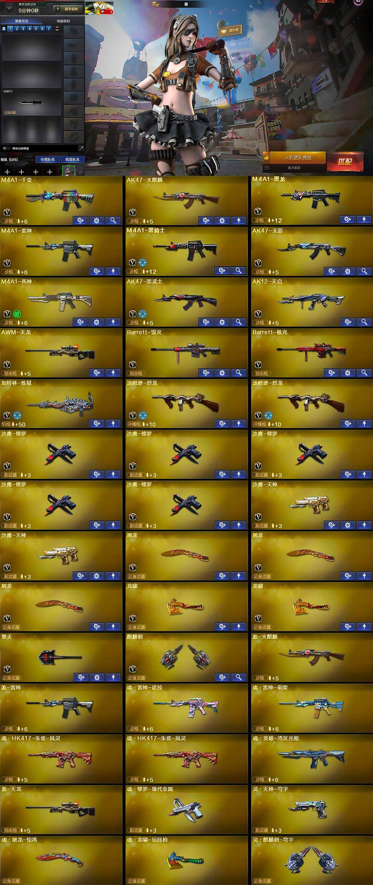 【英雄级武器】:M4A1-千变,AK47-火麒麟,M4A1-黑龙,M4A1-雷神,M4A1-黑骑士,AK47-无影,M4A1-死神,AK47-黑武士,AK12-天启,AWM-天龙,Barrett-毁灭,Barrett-极光,加特林-炼狱,汤姆逊-烈龙*2,沙鹰-修罗*5,沙鹰-天神*2,屠龙*3,龙啸*2,擎天,麒麟刺