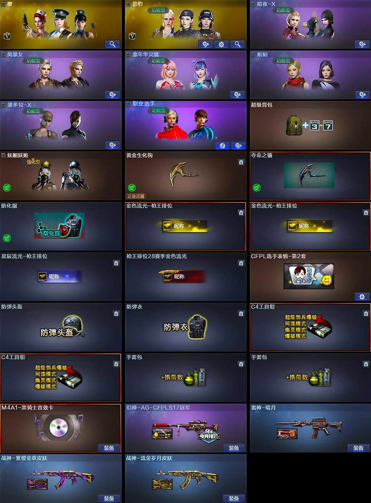 【道具】:超级背包,妩媚妖姬,黄金生化钩,夺命之镰,防化服,金色流光-枪王排位*2,星辰流光-枪王排位,枪王排位28赛季金色流光,CFPL选手表情-第2套,防弹头盔,防弹衣,C4工具钳*2,手雷包*2