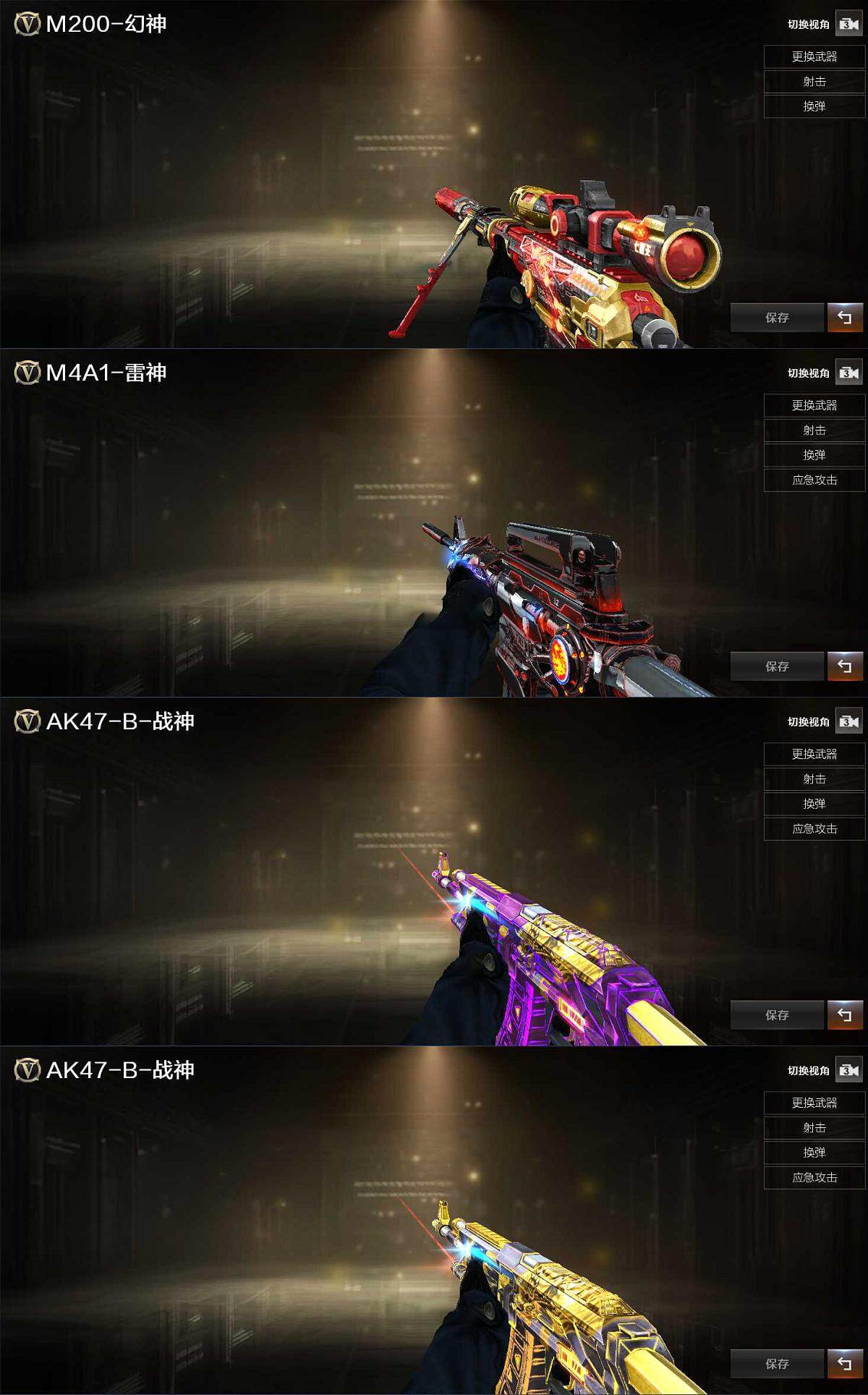 【皮肤】:幻神-AG-CFPLS17冠军,雷神-暗月,战神-紫绶金章皮肤,战神-流金岁月皮肤,AK47-B-常胜将军-曹操,AK47-B-常胜将军-刘备