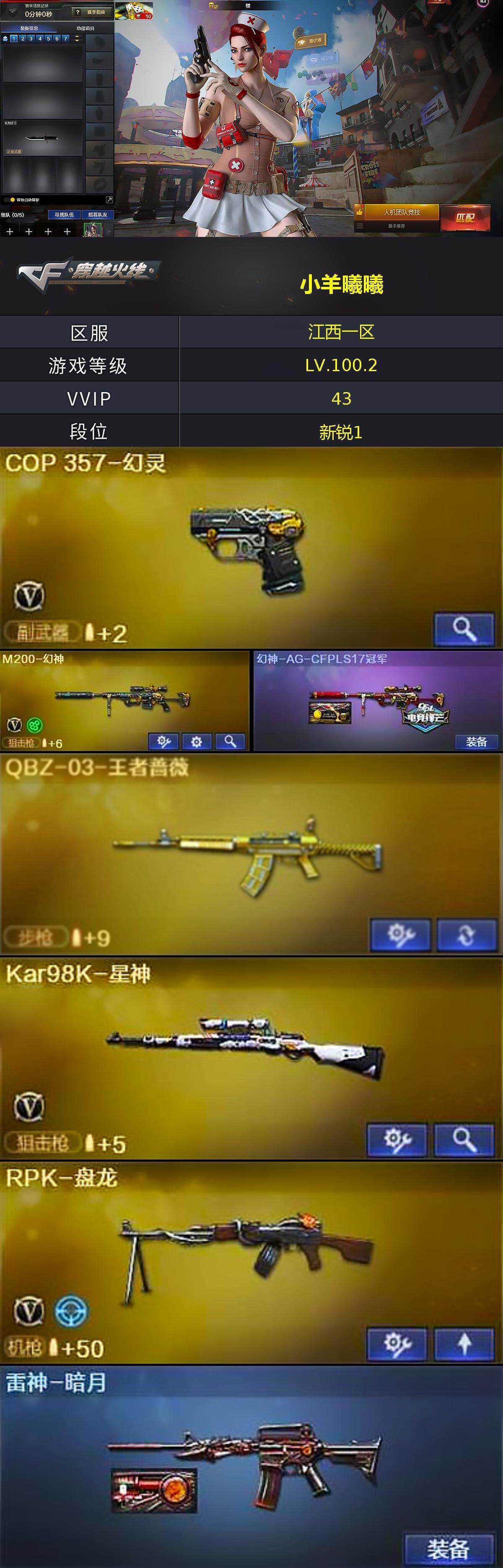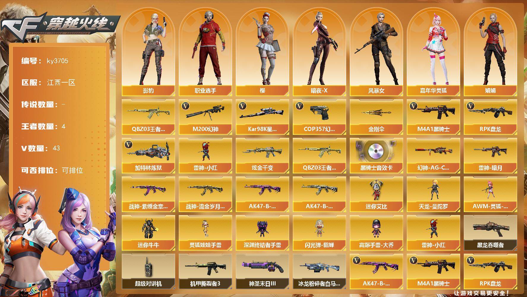 [13983749]江西一区-43V-4王者-1炫金 【热门武器】:M200-幻神,QBZ-03-王者蔷薇,Kar98K-星神,M4A1-黑骑士,RPK-盘龙,加特林-炼狱,雷神-小红,COP 357-幻灵,金刚伞 【王者炫金武器】:QBZ-03-王者蔷薇,炫金千变 【音效卡】:M4A1-黑骑士音效卡 【皮肤】:幻神-AG-CFPLS17冠军,雷神-暗月,战神-紫绶金章皮肤,战神-流金岁月皮肤,AK47-B-常胜将军-曹操,AK47-B-常胜将军-刘备 【角色】:樱,影豹,暗夜-X,风暴女,嘉年华灵狐,娟娟,潘多拉-X,职业选手 【人偶武器】:雷神-小红,天龙-曼陀罗,AWM-灵狐-15周年嘉年华,迷你牛牛,深渊终结者手雷,闪光弹-貂蝉,高爆手雷-大乔,迷你艾比,灵狐娃娃手雷 【暴走生化】:黑龙吞噬者,超级对讲机 【挑战大师】:冰龙粉碎者-白马银枪,机甲撕裂者III,神圣爆裂者-末日III*4 【英雄级武器】:M4A1-黑骑士,M4A1-幻灵,无影-神兵利器,王者之势-觉醒版,AK-47-猩红传说,黑骑士-海王,AK47-B-常胜将军,Barrett-毁灭,M200-幻神,Barrett-朱雀,Kar98K-星神,RPK-盘龙,加特林-炼狱,COP 357-幻灵,屠龙*3,龙啸,幻灵之锋,王者之锋-觉醒版,王者之啸-觉醒版,高爆手雷-幻灵*6,闪光弹-幻灵*6,烟雾弹-幻灵*6,烟雾弹-竞技荣光 【道具】:超级背包,妩媚妖姬,黄金生化钩,夺命之镰,防化服,金色流光-枪王排位*2,星辰流光-枪王排位,枪王排位28赛季金色流光,CFPL选手表情-第2套,防弹头盔,防弹衣,C4工具钳*2,手雷包*2 【特殊枪械】:1黑骑士,1盘龙,1炼狱