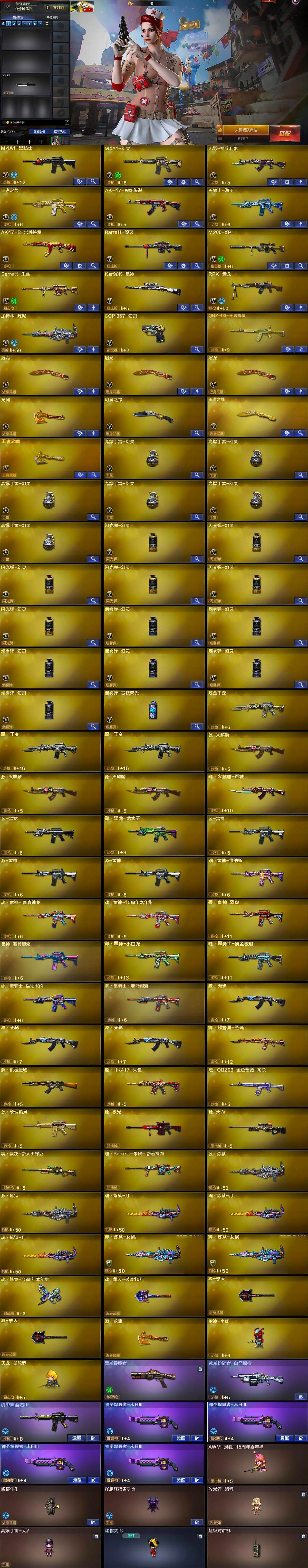 【英雄级武器】:M4A1-黑骑士,M4A1-幻灵,无影-神兵利器,王者之势-觉醒版,AK-47-猩红传说,黑骑士-海王,AK47-B-常胜将军,Barrett-毁灭,M200-幻神,Barrett-朱雀,Kar98K-星神,RPK-盘龙,加特林-炼狱,COP 357-幻灵,屠龙*3,龙啸,幻灵之锋,王者之锋-觉醒版,王者之啸-觉醒版,高爆手雷-幻灵*6,闪光弹-幻灵*6,烟雾弹-幻灵*6,烟雾弹-竞技荣光