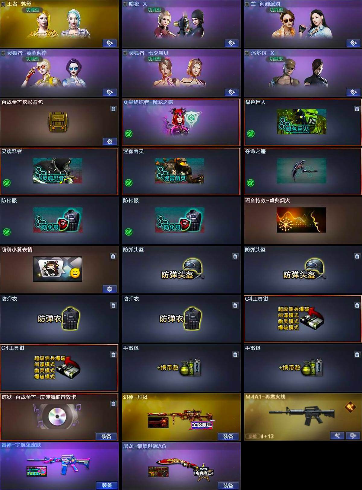 【道具】:百战金芒炫彩背包,女皇终结者-魔龙之吻,绿色巨人,灵魂忍者,迷雾幽灵,夺命之镰,防化服*2,语音特效-盛典烟火,萌萌小葵表情,防弹头盔*2,防弹衣*2,C4工具钳*2,手雷包*2