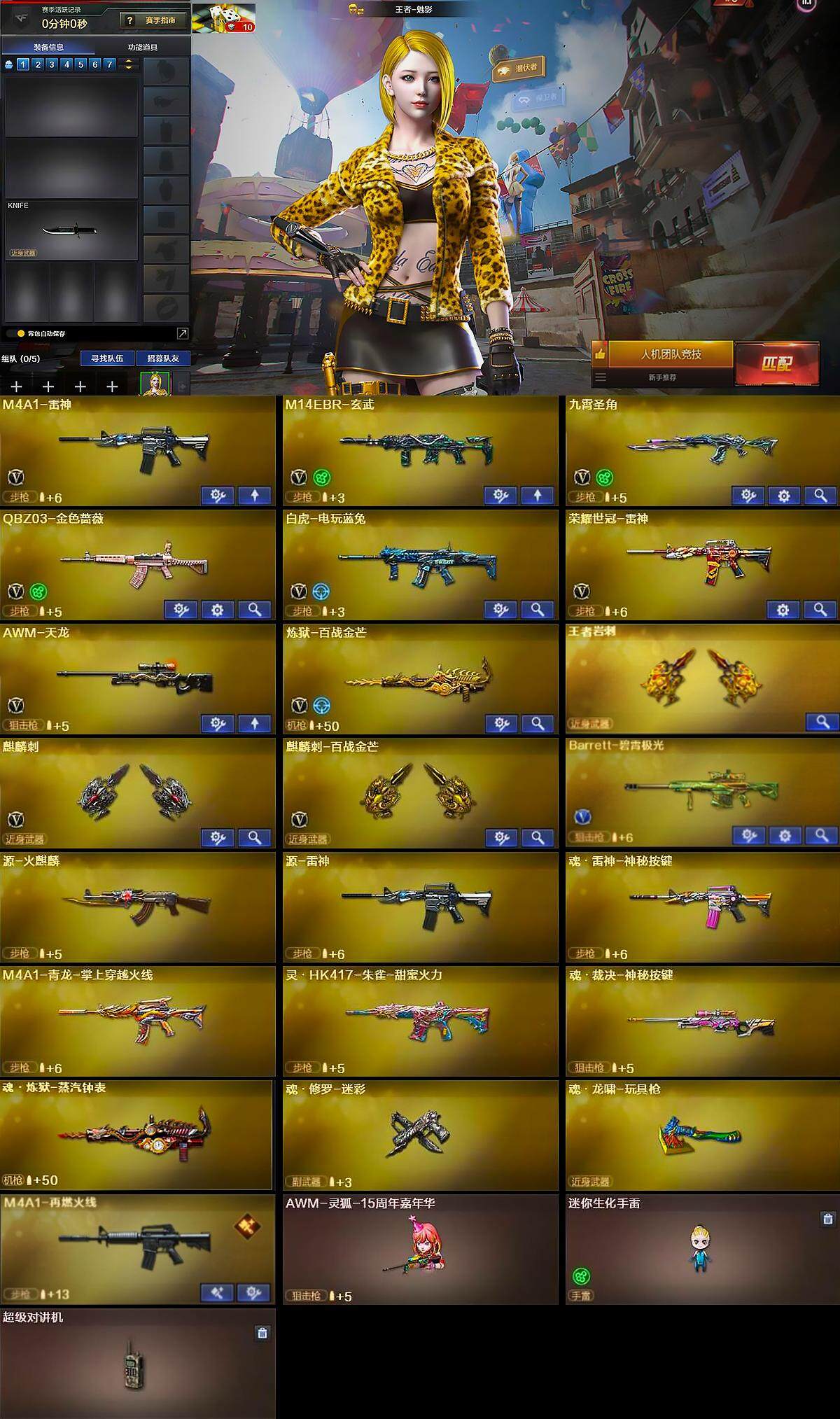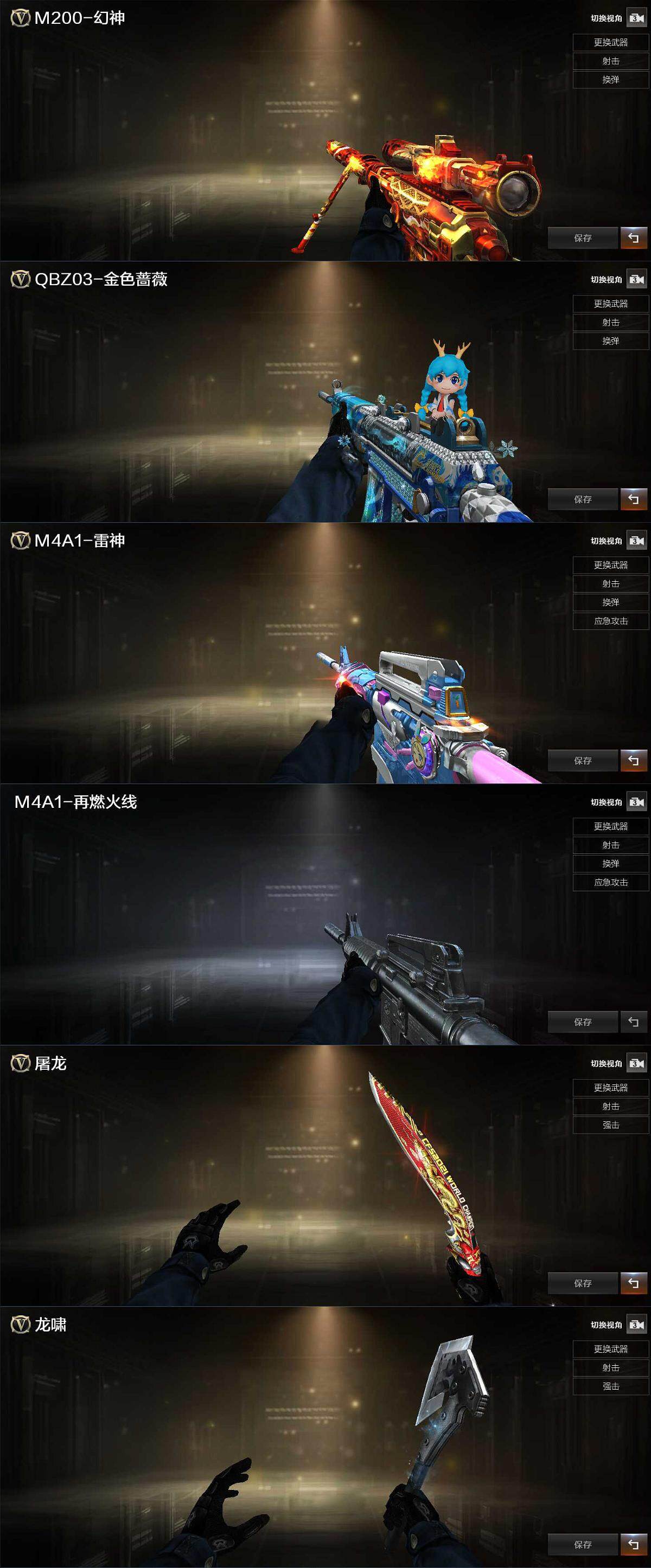 【英雄级武器】:M4A1-雷神,M14EBR-玄武,九霄圣角,QBZ03-金色蔷薇,白虎-电玩蓝兔,荣耀世冠-雷神,AWM-天龙,炼狱-百战金芒,柯尔特-荣耀世冠EP*2,麒麟刺,麒麟刺-百战金芒,烟雾弹-荣耀世冠EP*3,Barrett-碧霄极光