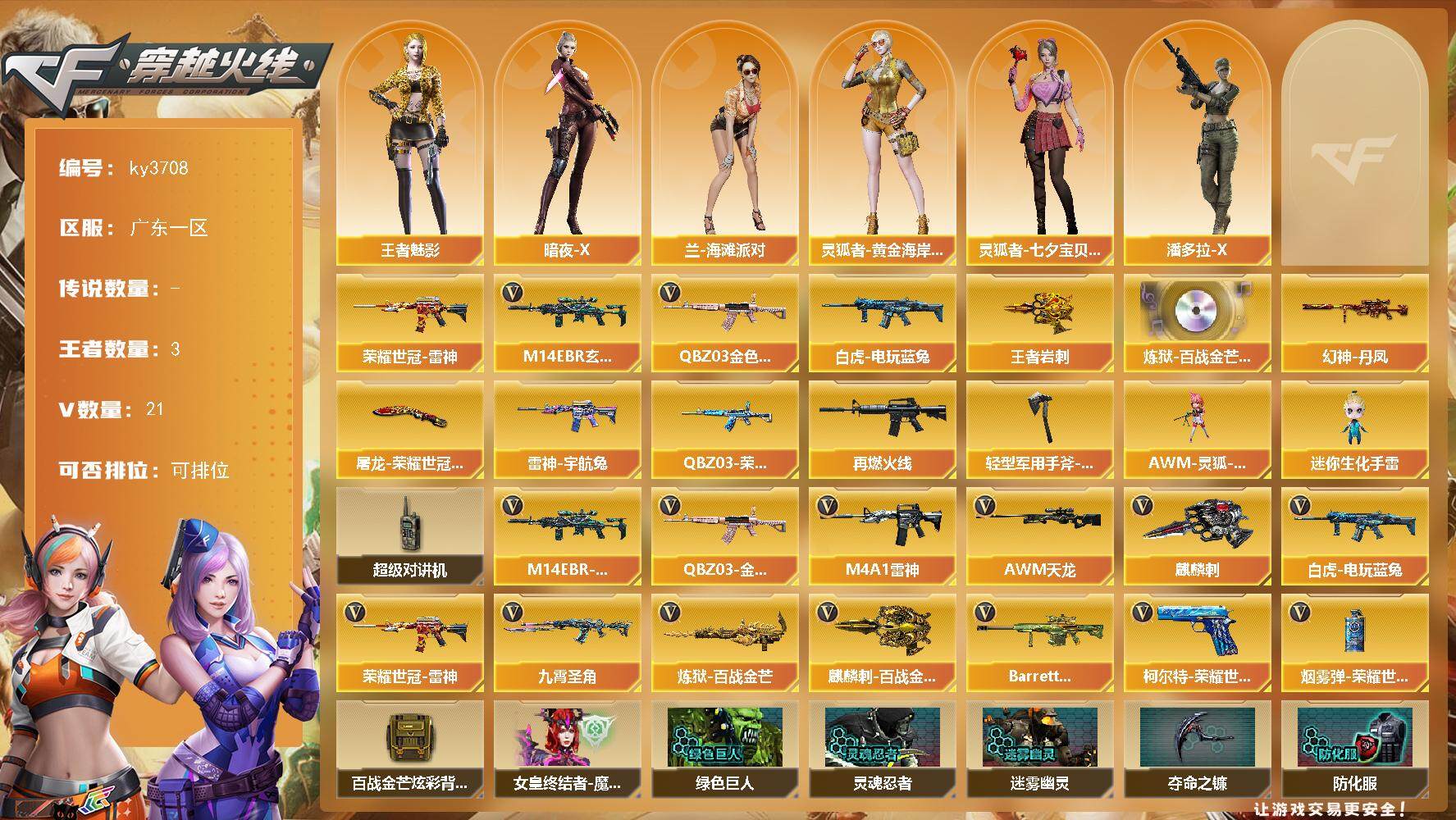 [13983861]广东一区-21V-3王者-0炫金 【热门武器】:QBZ03-金色蔷薇,M14EBR-玄武,荣耀世冠-雷神,白虎-电玩蓝兔 【王者炫金武器】:王者岩刺 【音效卡】:炼狱-百战金芒-庆典舞曲音效卡 【皮肤】:幻神-丹凤,QBZ03-荣耀世冠EP 皮肤,雷神-宇航兔皮肤,M4A1-再燃火线,屠龙-荣耀世冠AG,轻型军用手斧-再燃火线 【角色】:王者-魅影,暗夜-X,兰-海滩派对,灵狐者-黄金海岸,灵狐者-七夕宝贝,潘多拉-X 【人偶武器】:AWM-灵狐-15周年嘉年华,迷你生化手雷 【暴走生化】:超级对讲机 【英雄级武器】:M4A1-雷神,M14EBR-玄武,九霄圣角,QBZ03-金色蔷薇,白虎-电玩蓝兔,荣耀世冠-雷神,AWM-天龙,炼狱-百战金芒,柯尔特-荣耀世冠EP*2,麒麟刺,麒麟刺-百战金芒,烟雾弹-荣耀世冠EP*3,Barrett-碧霄极光 【道具】:百战金芒炫彩背包,女皇终结者-魔龙之吻,绿色巨人,灵魂忍者,迷雾幽灵,夺命之镰,防化服*2,语音特效-盛典烟火,萌萌小葵表情,防弹头盔*2,防弹衣*2,C4工具钳*2,手雷包*2 【特殊枪械】: