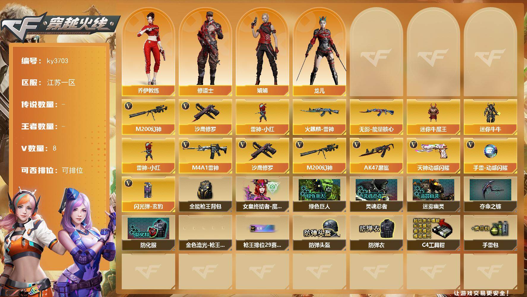 [13983975]江苏一区-8V-0王者-0炫金 【热门武器】:M200-幻神,雷神-小红,沙鹰-修罗 【皮肤】:火麒麟-雷神,无影-能量核心 【角色】:乔伊教练,修道士,娟娟,龙儿 【人偶武器】:雷神-小红,迷你牛魔王,迷你牛牛 【英雄级武器】:M4A1-雷神,AK47-黑鲨,M200-幻神,沙鹰-修罗,天神-动感闪耀,手雷-动感闪耀,闪光弹-玄豹 【道具】:全能枪王背包,女皇终结者-魔龙之吻,绿色巨人,灵魂忍者,迷雾幽灵,夺命之镰,防化服*3,金色流光-枪王排位*2,星辰流光-枪王排位,枪王排位29赛季金色流光,防弹头盔*3,防弹衣*3,C4工具钳*3,手雷包*3 【特殊枪械】: