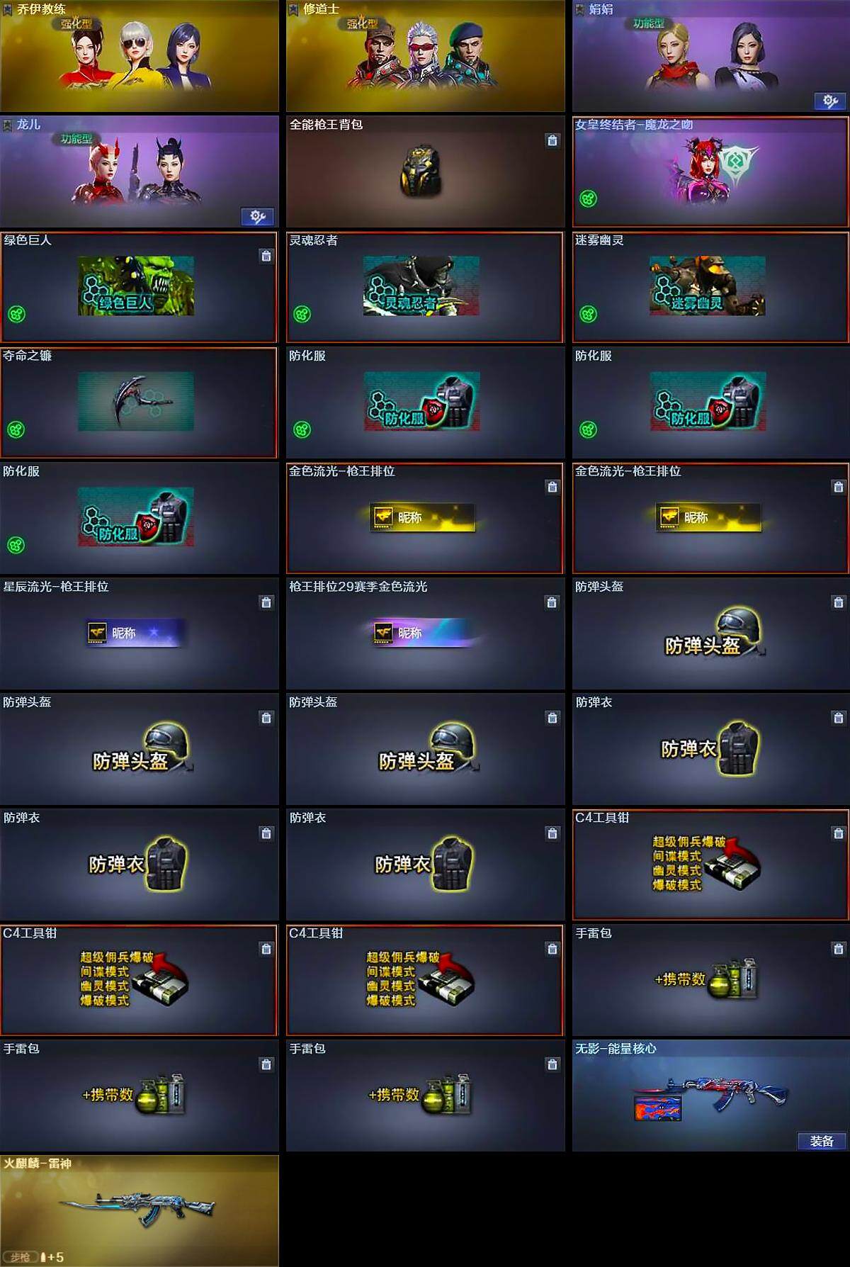 【道具】:全能枪王背包,女皇终结者-魔龙之吻,绿色巨人,灵魂忍者,迷雾幽灵,夺命之镰,防化服*3,金色流光-枪王排位*2,星辰流光-枪王排位,枪王排位29赛季金色流光,防弹头盔*3,防弹衣*3,C4工具钳*3,手雷包*3