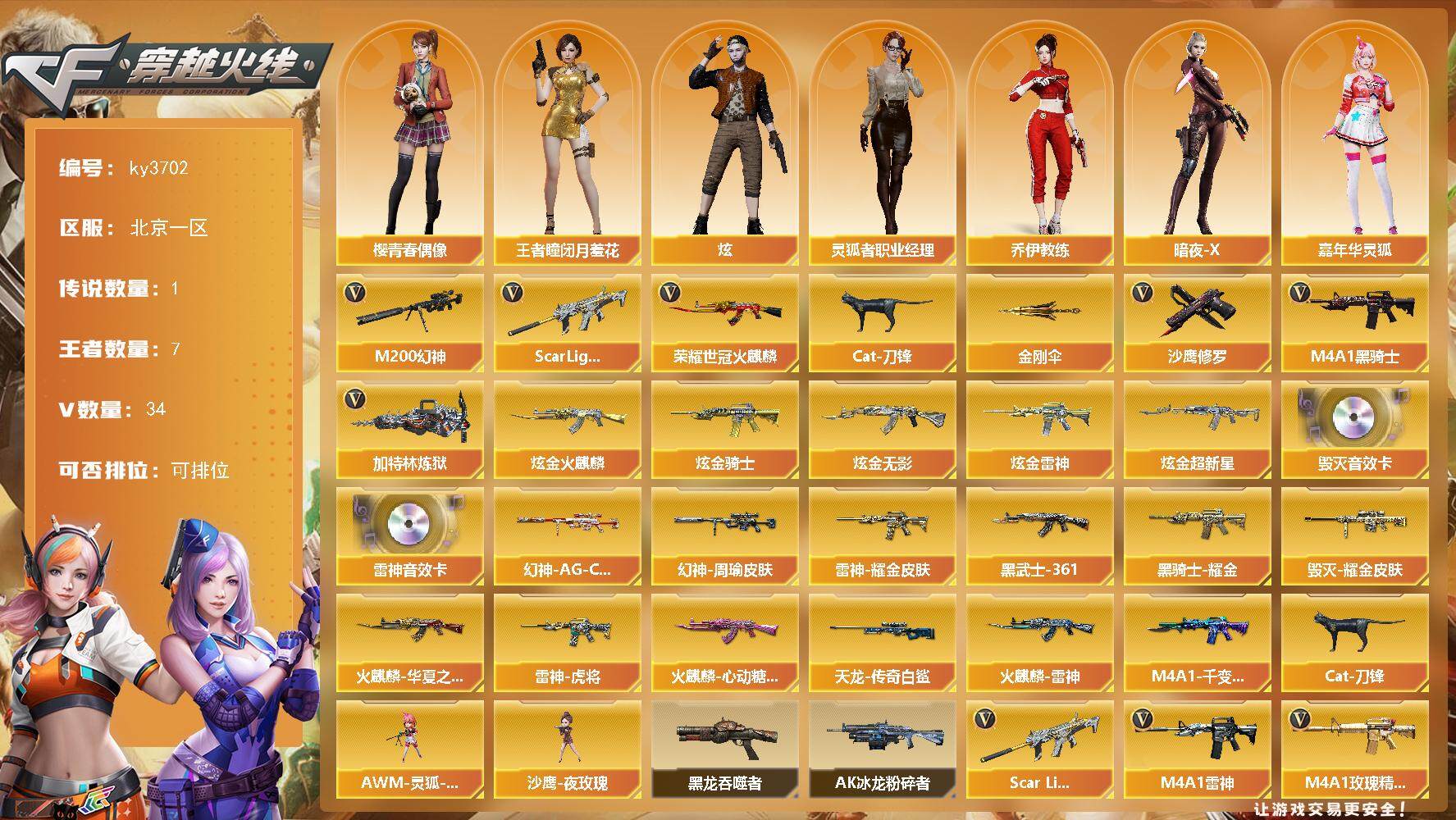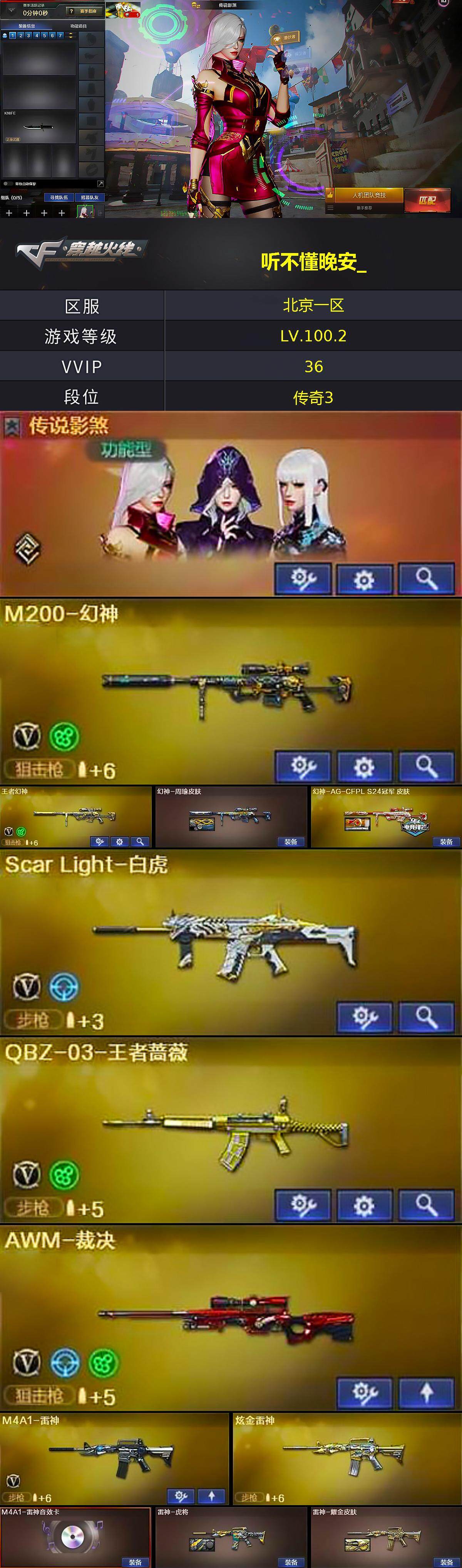 [13984055]北京一区-34V-7王者-5炫金 【传说角色】:传说影煞 【热门武器】:Scar Light-白虎,M200-幻神,荣耀世冠-火麒麟,Cat-刀锋,M4A1-黑骑士,加特林-炼狱,沙鹰-修罗,金刚伞 【王者炫金武器】:炫金火麒麟,炫金骑士,炫金无影,炫金雷神,炫金超新星 【音效卡】:M4A1-雷神音效卡,Barrett-毁灭音效卡 【皮肤】:幻神-周瑜皮肤,幻神-AG-CFPL S24冠军 皮肤,雷神-虎将,雷神-耀金皮肤,火麒麟-雷神,火麒麟-华夏之心,火麒麟-心动糖果,毁灭耀金皮肤,M4A1-千变-孔明皮肤,黑骑士耀金皮肤,AK47-黑武士-361,AWM-天龙-传奇白鲨 【角色】:炫,王者-瞳-闭月羞花,乔伊教练,暗夜-X,嘉年华灵狐,灵狐者-X,灵狐者-职业经理,麻雀,潘多拉-X,潘多拉-甜心教官,斯沃特-X,雪莉杨,樱-青春偶像,影武者-X 【人偶武器】:AWM-灵狐-15周年嘉年华*2,Cat-刀锋,沙鹰-夜玫瑰 【暴走生化】:黑龙吞噬者 【挑战大师】:AK47-冰龙粉碎者 【英雄级武器】:AK47-火麒麟,M4A1-雷神,M4A1-黑骑士,M4A1-死神,AN94-超新星,Scar Light-白虎,M4A1-玫瑰精灵,烈火-动感闪耀,QBZ-03-王者蔷薇-觉醒版,荣耀世冠-火麒麟,黑武士-CF网剧冠军,Barrett-毁灭,AWM-裁决,M200-幻神,王者幻神-觉醒版,加特林-炼狱,沙鹰-修罗,沙鹰-天神,天神-动感闪耀,天神-CF网剧冠军,屠龙*2,幻灵之锋,屠龙-动感闪耀,擎天-CF网剧冠军,高爆手雷-幻灵*2,手雷-动感闪耀,闪光弹-幻灵*3,闪光弹-雷霆王者-觉醒版,烟雾弹-幻灵*2,烟雾弹-雷霆王者-觉醒版 【道具】:BS战队炫彩背包,KZ战队炫彩背包,全能枪王背包,女皇终结者-魔龙之吻,绿色巨人,灵魂忍者,迷雾幽灵,夺命之镰,防化服*3,金色流光-枪王排位*2,星辰流光-枪王排位,枪王排位29赛季金色流光,动感闪耀表情,C4-黑曜,防弹头盔*6,防弹衣*6,C4工具钳*5,手雷包*5 【特殊枪械】:1白虎,1黑骑士,1炼狱